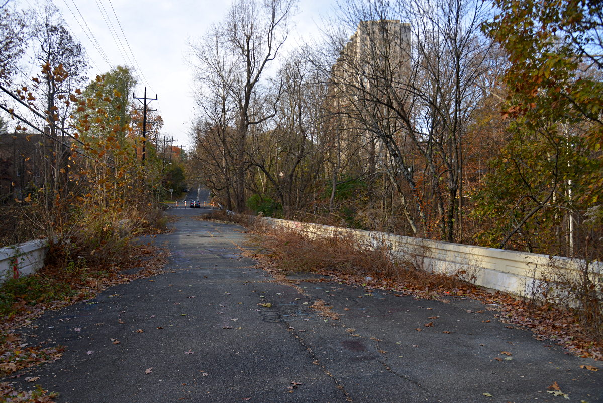 Lots of brush and small trees have taken root along the sides of the bridge, but there is enough of the road free to bike across it without trouble.