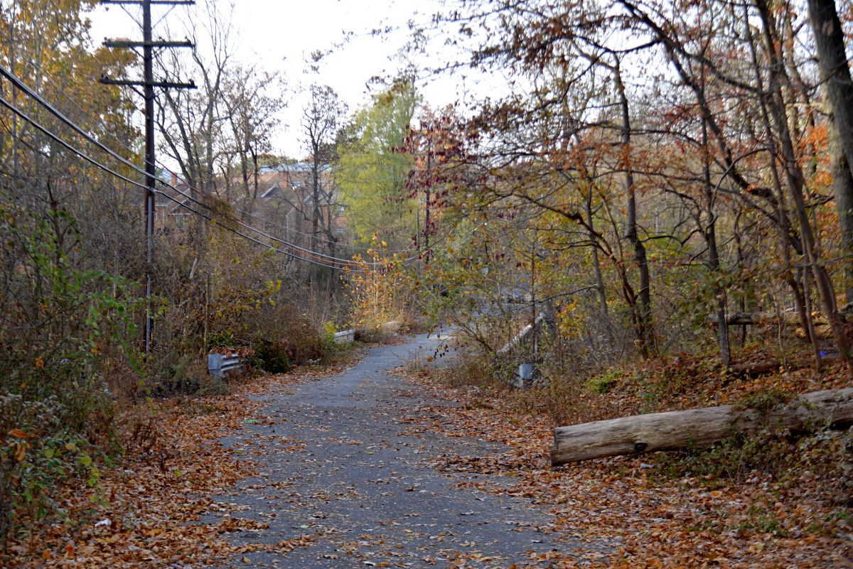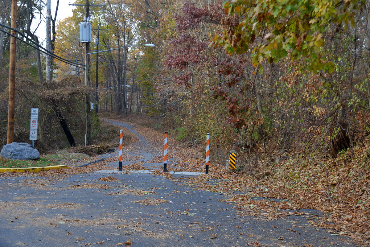 The road ends, but continues. This used to be a through road but now it is only accessible to bikes and people on foot.