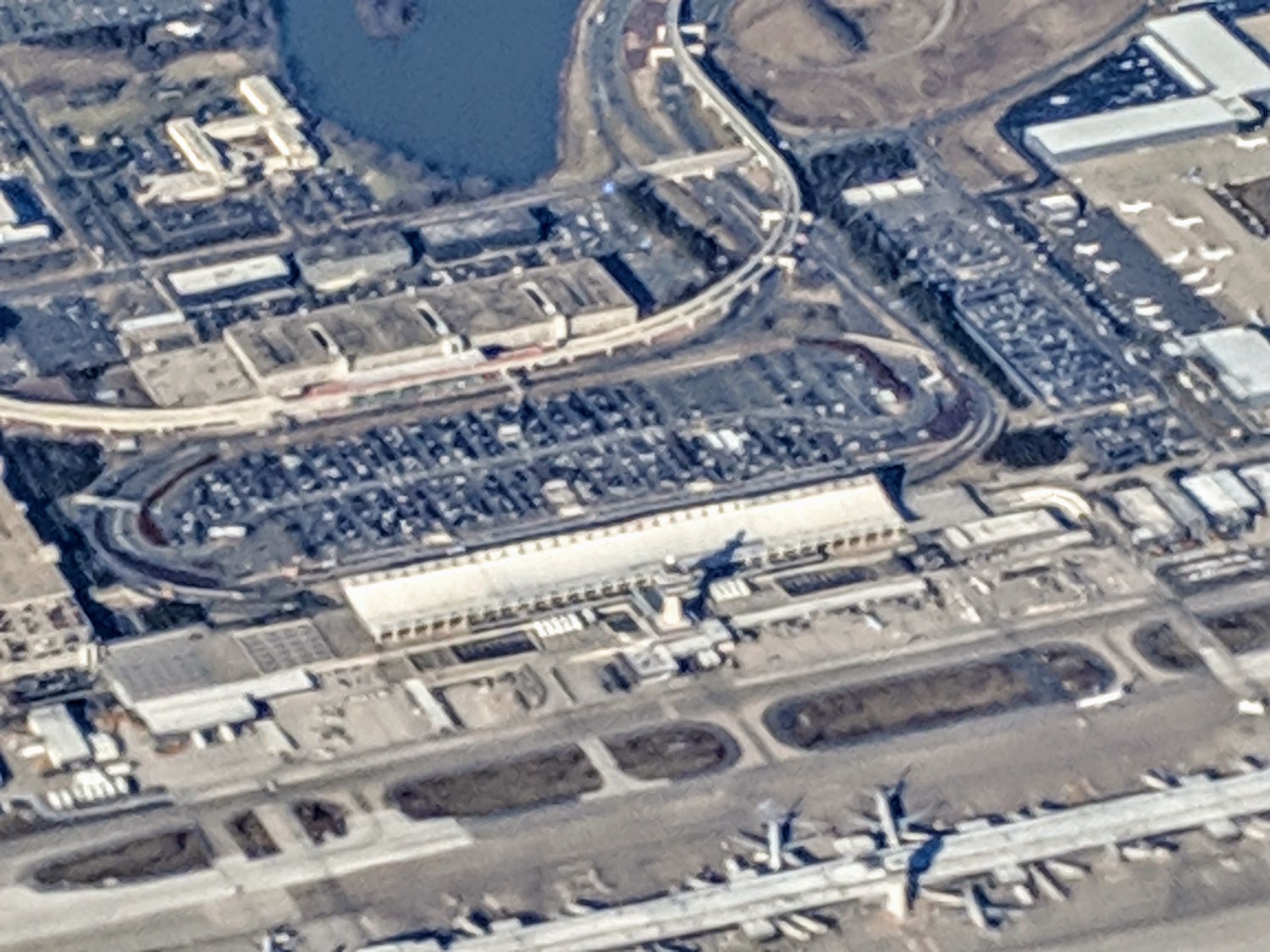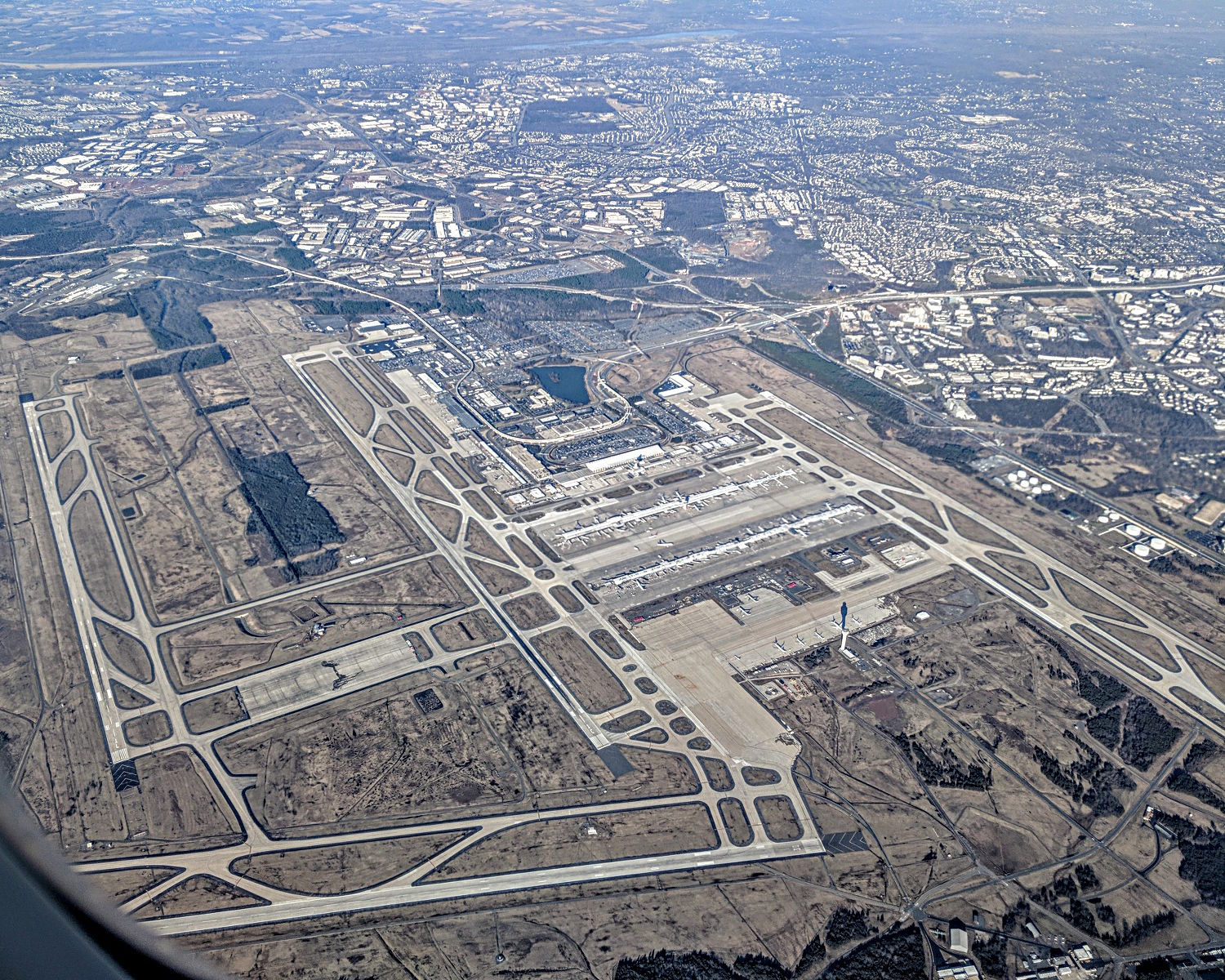 I always find it interesting when I fly over another airport. Recently I flew almost directly over Dulles International Airport outside of Washington DC and got a good view of it. Here you can see the runways on the left and right and the various terminal buildings in the center of the picture.