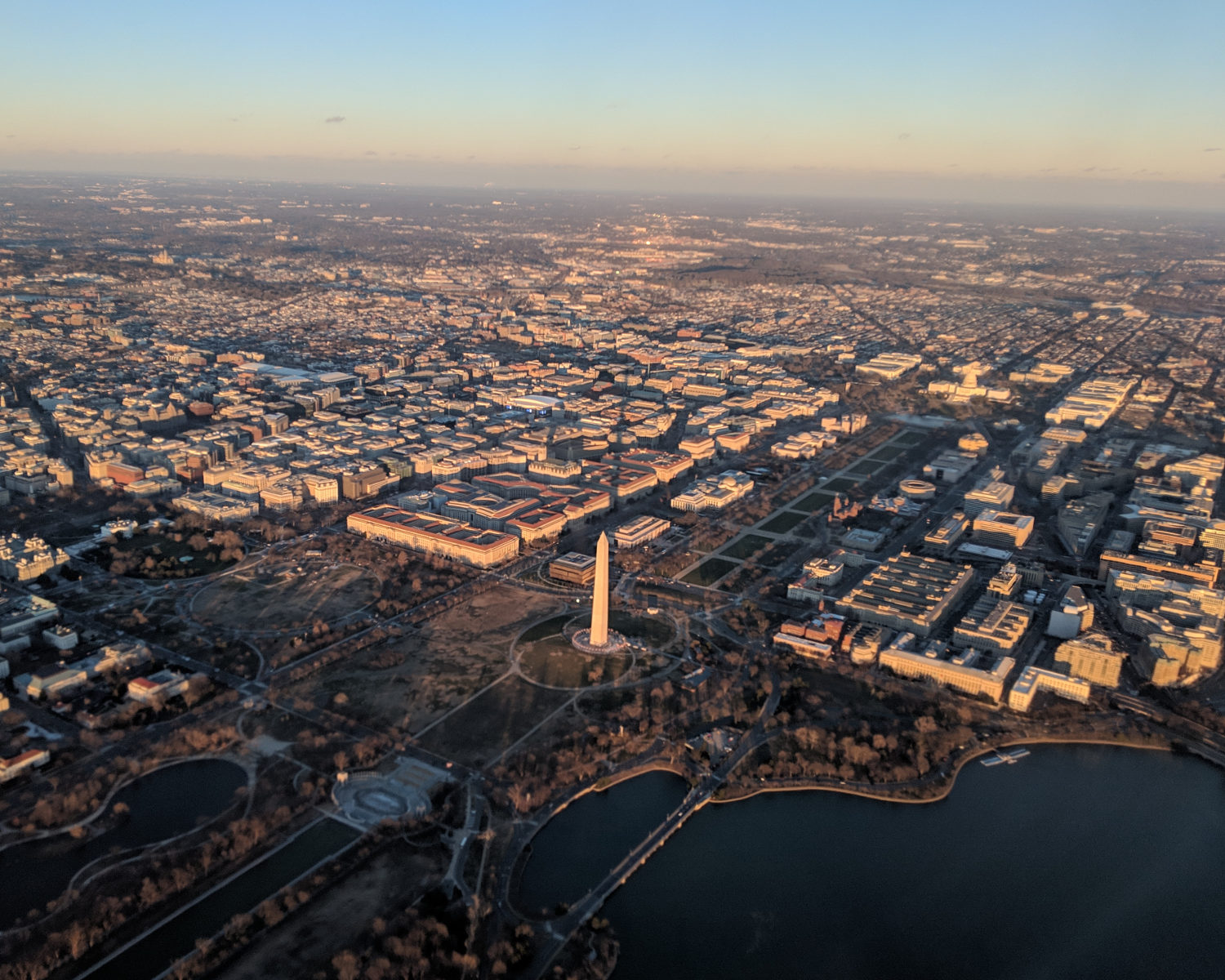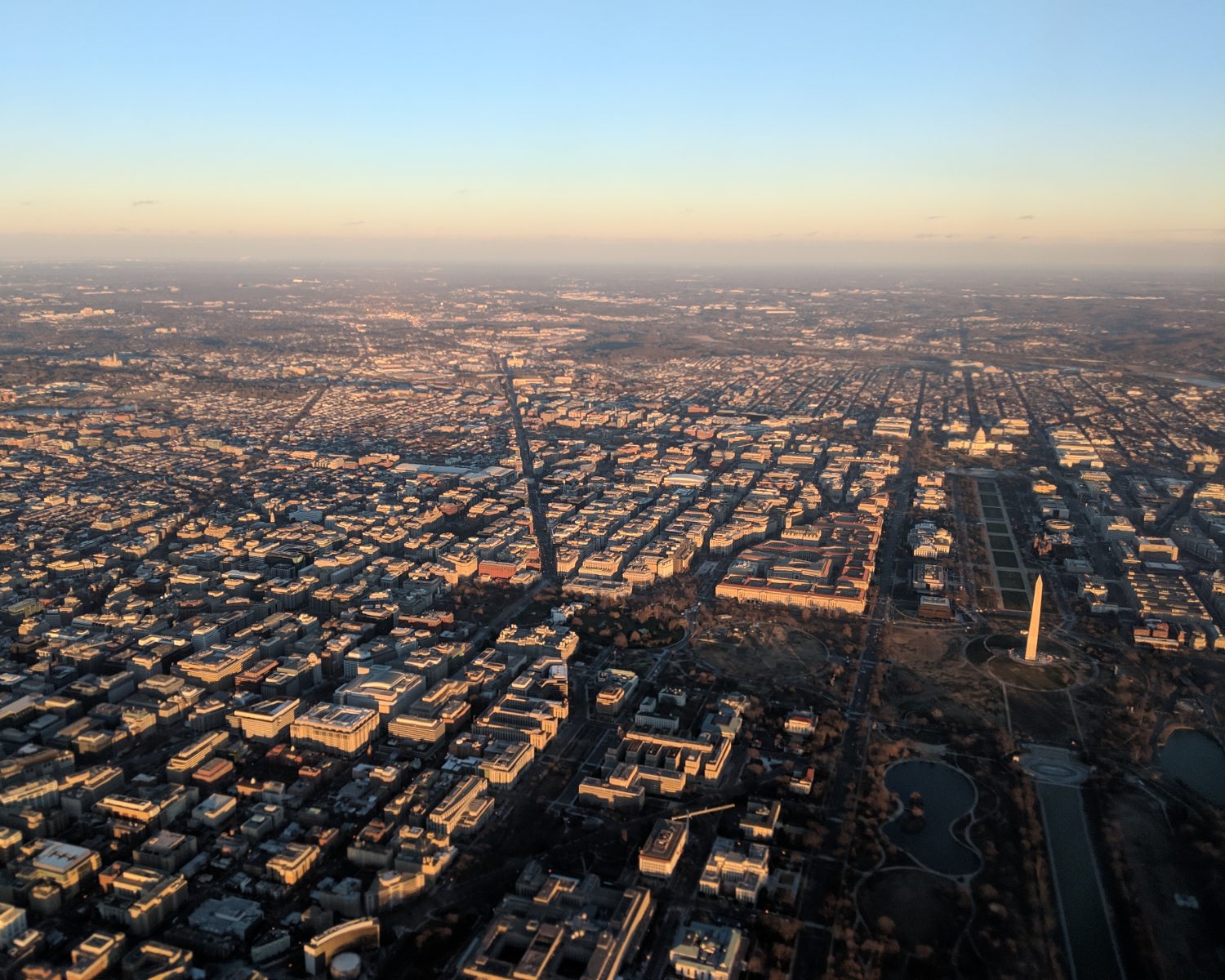 I had the opportunity to fly out of National Airport in Washington, DC right near sunset.. The sky was clear and the sun was reddish and casting long shadows. I got some pictures of downtown DC including the Washington Monument and the National Mall. In the above picture, you can see the Washington Monument in the center of the picture, the wide open area at 2 o'clock is the national mall with the US Capitol building at the far end. At 10 o'clock at the end of the open area is the White House.