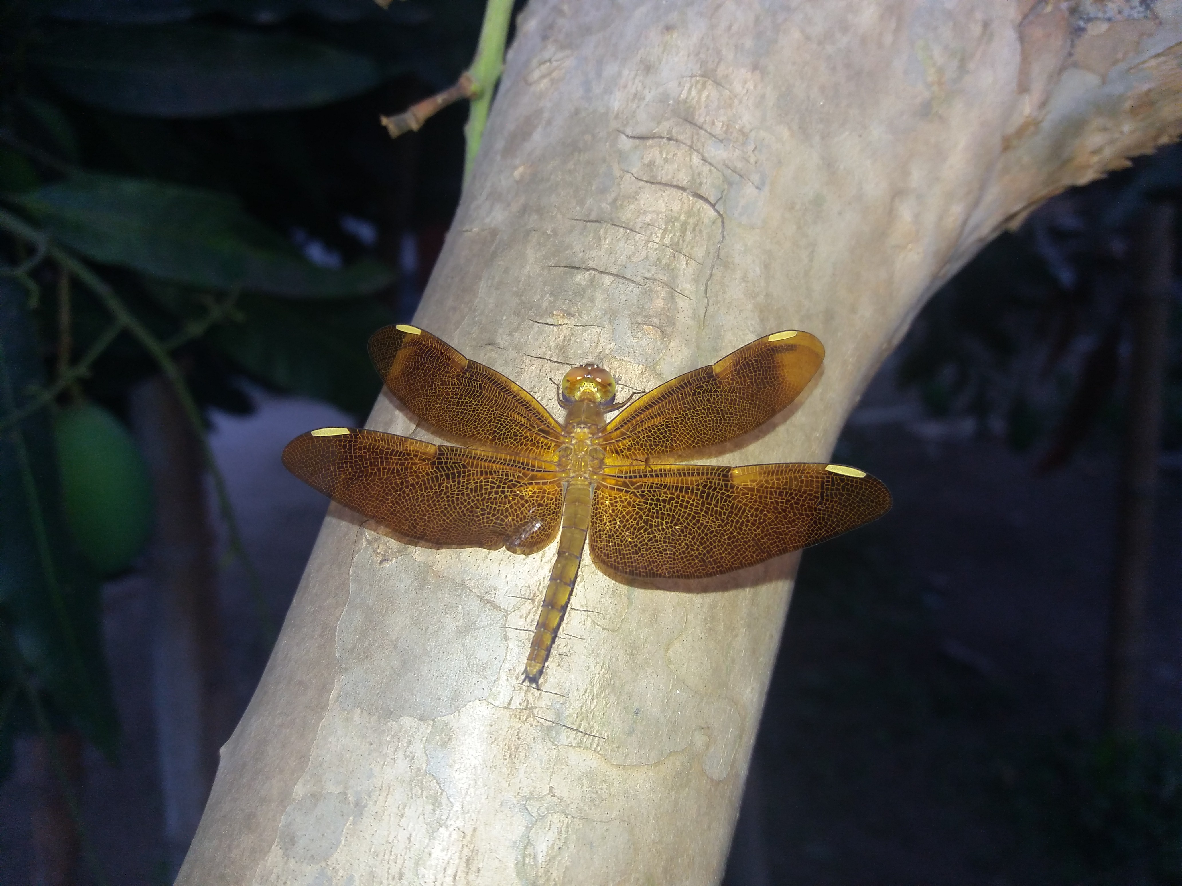 Today i take a photo of a grasshopper in my home at evening.The grasshopper was setting on a guava tree.I used my phone's flash & it resulted a very good photo of the grasshopper.It looks like a grasshopper made by golden