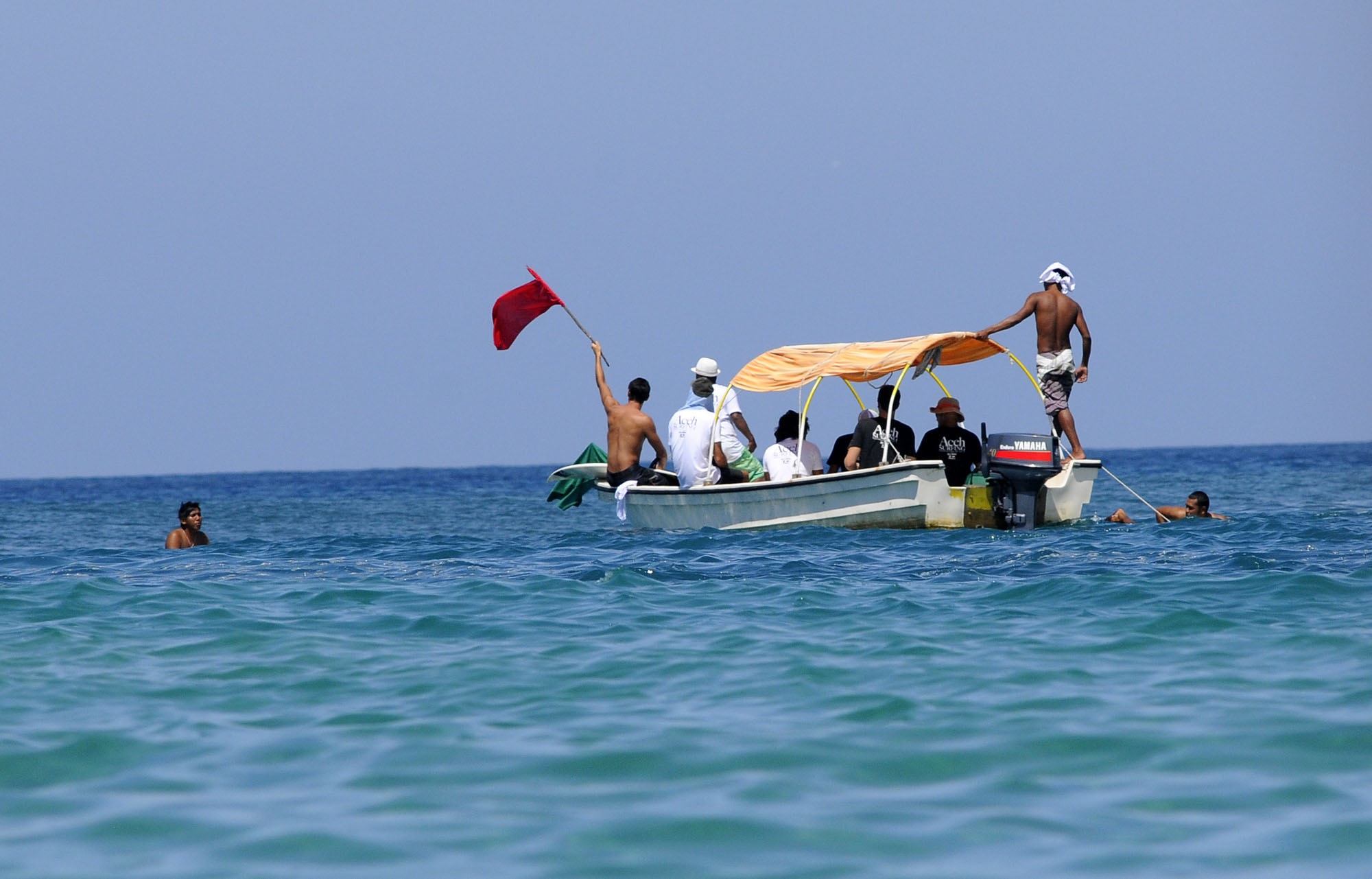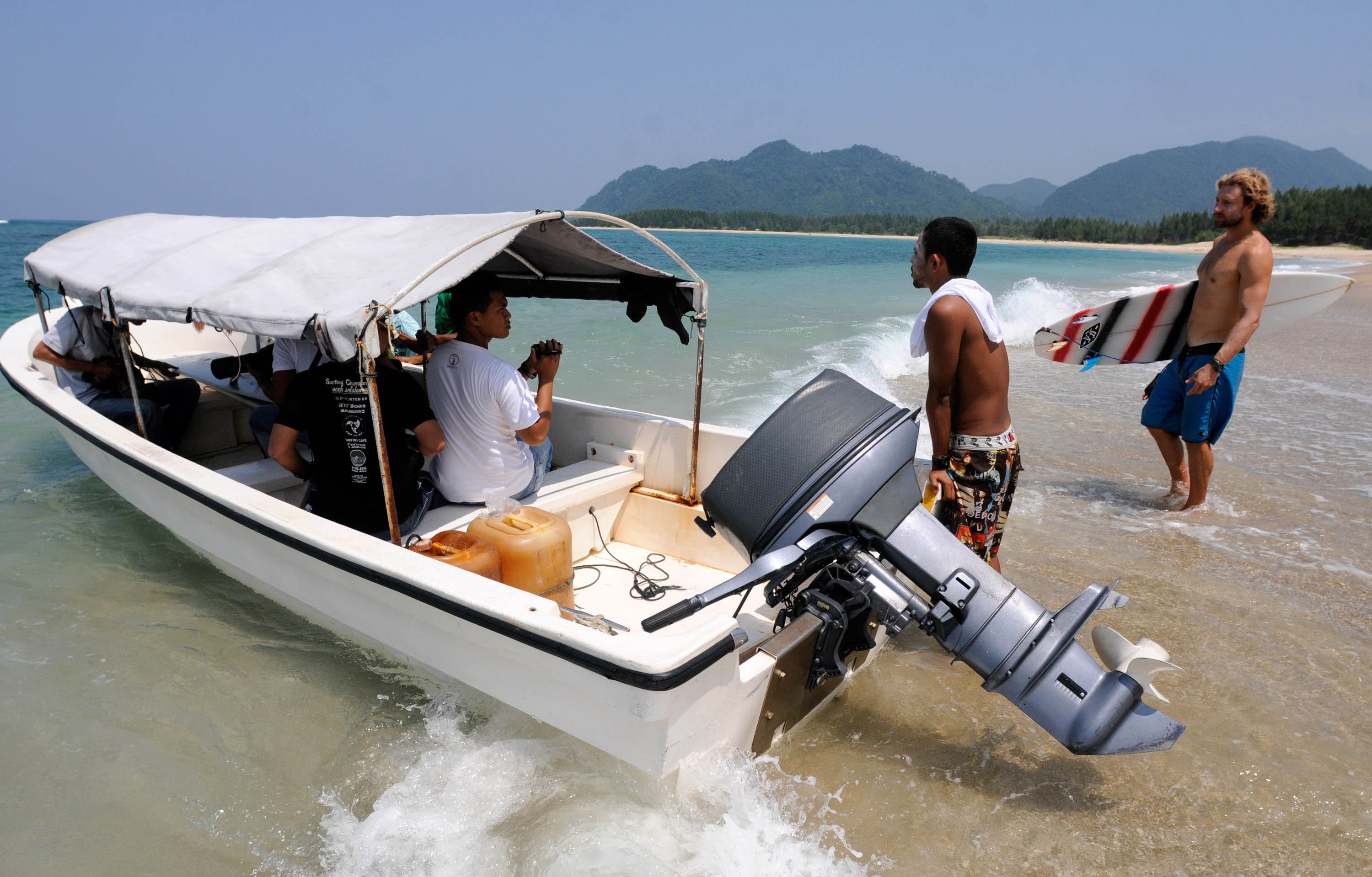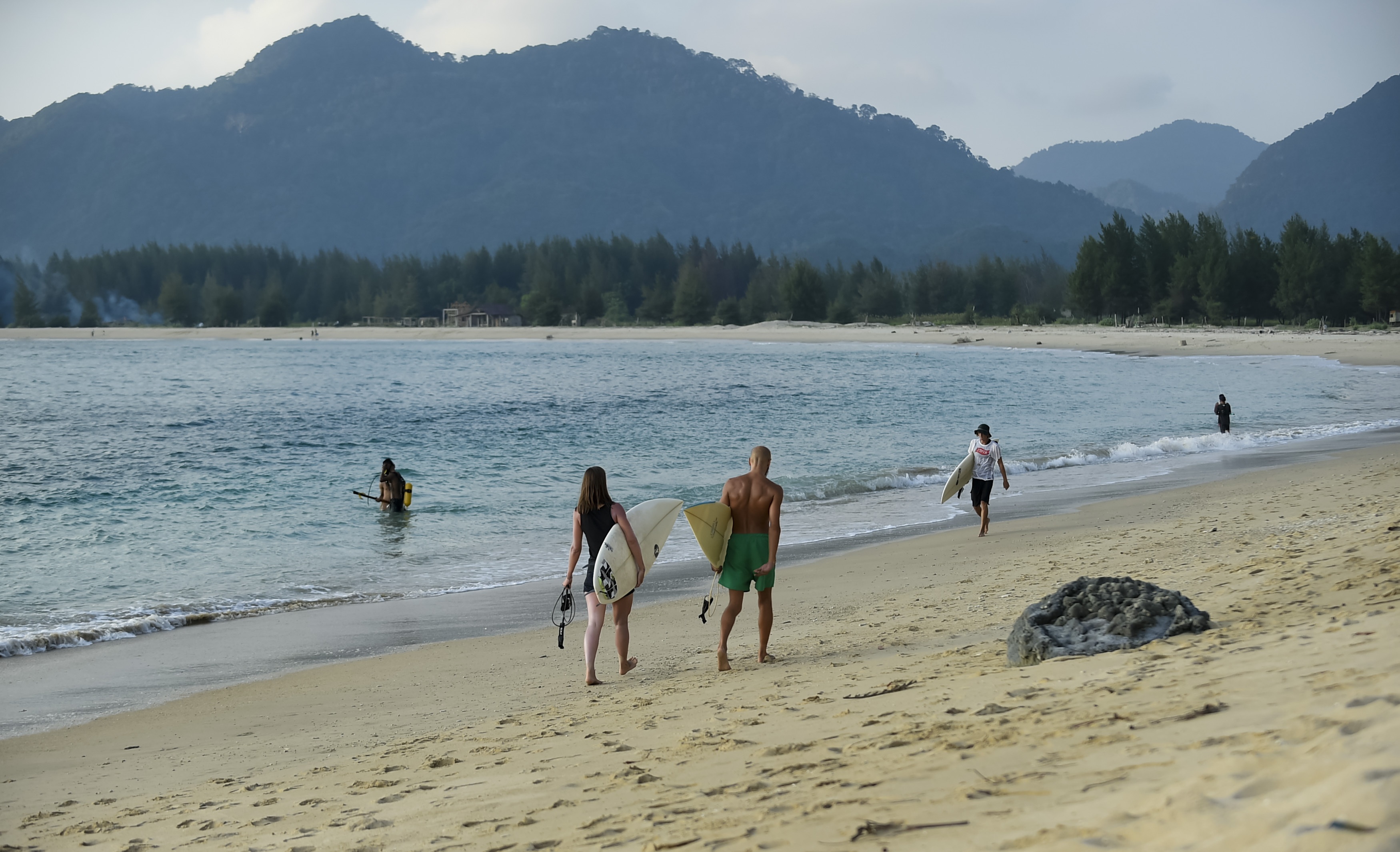 Tourists surf on Lhoknga Beach, Aceh Besar District, Aceh, Indonesia offers world class waves during the North East monsoon with perfects barreling waves, ranging between 2-6ft high, 4 reefs breaks in total.