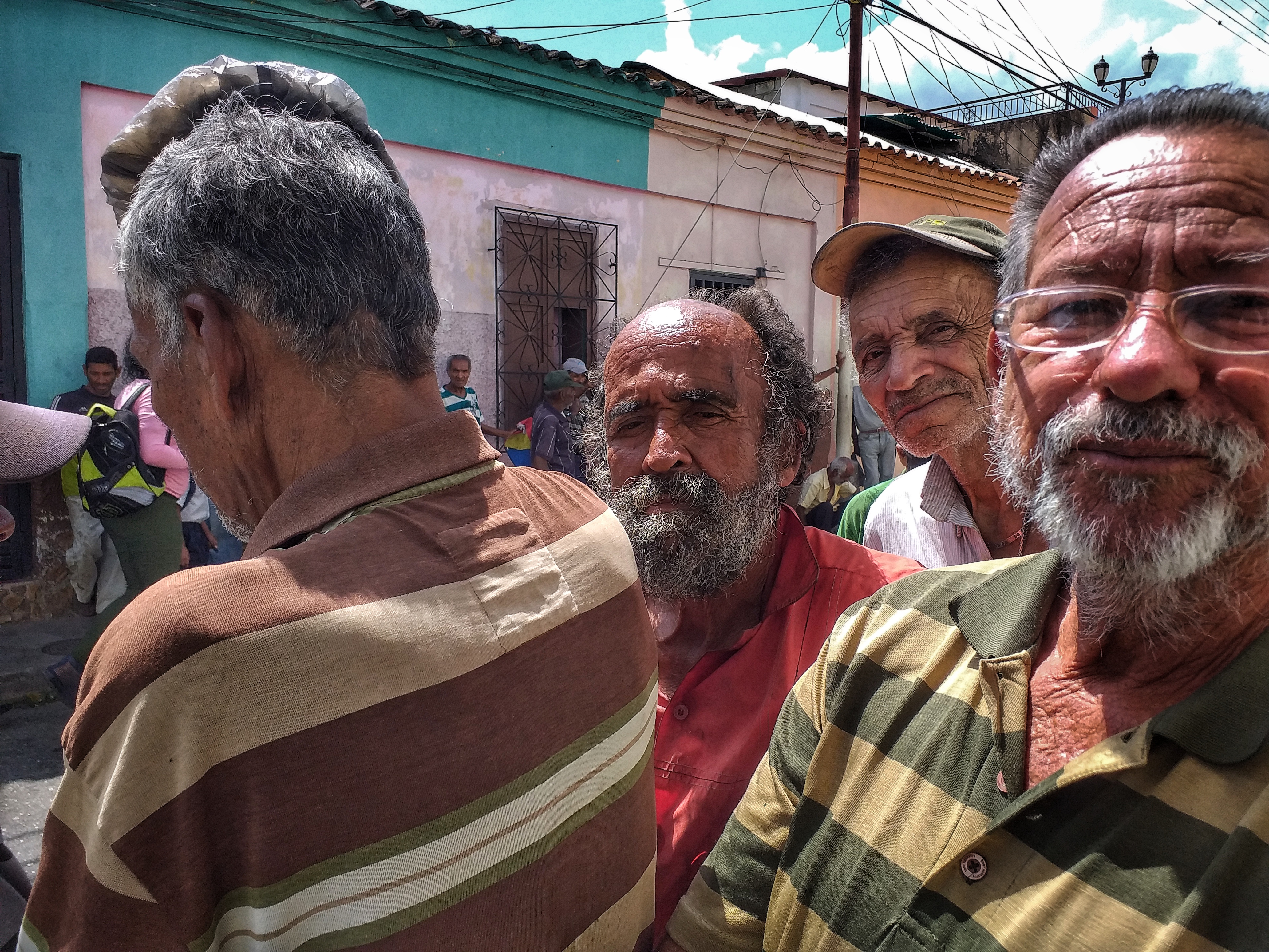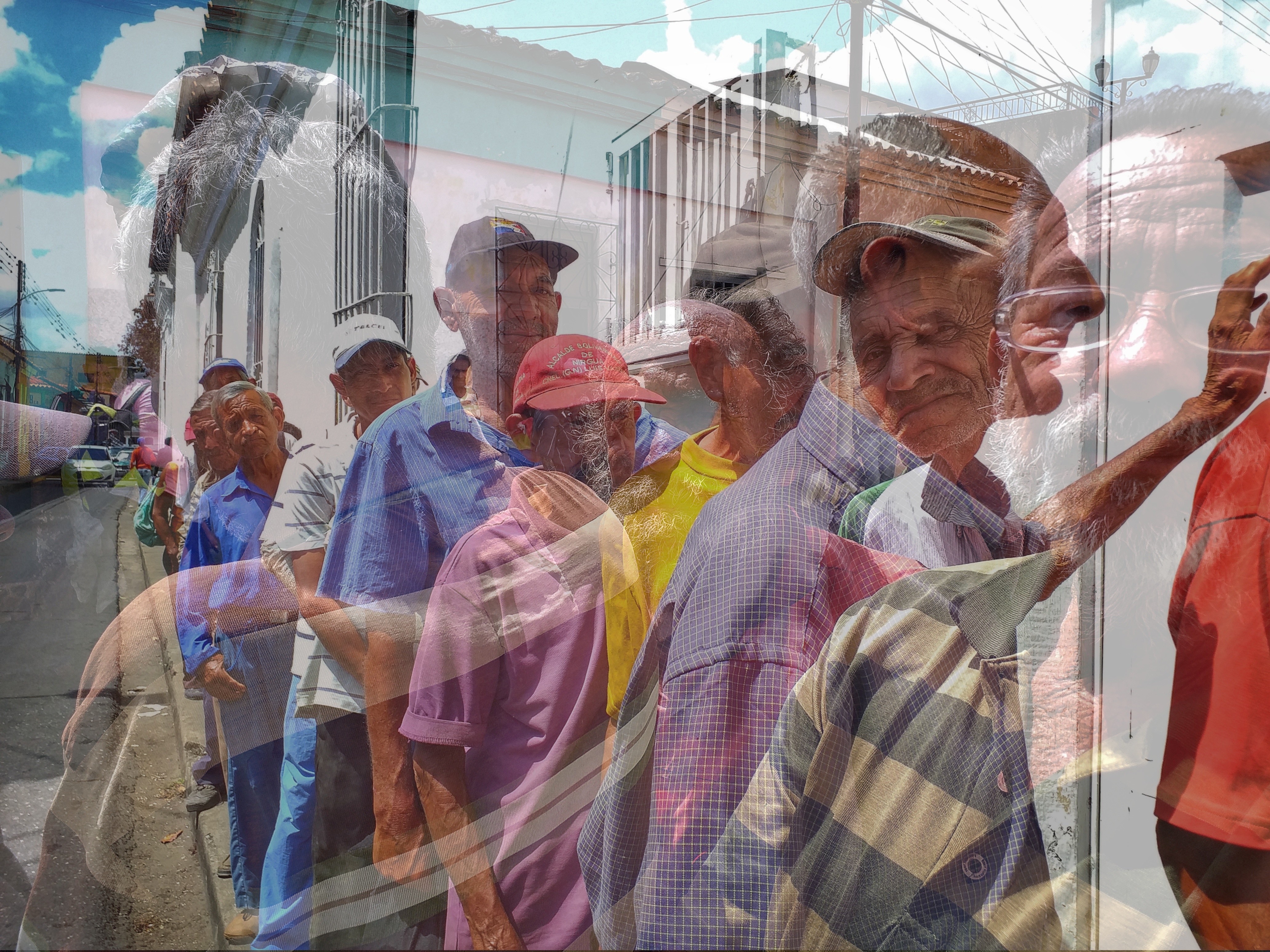 ...Muestra una fila con varios caballeros, de hecho unos están mirando a la cámara, otros no, otros de perfil. Pudiera parecer que no hay tampoco mucho de especial en ella, solo que al evaluar todas las imágenes, que fueron de ese mismo día, yo pude ver en estas ese ángulo de la fila, que resalto de las demás, justo para combinarse con la otra y pues si funcionó.
