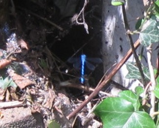 So far my knowledge went. My neighbour has a pond and so I sometimes encounter such a beautiful blue creature in my garden. As you may know from a post earlier Witches, teasing little rascals, I have a simple camera, so therefore it's really complicated when the sun is shining and making a bright day. I do not really know what I'm doing for I do not see anything through my camerawindow.