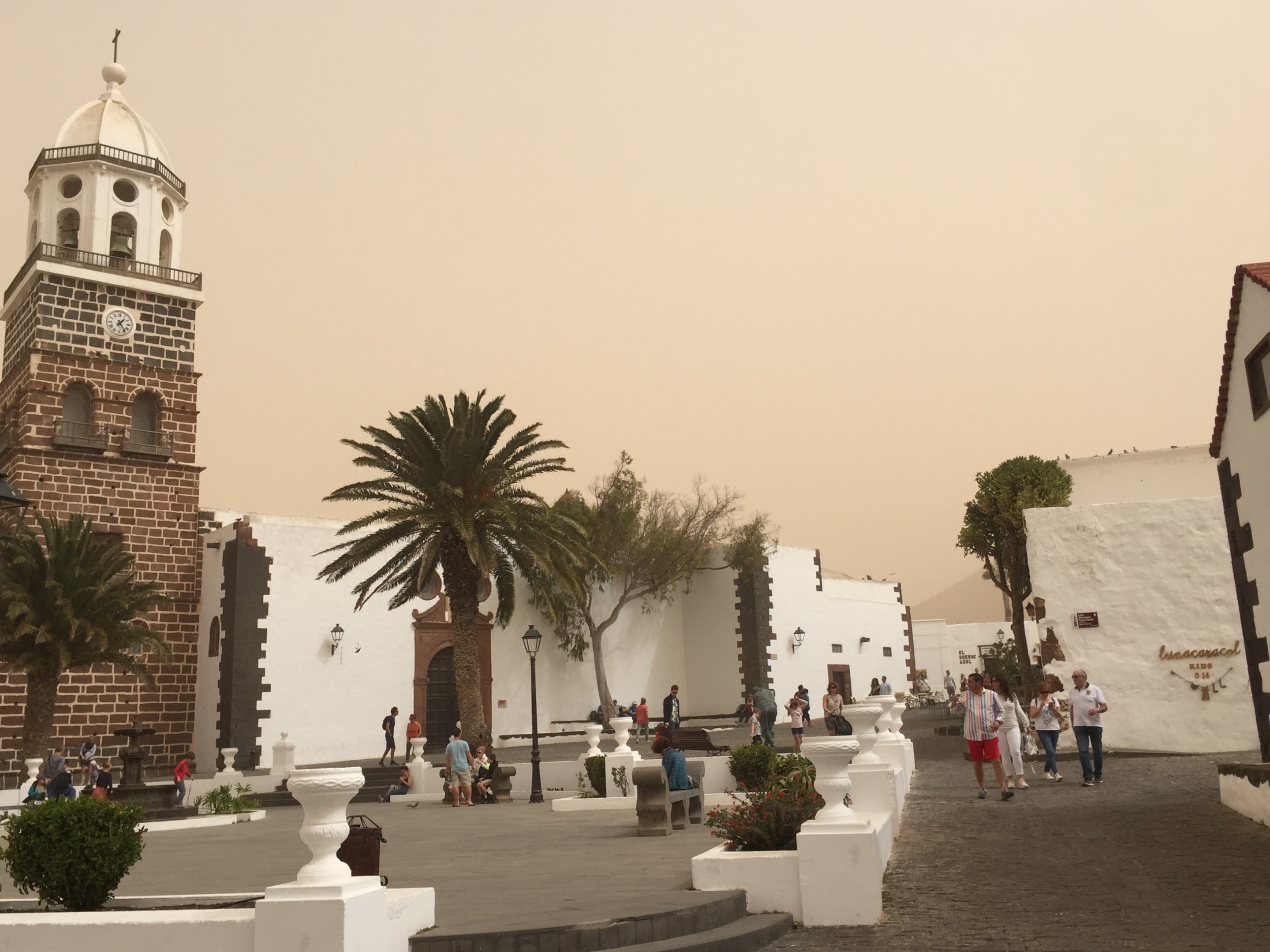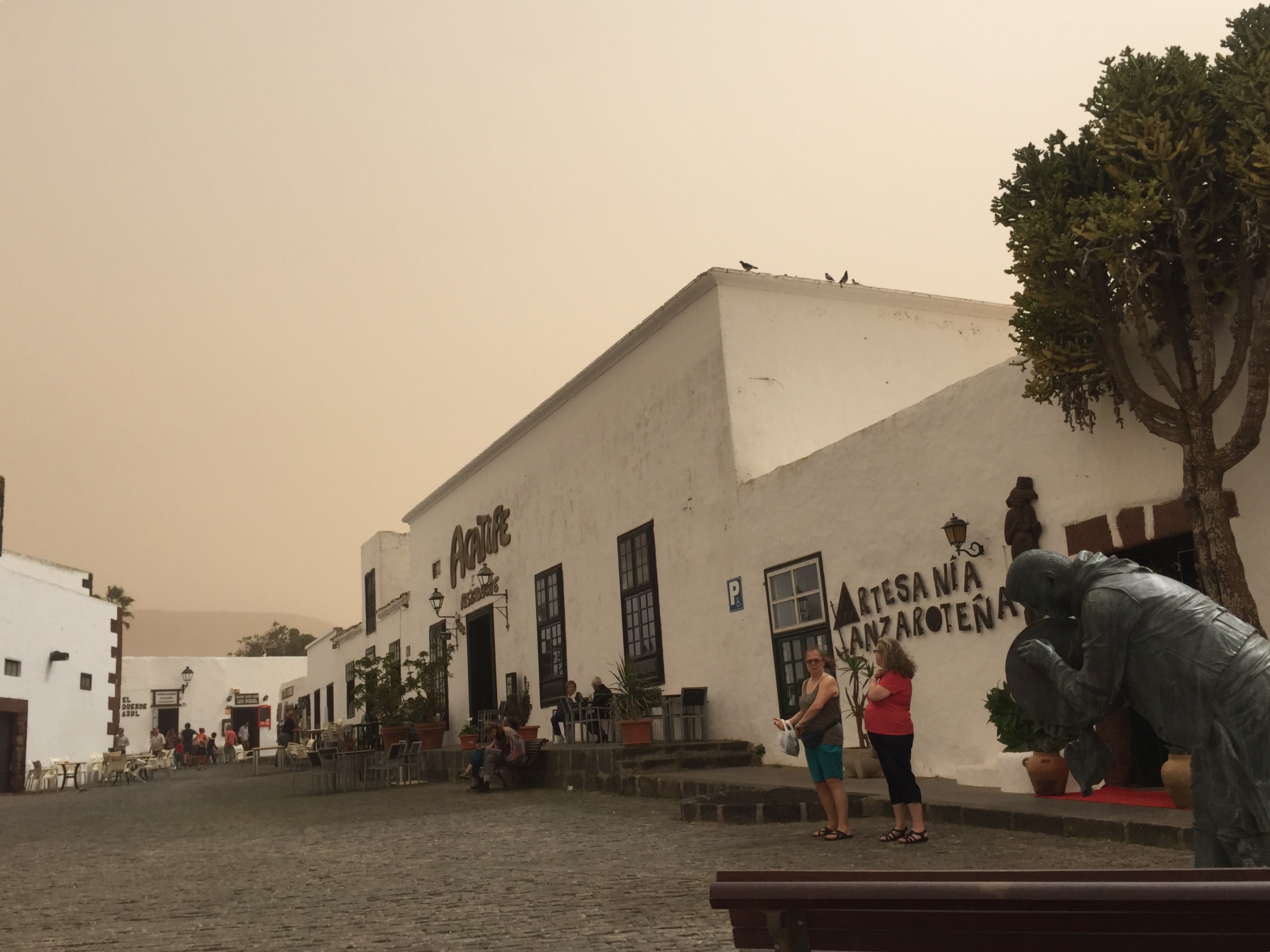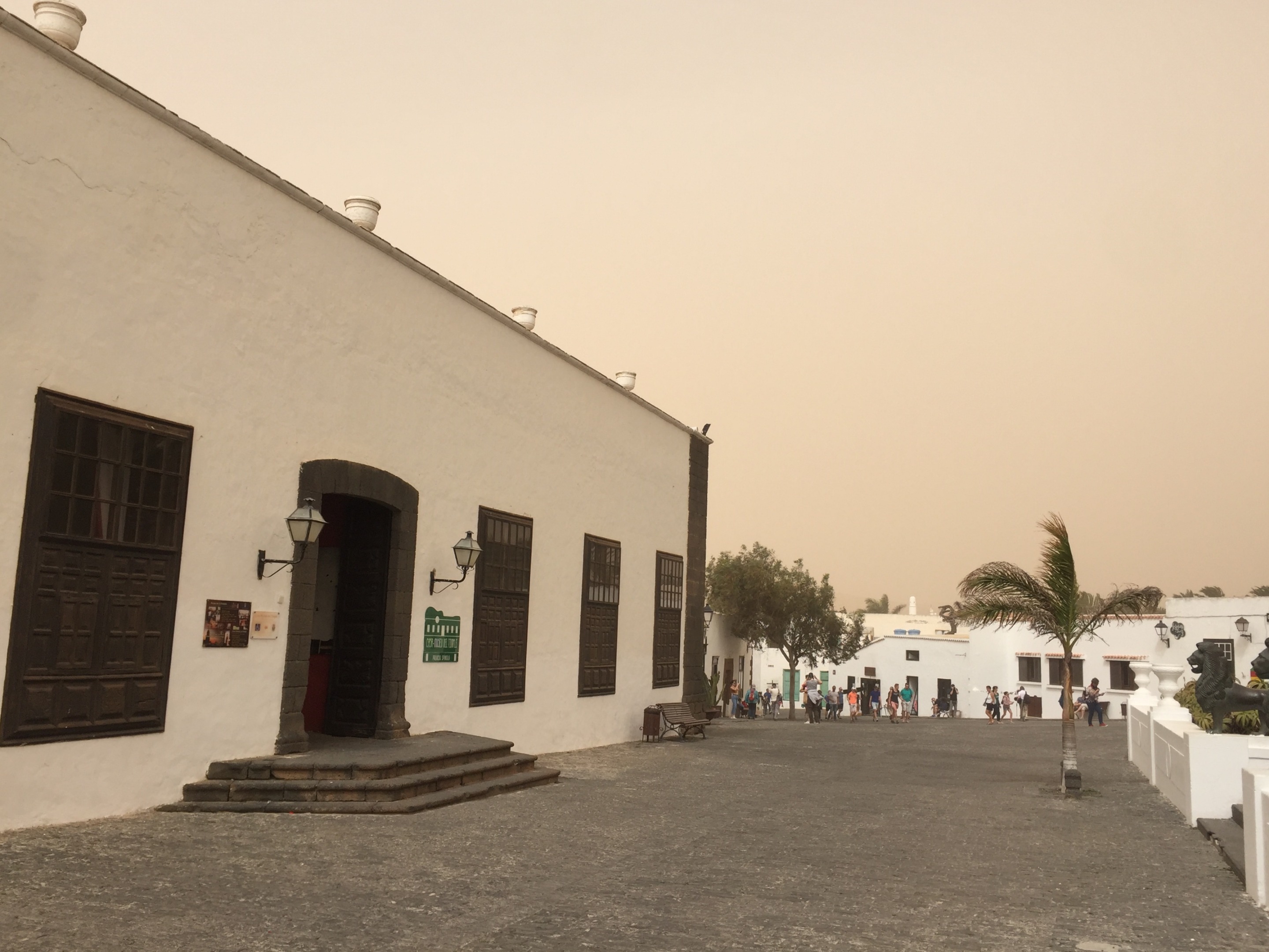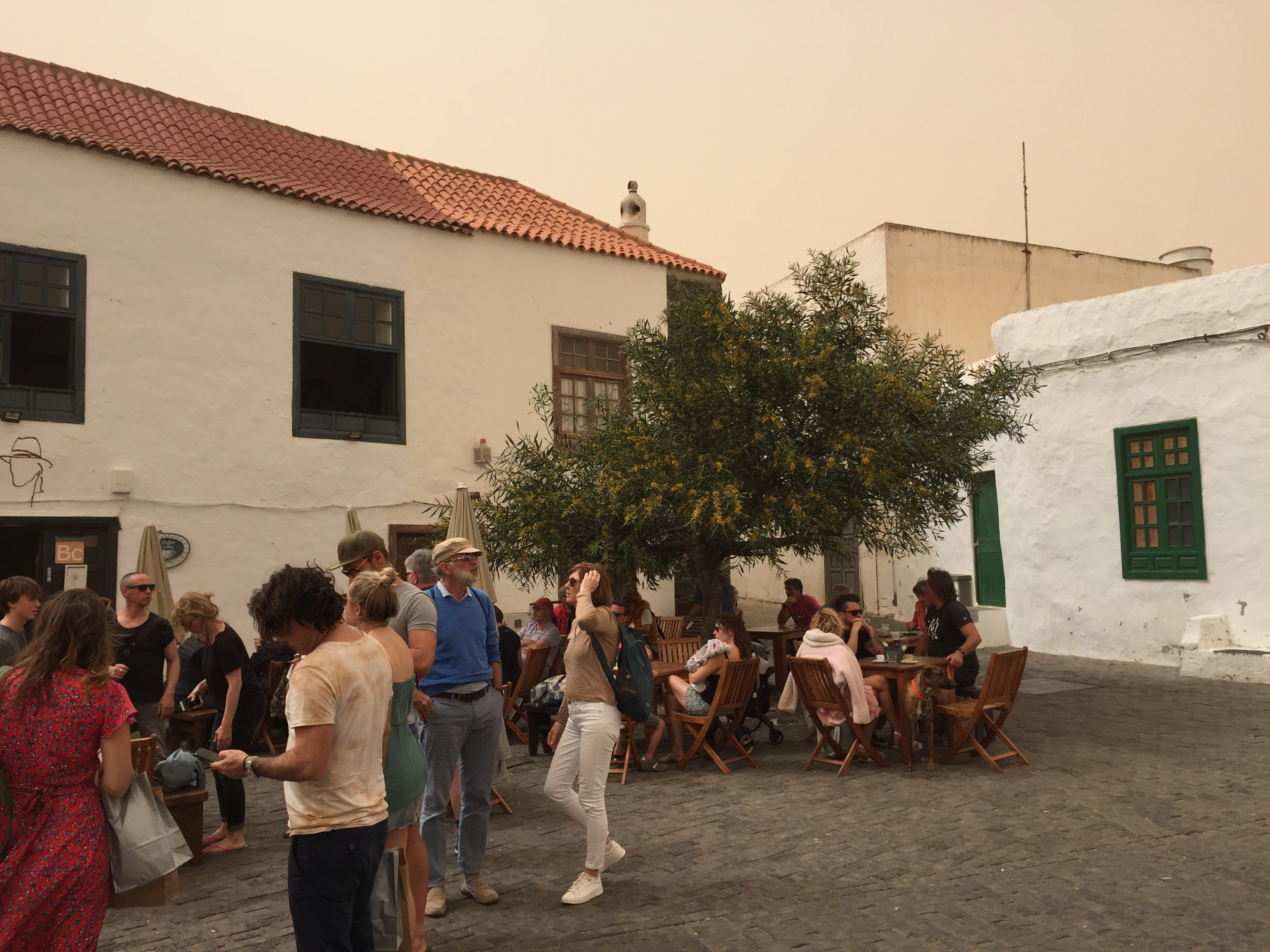 Al llegar nos encontramos con la sorpresa de que el mercadillo se había suspendido por la calima, suele haber más viento que en otras zonas, pero decidimos igual dar un paseo y, por lo visto, no erábamos los únicos temerarios (¿inconscientes?) e ignaros de las noticias locales.