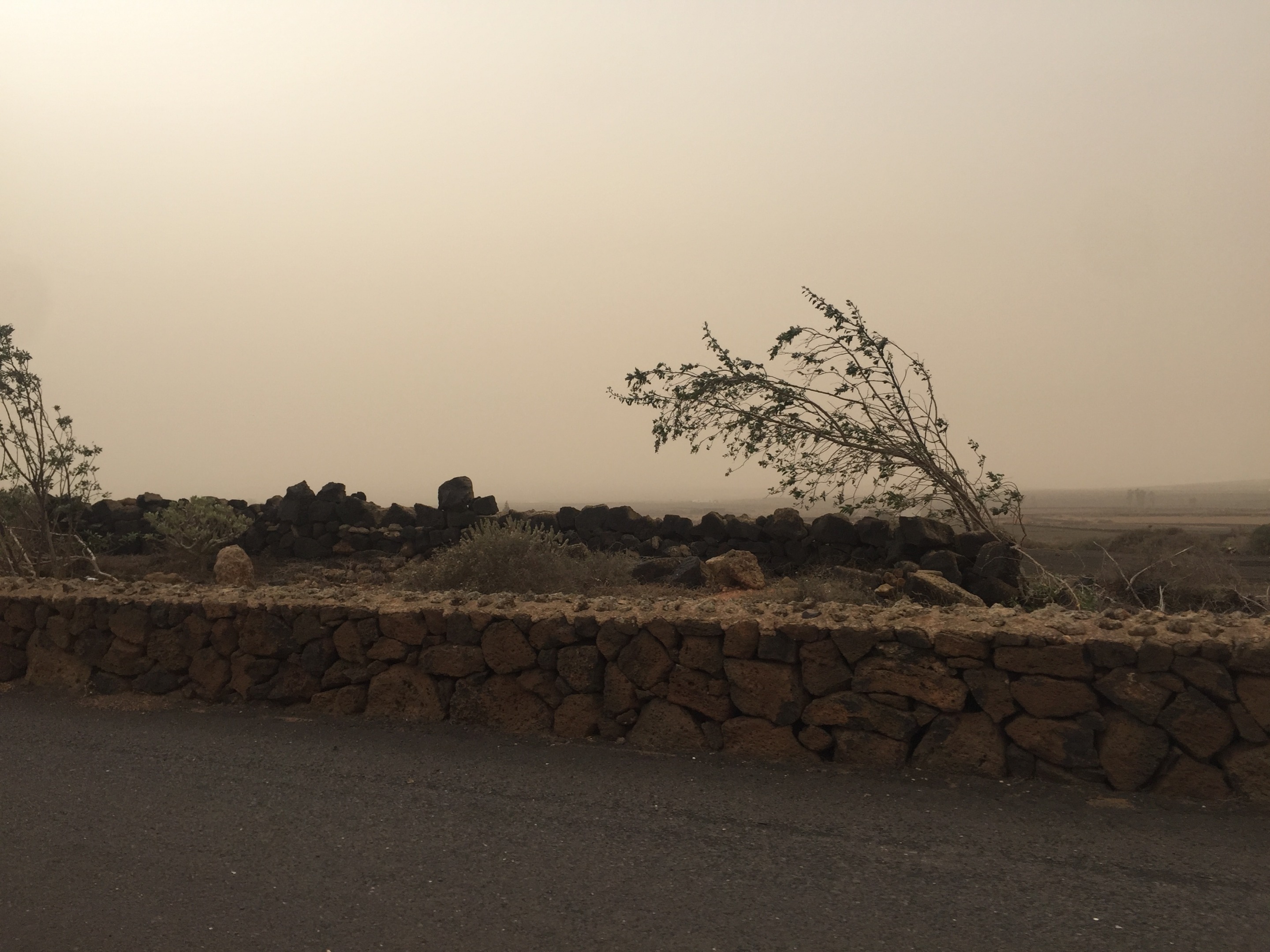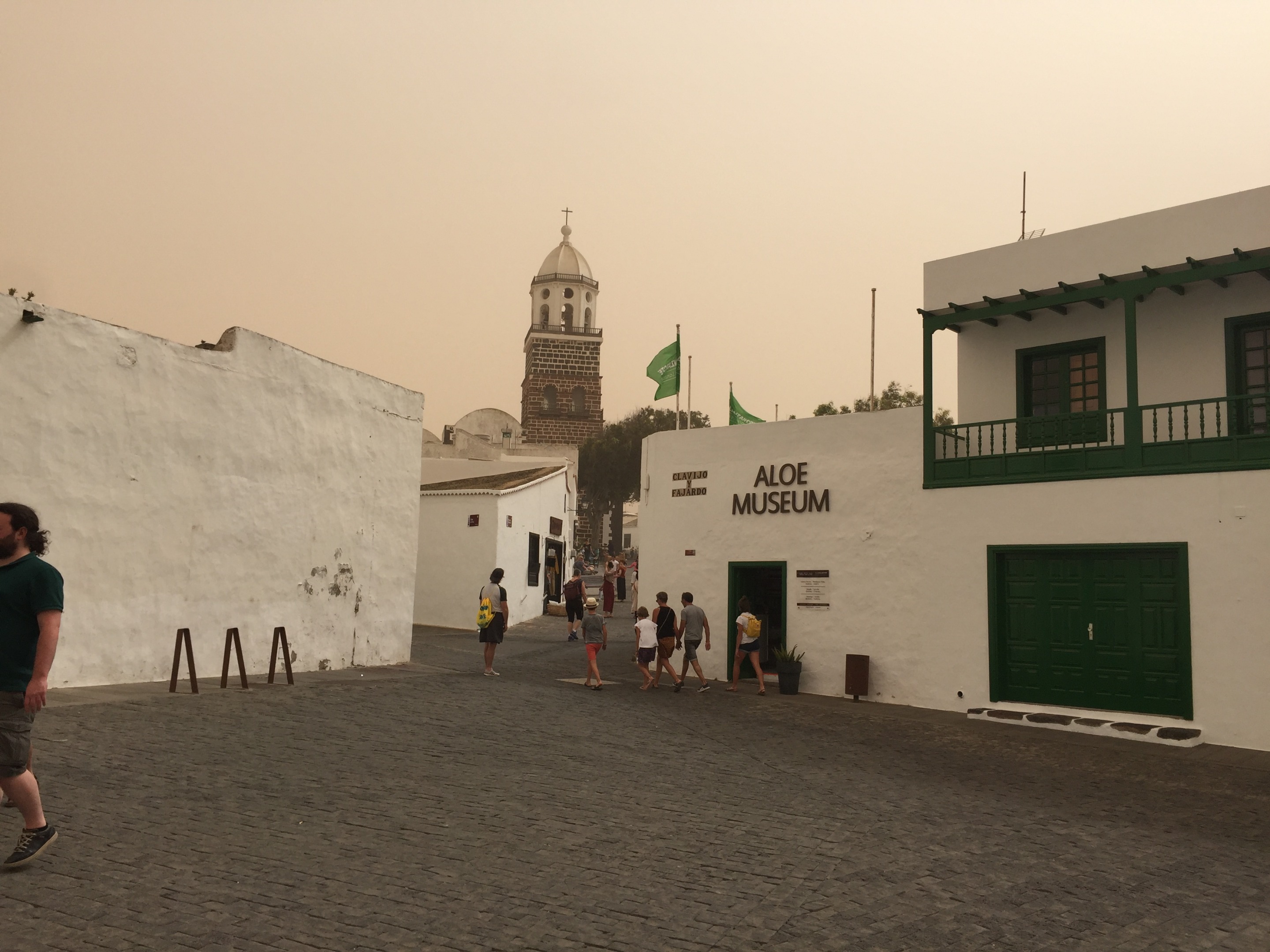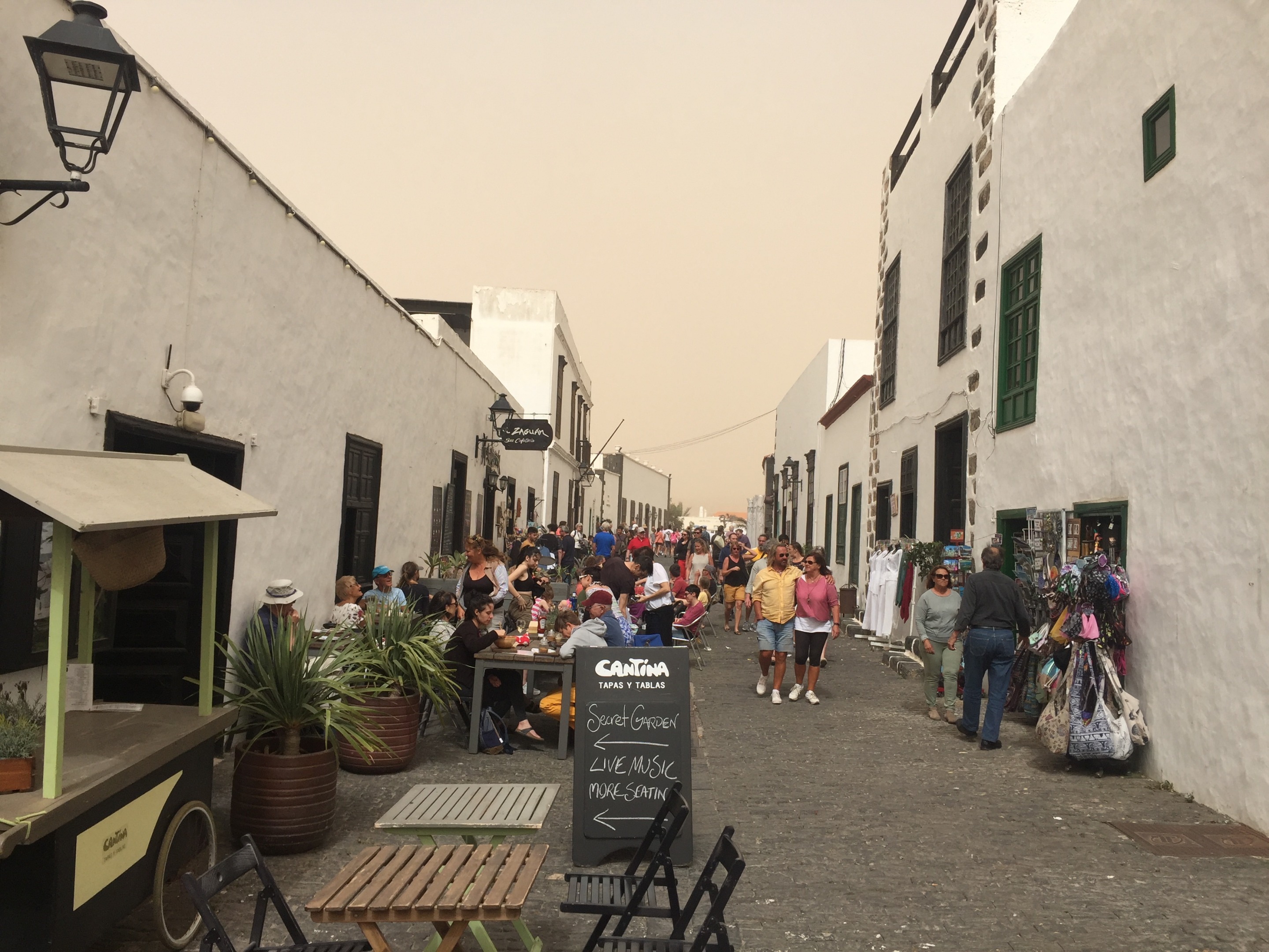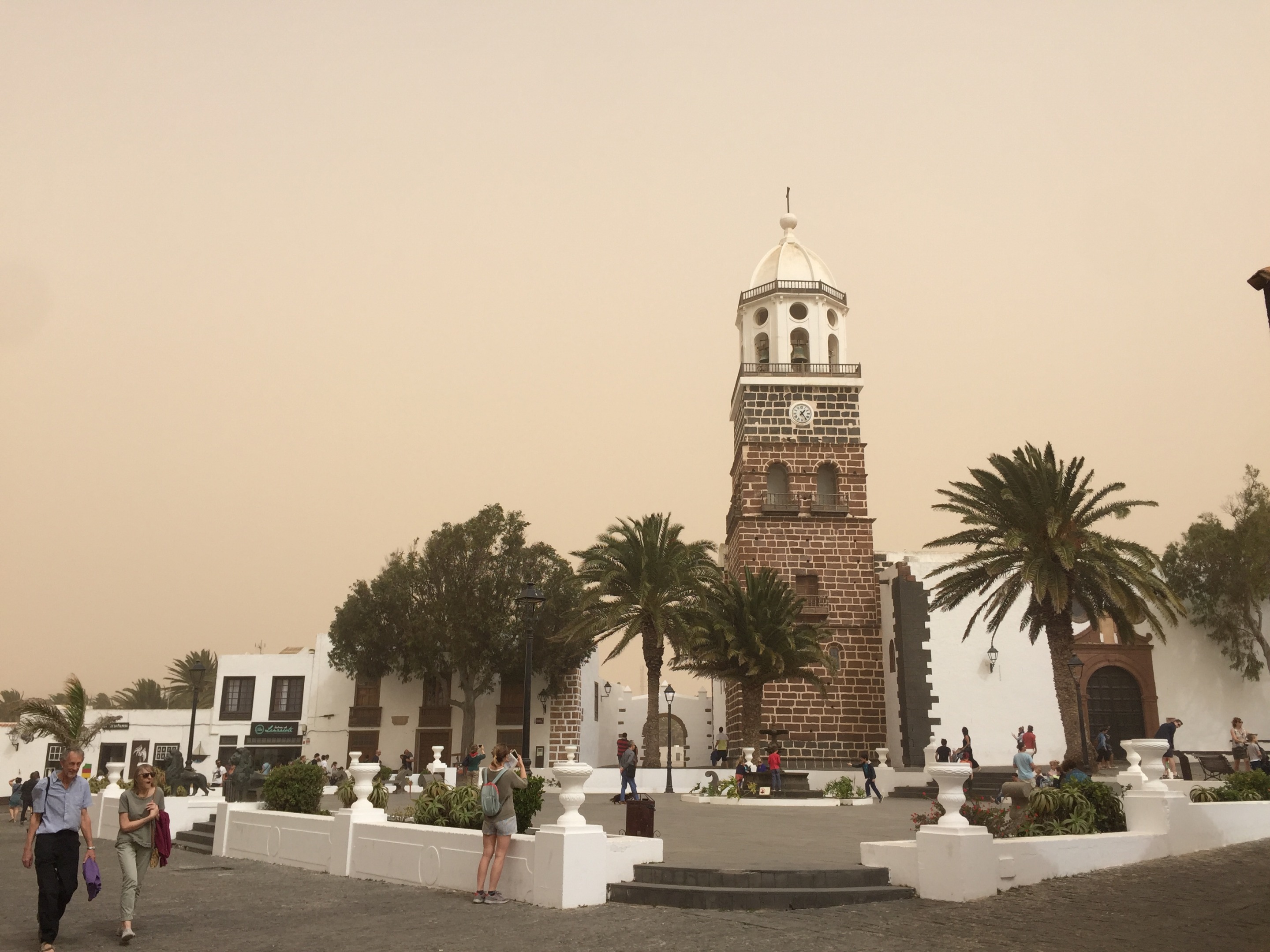 Al llegar nos encontramos con la sorpresa de que el mercadillo se había suspendido por la calima, suele haber más viento que en otras zonas, pero decidimos igual dar un paseo y, por lo visto, no erábamos los únicos temerarios (¿inconscientes?) e ignaros de las noticias locales.