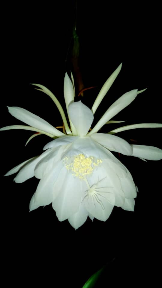 The first "story" is about an awaited night, when my lovely nocturnal "dancers" finally blossomed and we could save their images for posterity. Passed 11:000pm my sister was the first to get to the event, led by a delicious fragrance, which I can't know with what compare it, lavender?, jasmine?, no, those smells I've just smelt from synthetic products, this aroma was natural and very concentrated, so much so it flooded all my house's front (an outdoor space). The power had gone out, they were the only protagonists. One of the most exotic flowers I know, they blossom at night and in the morning are withered. Their flowers are delicate, are an ephemeral beauty. While the plant is too strong and is easy to reproduce it.