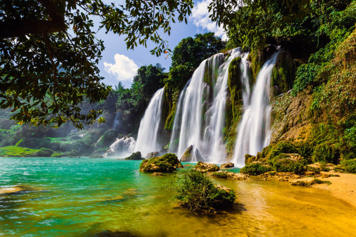 The Ban-Gioc waterfall is located exactly between China and Vietnam and extends over several steps with a total of more than 53 meters difference in altitude. The Ban-Gioc Waterfall is one of the largest waterfalls in the world spanning two national borders.
