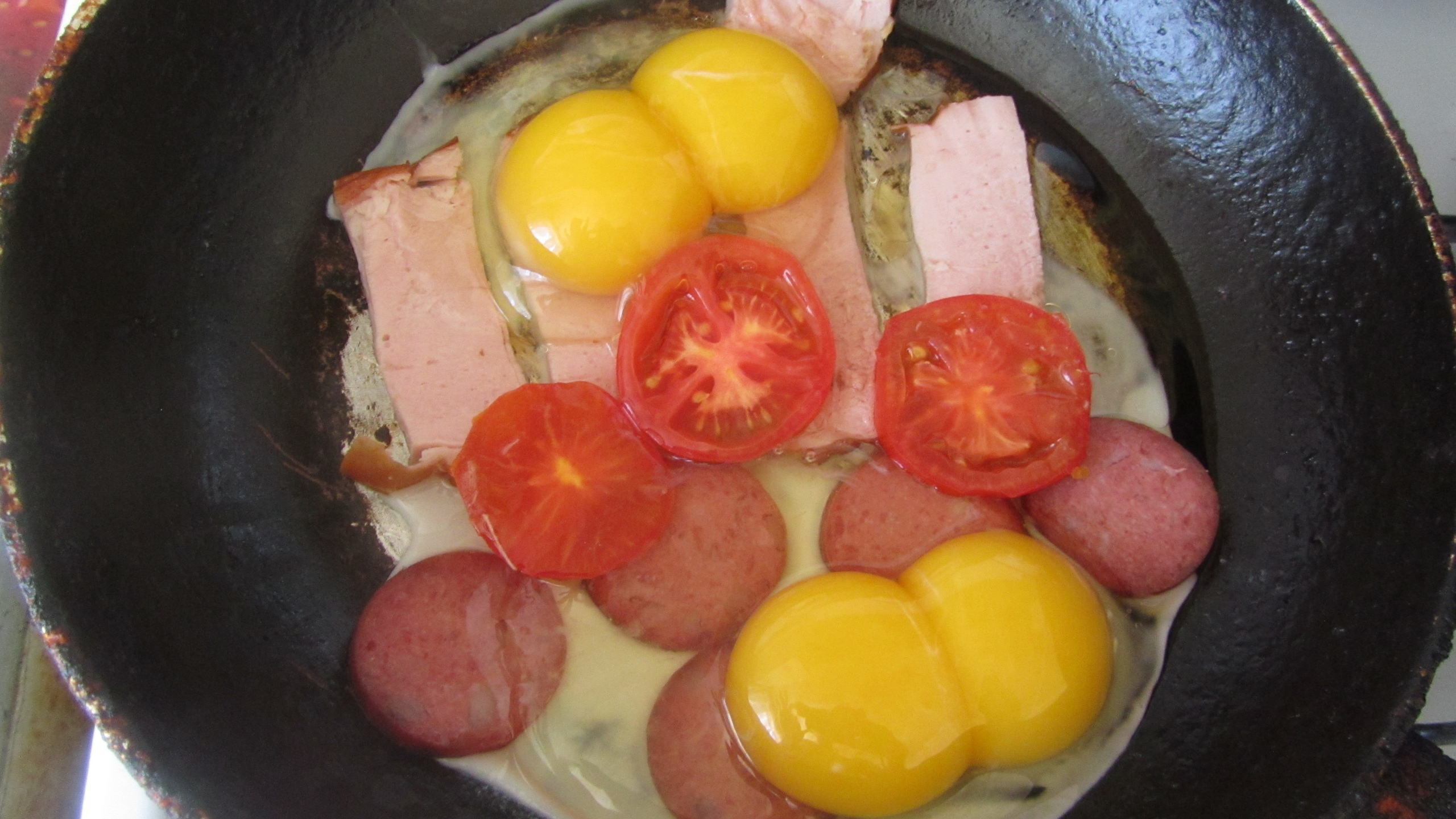 Take the frying pan and put it on a slow fire and pour the sunflower oil, we wait for the pan to warm up. After that, we lay our bacon, sausage, tomato and drive the chicken eggs into the frying pan. The recipe is very simple and does not take much time.