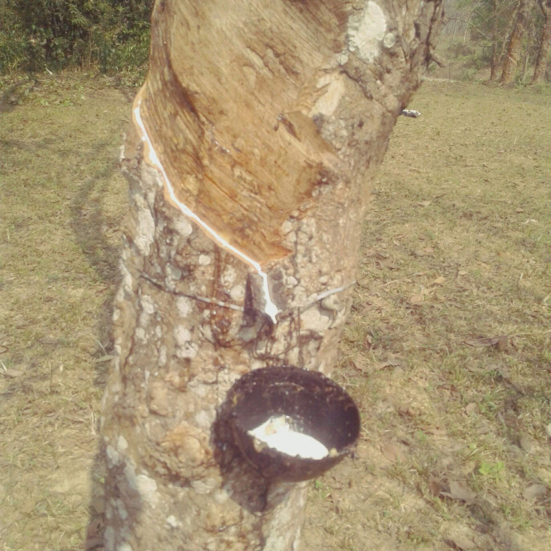 The workers cut the bark of the tree and hangs a pot there.From the cutted place something liquid keeps gathering on the hanged pot.Which is white in colour and smells a little bit weird. Few days later they took the liquid thing and processes to turn them to rubber products.