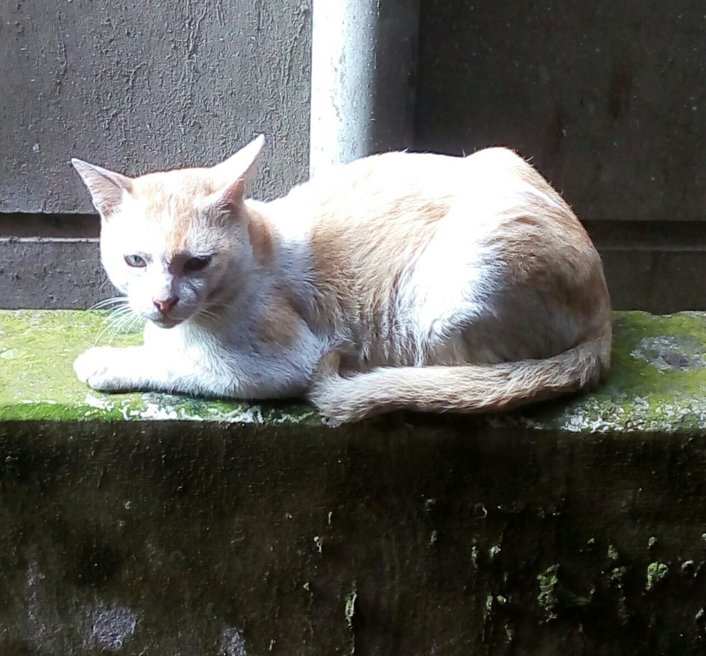In the morning, when I came to my house after finish my daily jogging I saw this cat. It was sat in beside my house. Suddenly, I saw it. It looked so cute and pretty. Its pelage was white and brown. At first look, I liked it. So, I took this photo from my mobile phone.