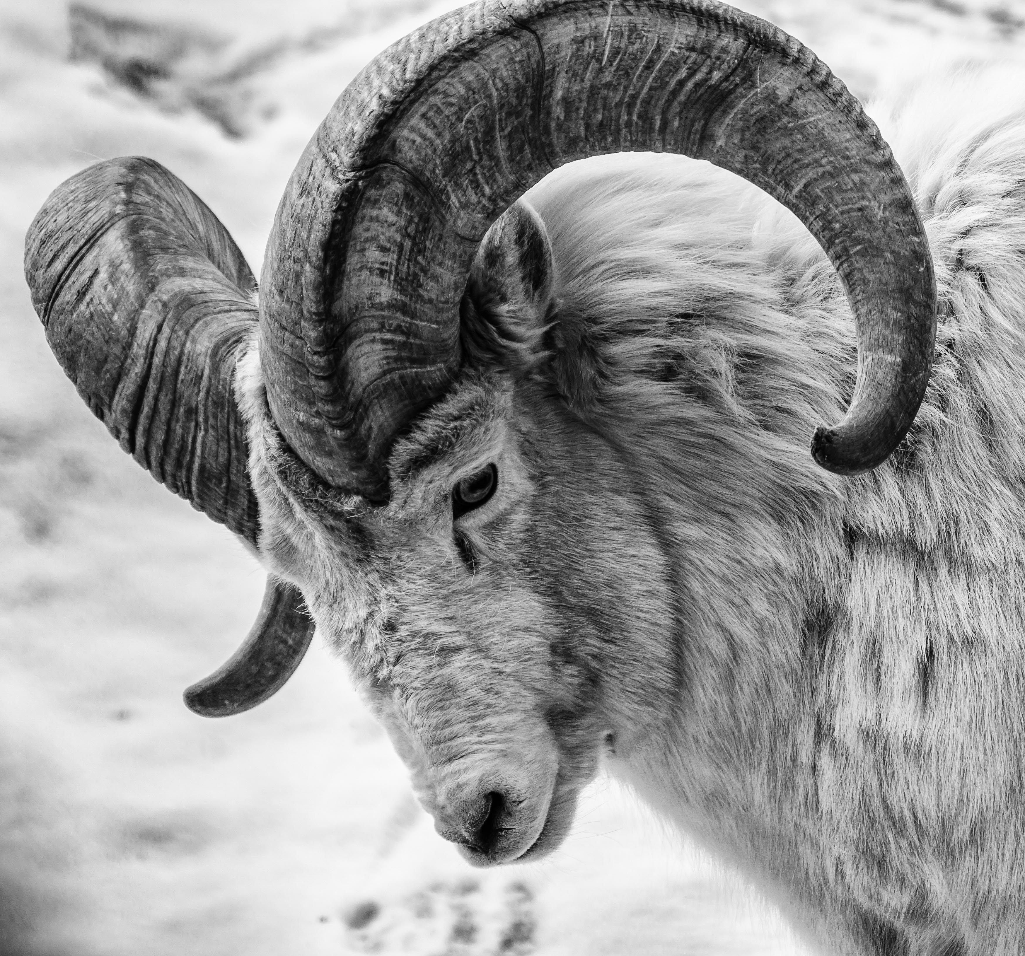 I have always thought that Big Horn Sheep were a very friendly looking animal, fearsome but gentle. The way their fur turns white in the winter really lends itself well to monochrome and its fun seeing them out in the snow. The details and textures in their horns are interesting and I find really gives them a weathered all seasons type of appearance.