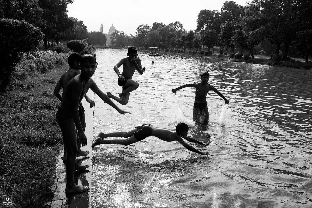 Boys take a dip in water to beat the summer heat near India Gate, Delhi.