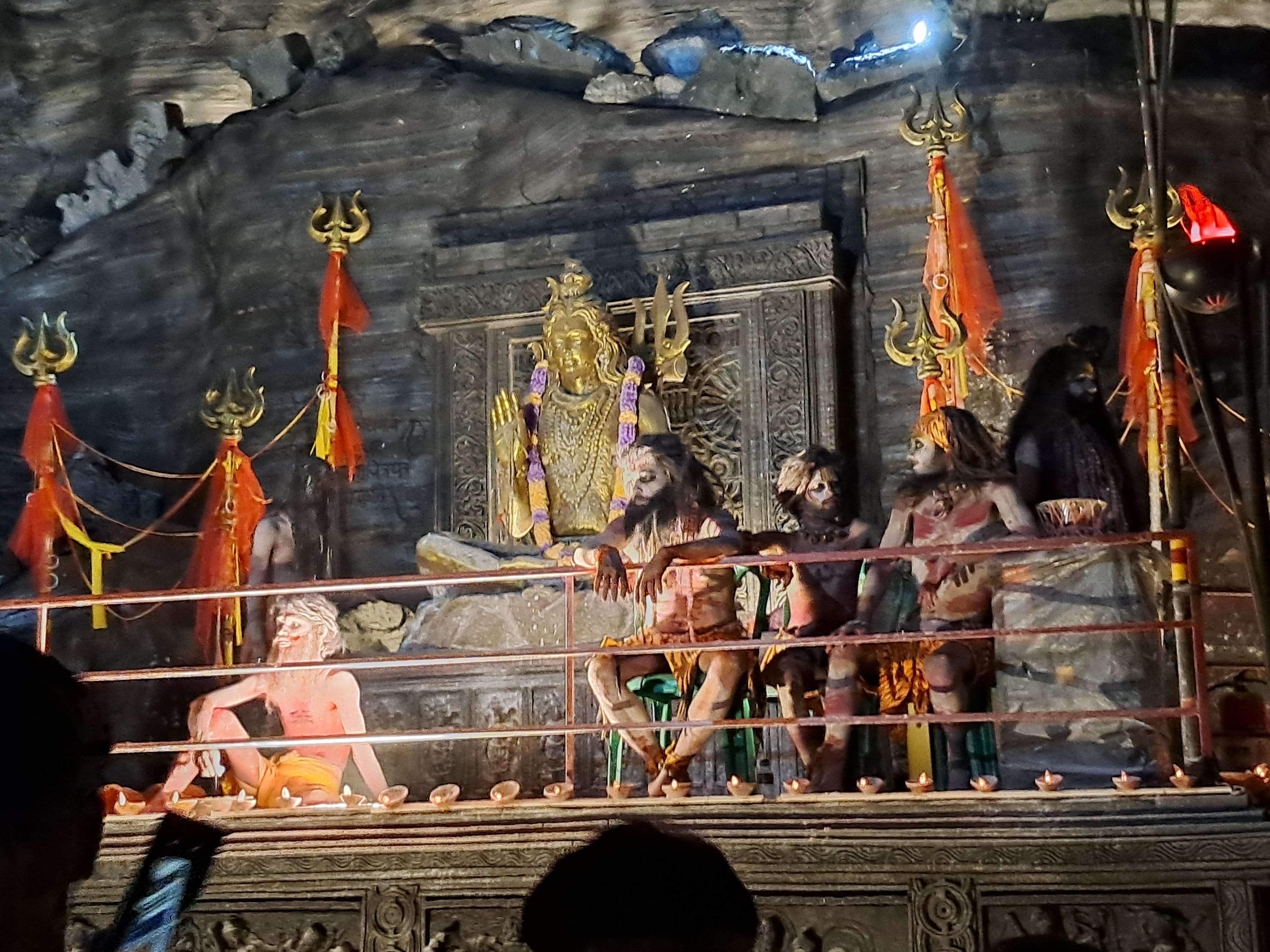 চারপাশে বসে থাকা সন্ন্যাসীদের সাজ এতটাই বাস্তব ছিল যে প্রথমে বোঝাই কঠিন হচ্ছিল তারা মূর্তি নাকি জীবন্ত মানুষ! তাদের শরীরে ভস্ম, হাতে ত্রিশূল, গলায় রুদ্রাক্ষ, সব মিলিয়ে পরিবেশটা হয়ে উঠেছিল একেবারে মহাশিবরাত্রির আবহে ভরা। এছাড়া সামনে রাখা সারি সারি প্রদীপের আলো দৃশ্যটিকে আরও অলৌকিক করে তুলেছিল। এই মণ্ডপে সবচেয়ে বেশি মুগ্ধ হওয়ার মতো ছিল, শিল্পীদের নিখুঁত কাজ। পাথরের দেয়ালের খোদাই, গুহার নকশা, মন্দিরের দরজার সূক্ষ্ম নকশা ইত্যাদি সব কিছু এত যত্ন করে বানানো যে বোঝাই যায় শিল্পী এর পেছনে কতটা সময় দিয়েছে। এই শিব-থিম মণ্ডপটি দারুণ হয়েছিলো।