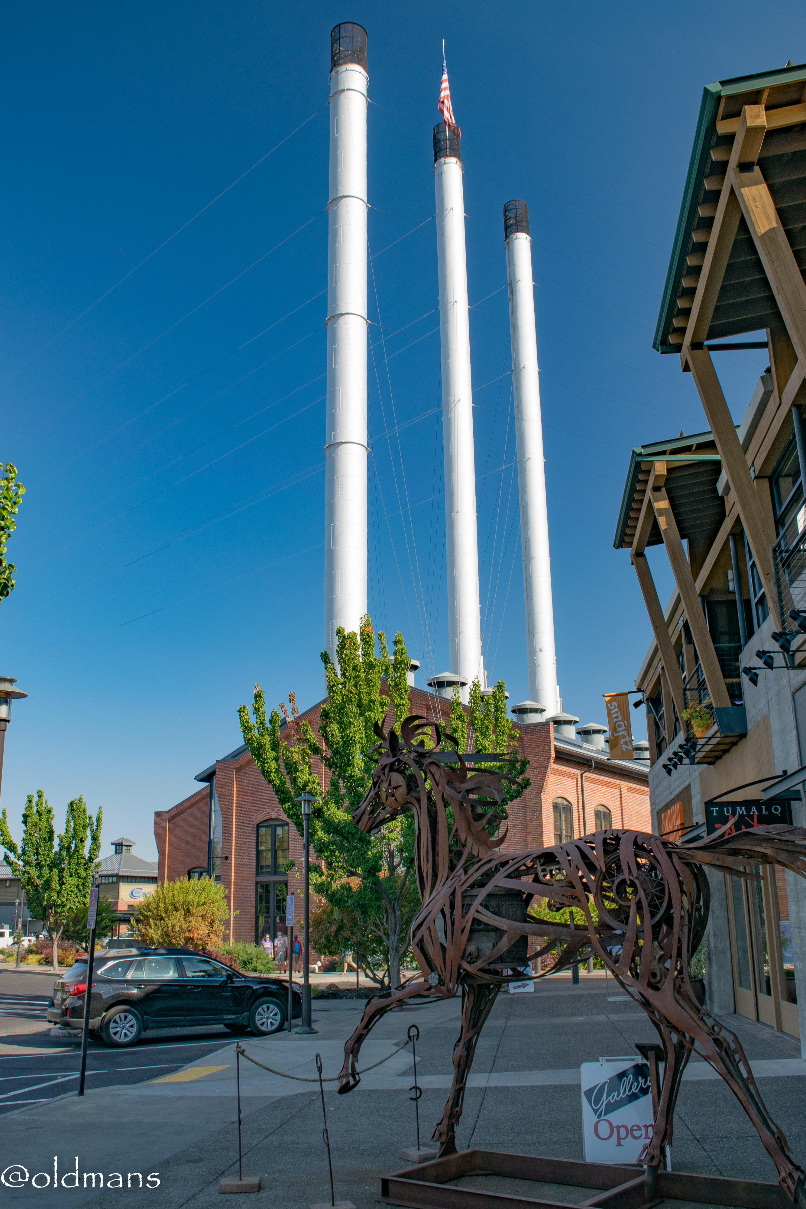 This is a shot of the repurposed old saw mill power plant (now an REI store). It is located in the Old Mill District in downtown Bend, OR on the banks of the Deschutes River.