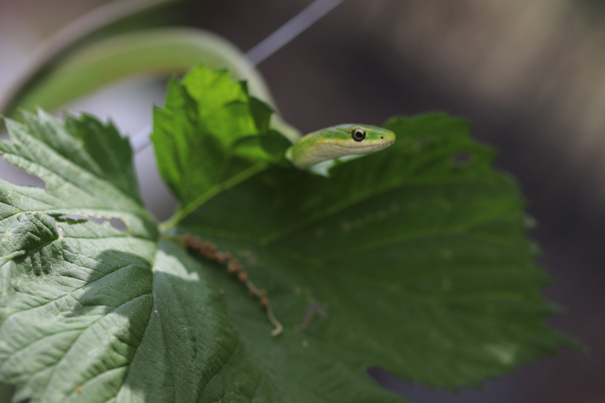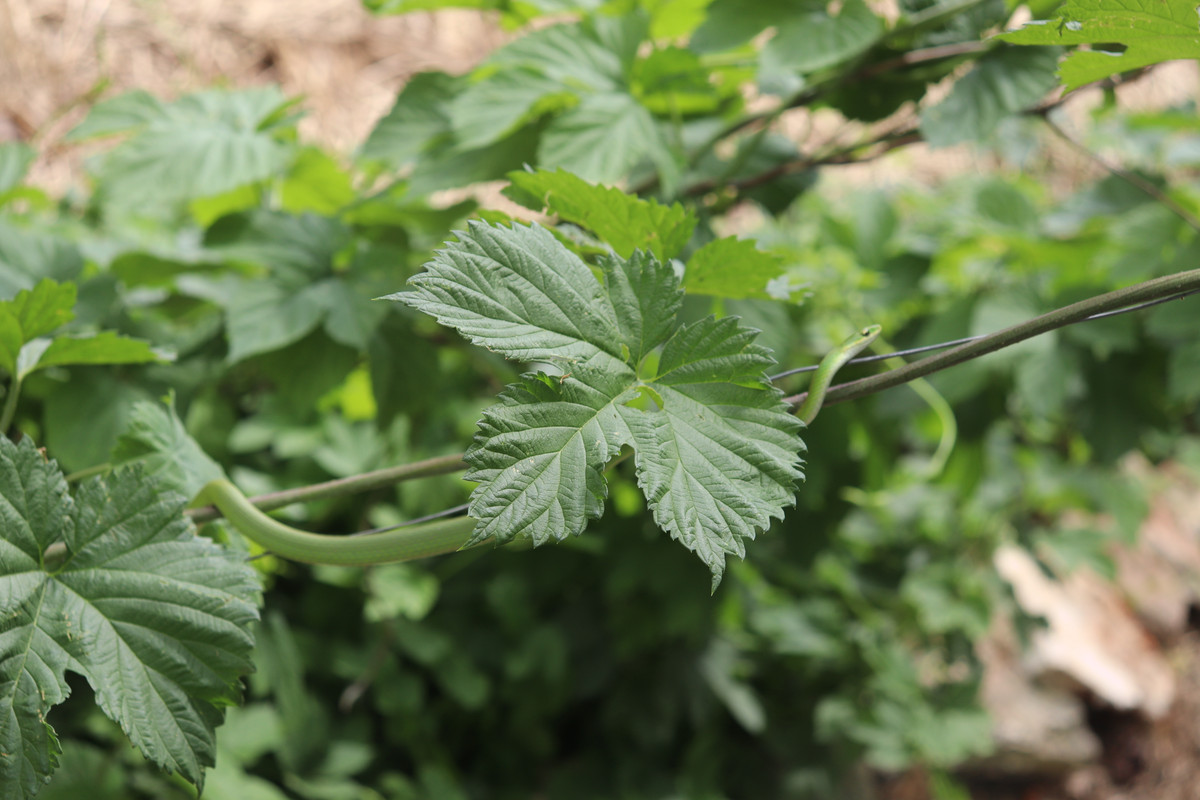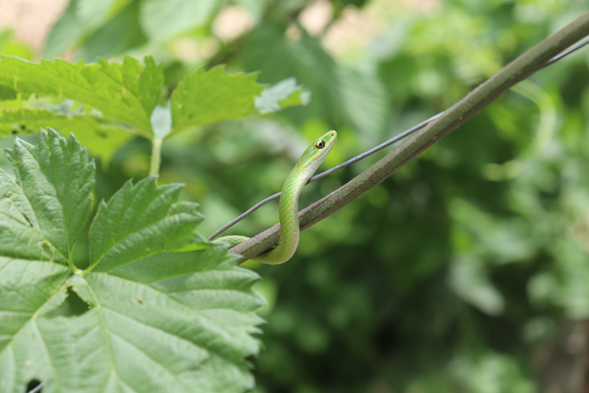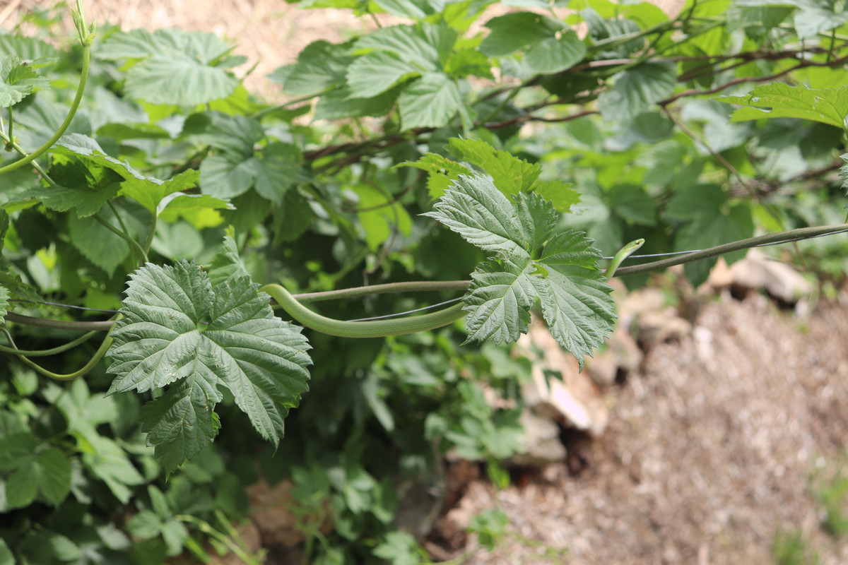 Today was another gardening day for @papa-pepper and some of the @little-peppers. As things would have it, our youngest son, "Buddy-Pepper," who is rapidly approaching two years in age, found his first snake!!! It was a rough green snake hiding in the hops bines, and this snake looks like a living vine for sure!!!