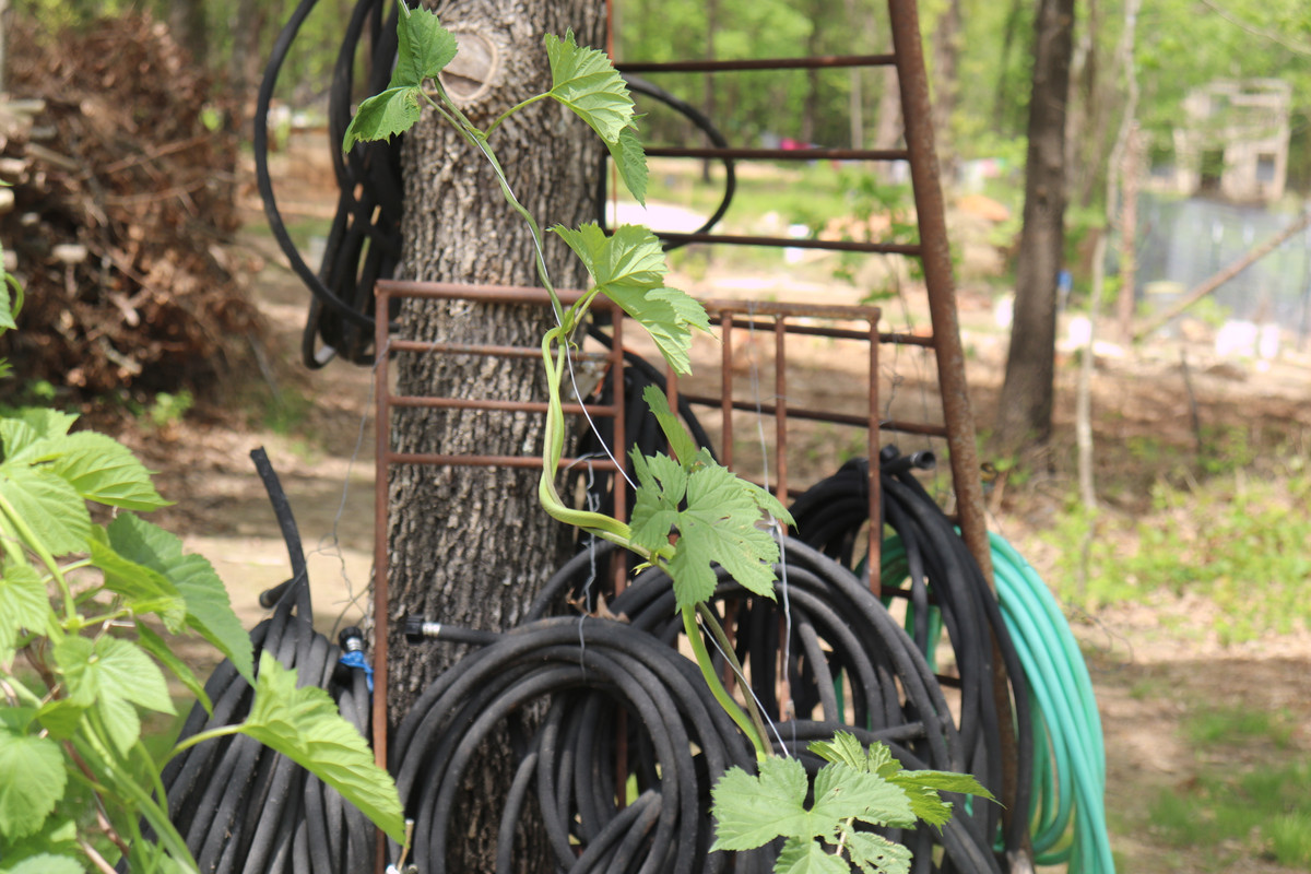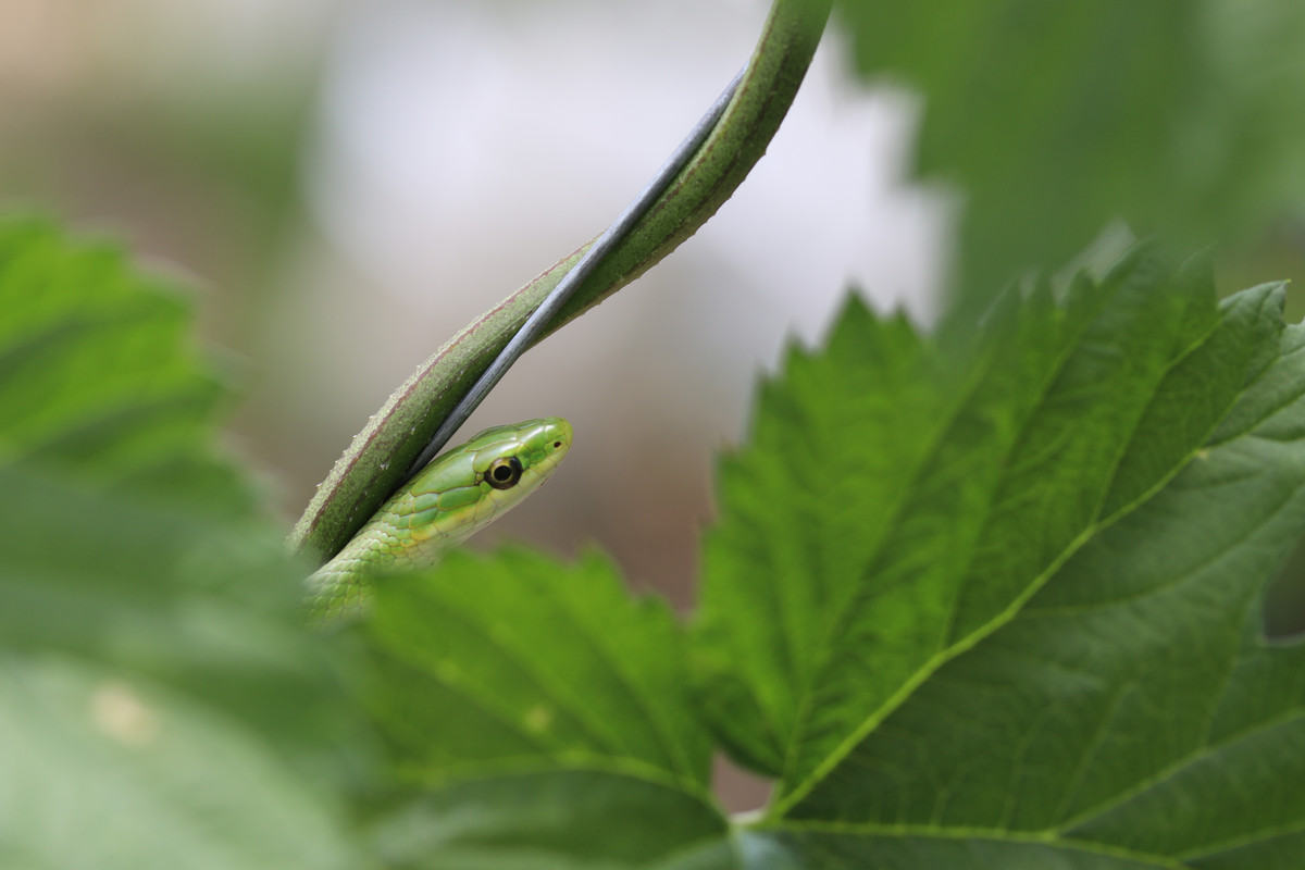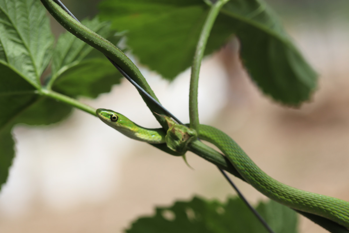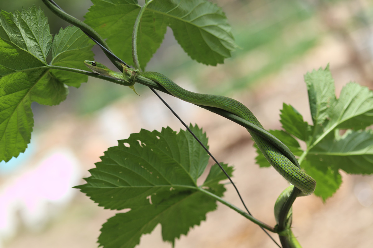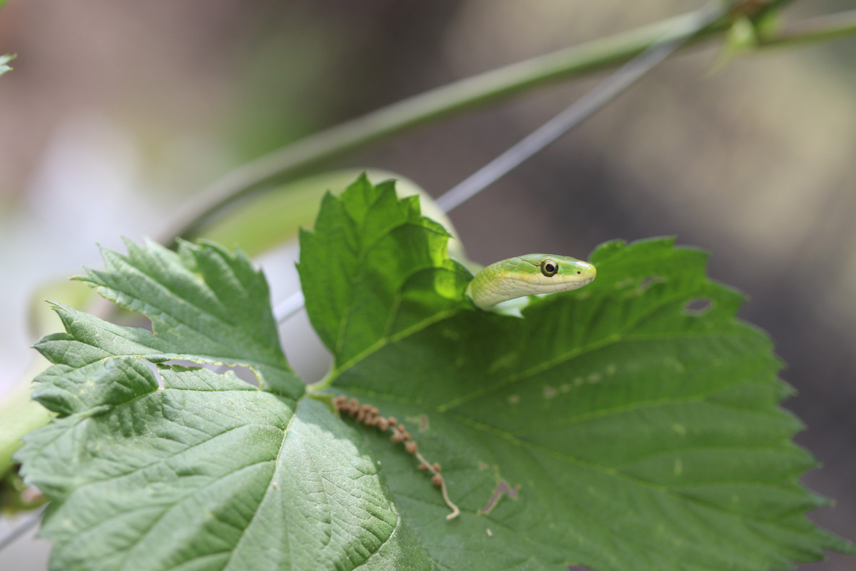 Today was another gardening day for @papa-pepper and some of the @little-peppers. As things would have it, our youngest son, "Buddy-Pepper," who is rapidly approaching two years in age, found his first snake!!! It was a rough green snake hiding in the hops bines, and this snake looks like a living vine for sure!!!