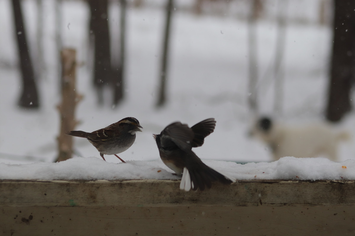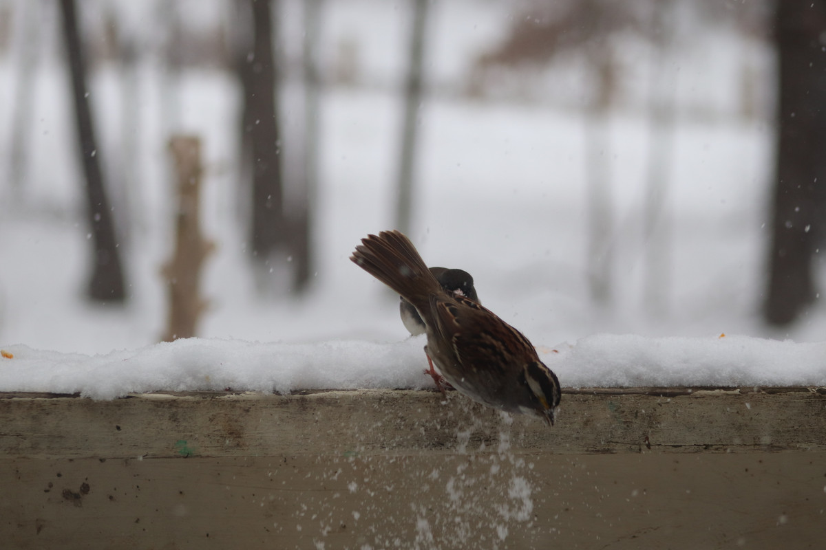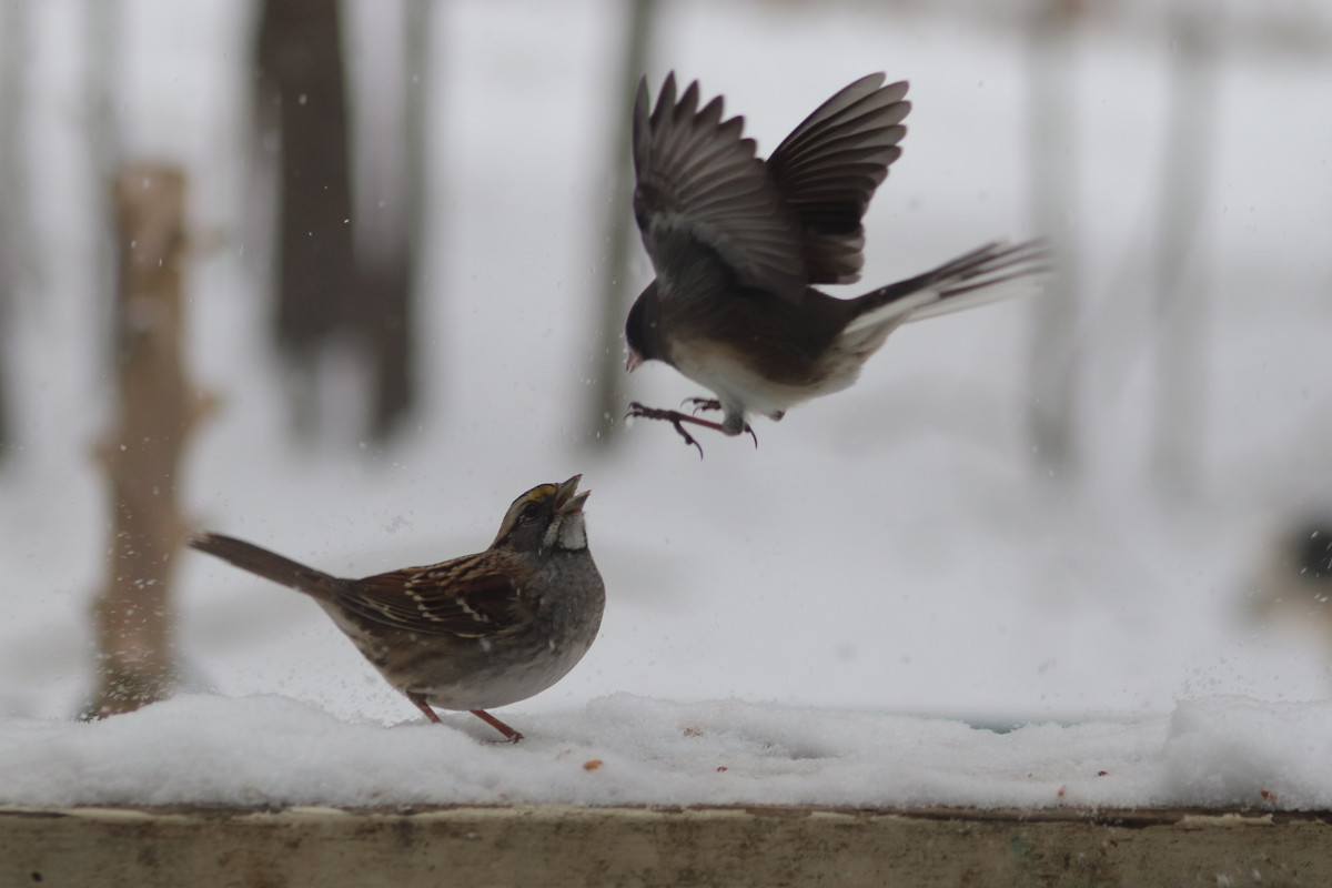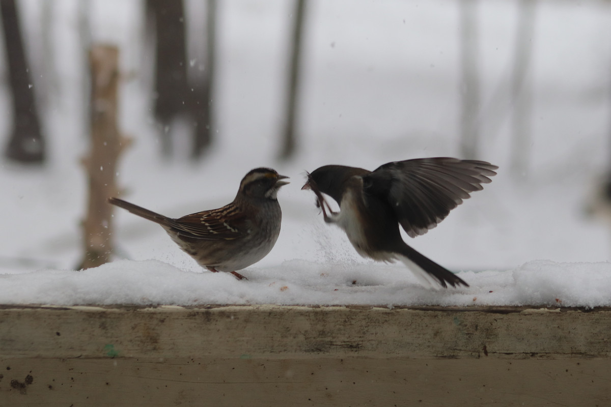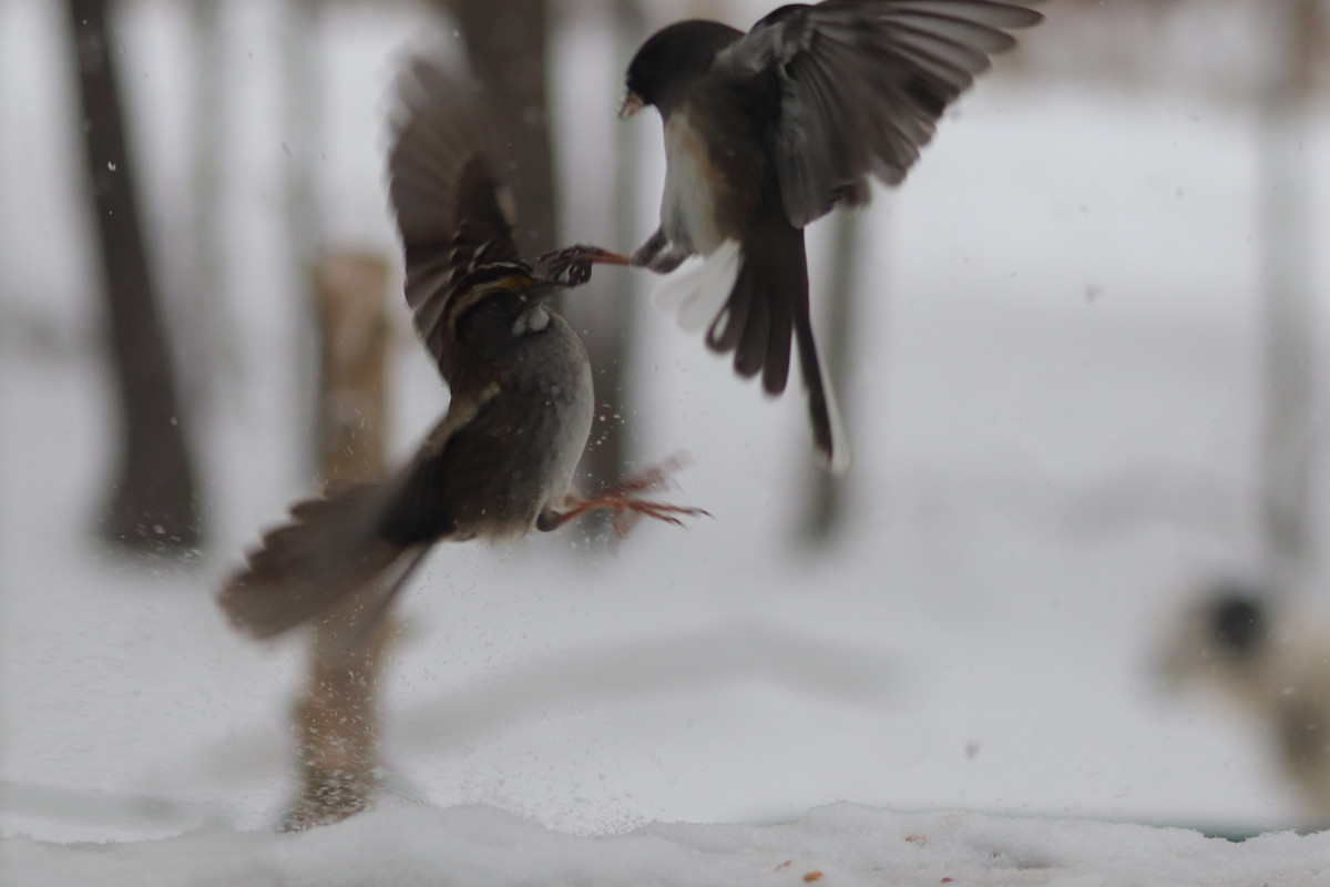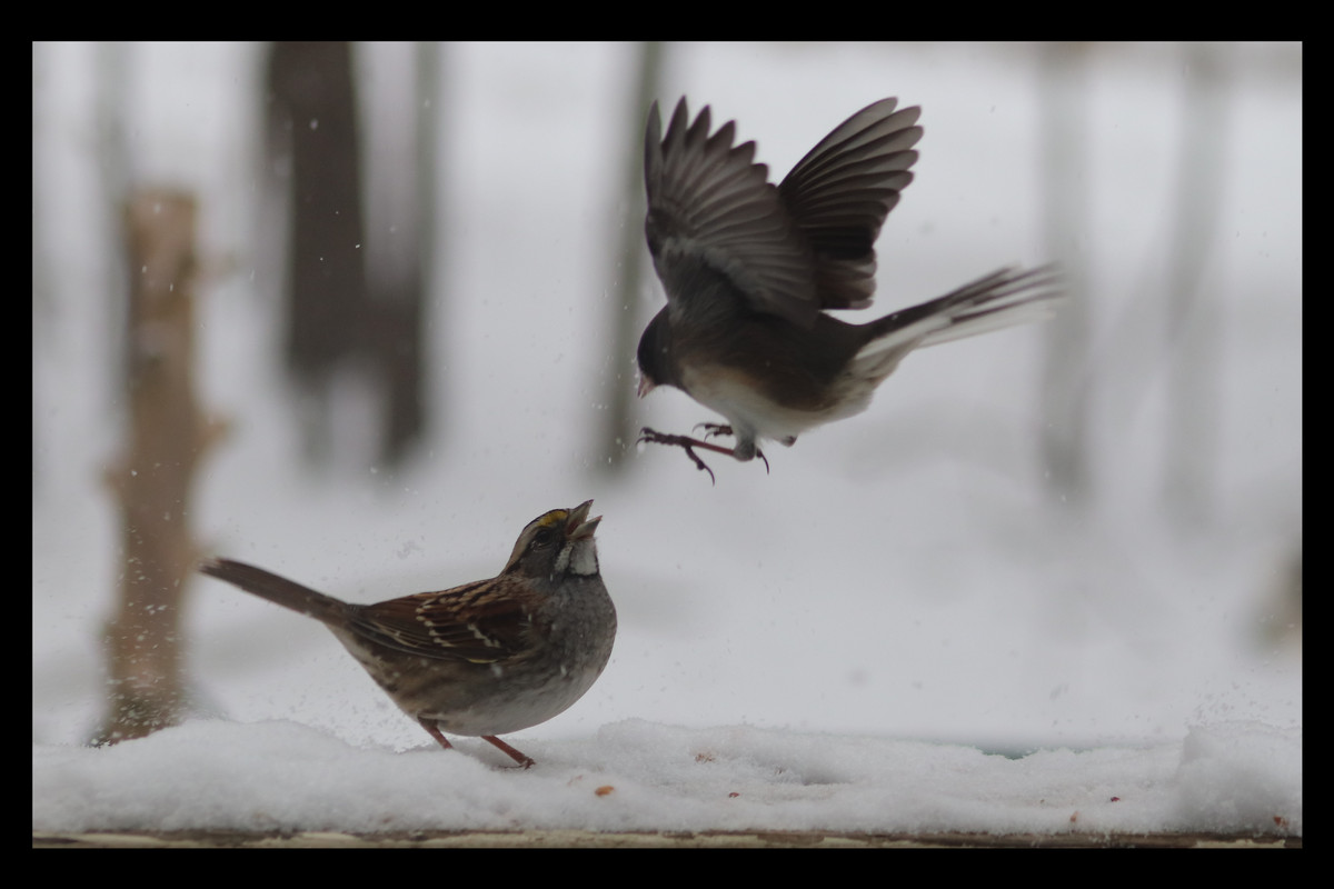 In these photos, although there is plenty of food for all, a White-Throated Sparrow and a Dark-Eyed Junco are spatting. Personally, I think it would be the Dark-Eyed Junco's fault, as they seem more inclined to disagreements and altercations. Both of these species are winter residents here in our area, and I'm sure they are blessed by the seed my children placed outside for them, even if they do choose to fight over it. Enjoy the photos!