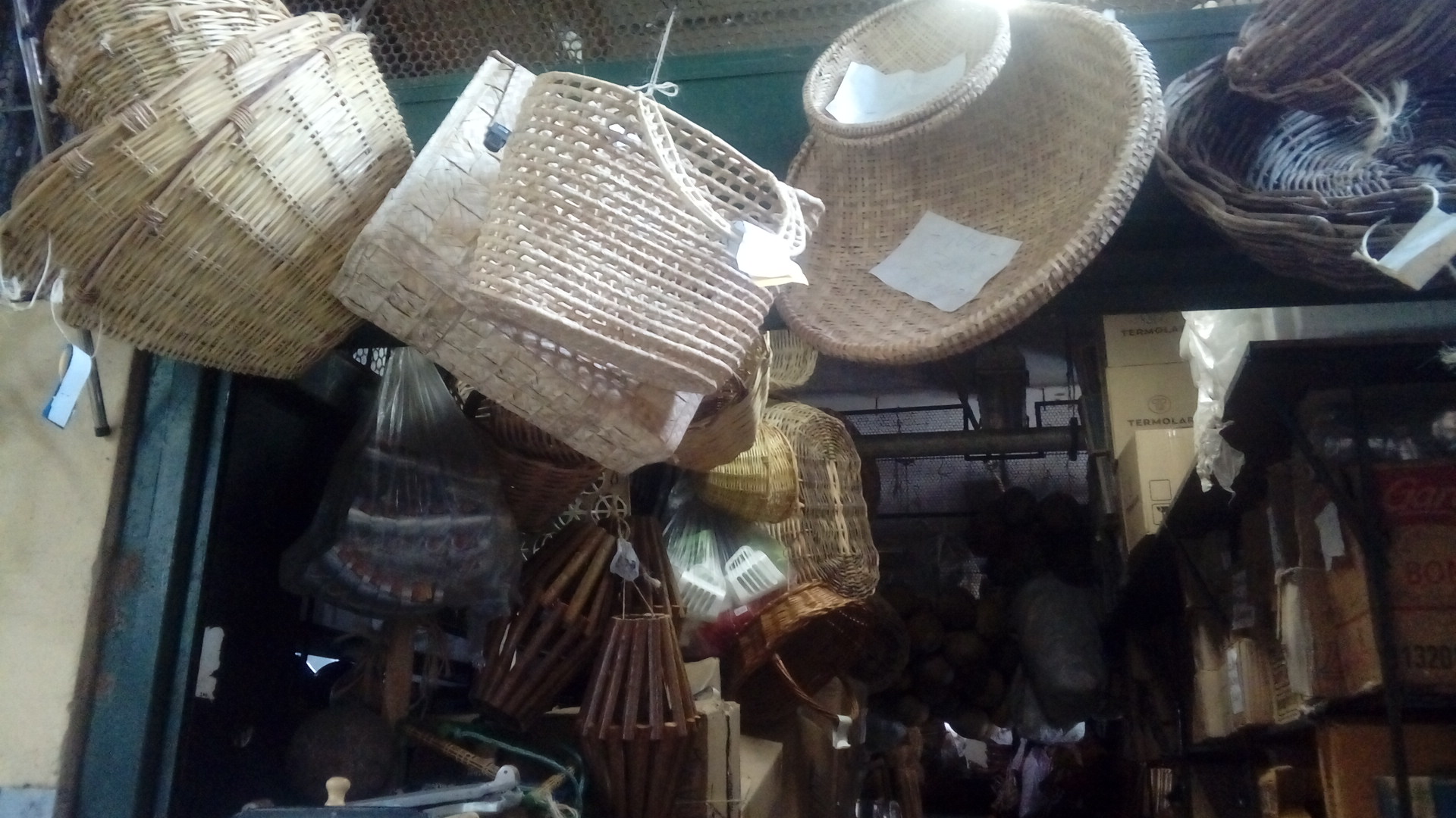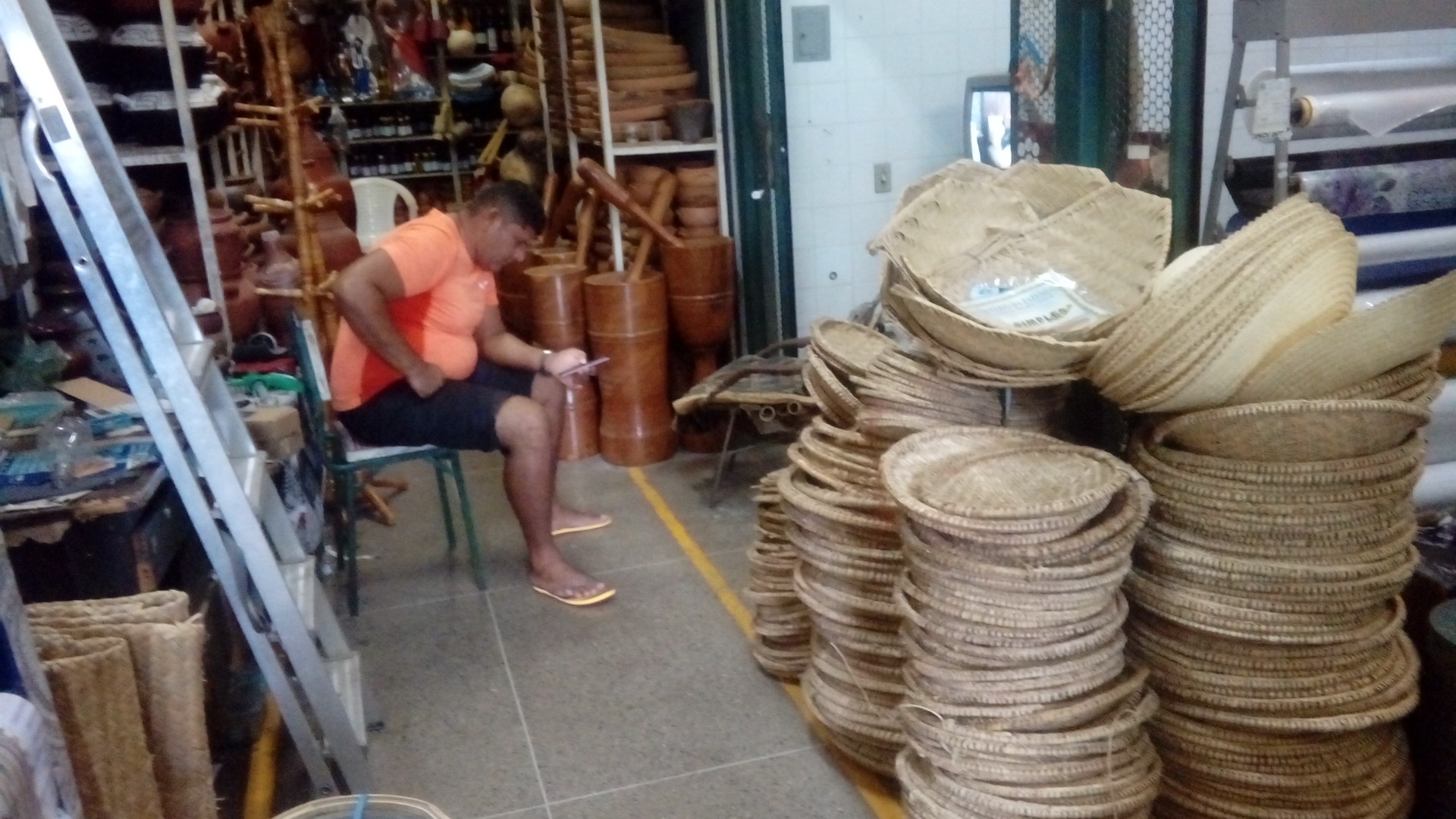 Subi ao primeiro piso onde encontrei várias lojas com artesanato de cestos em vime e palha.