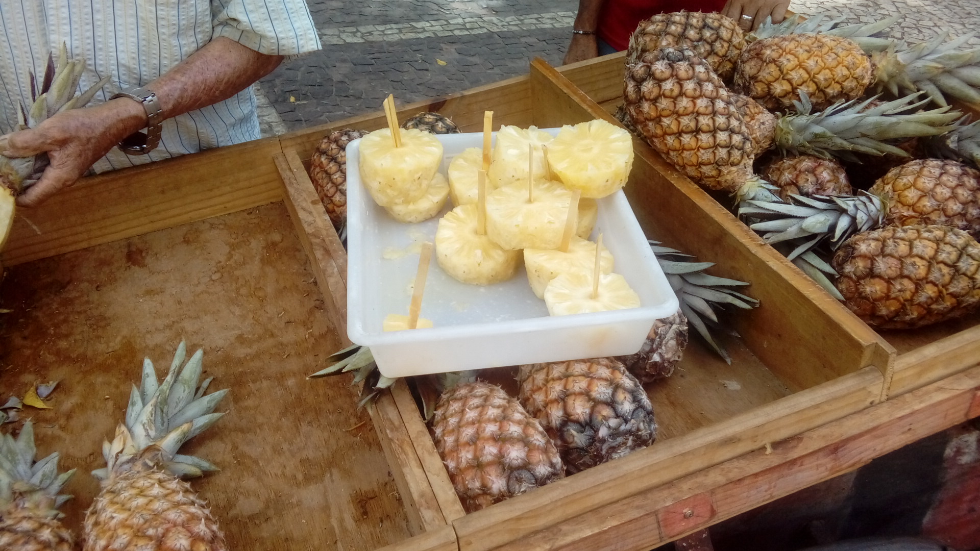 As it was near I went to the São Sebastião Market to do some shopping and just before entering I ate a generous piece of very ripe and sweet pineapple that came from the State of Paraíba.
