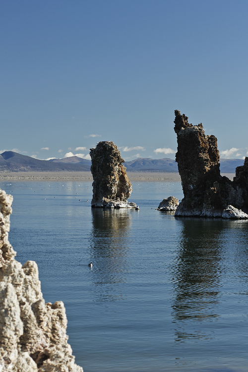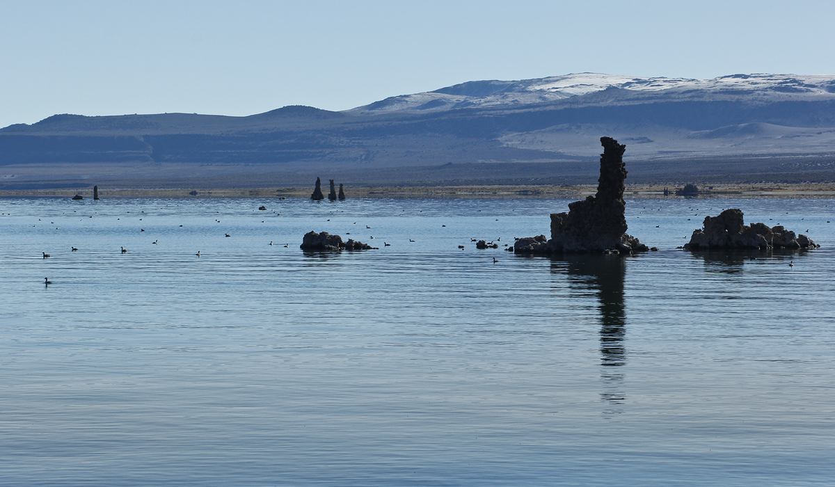 What is special about this lake? What you see at first glance: There are mighty "tufa towers", volcanic forms that jut out of the water. By supplying Los Angeles with water from the area in 1941, Mono Lake's water level dropped, the salt level increased, and the lake became alkaline. Nevertheless, this place is not dead. There are some highly adapted animals, especially brine shrimps and alkali flies. Attracted by them the lake is full of different birds. [1]