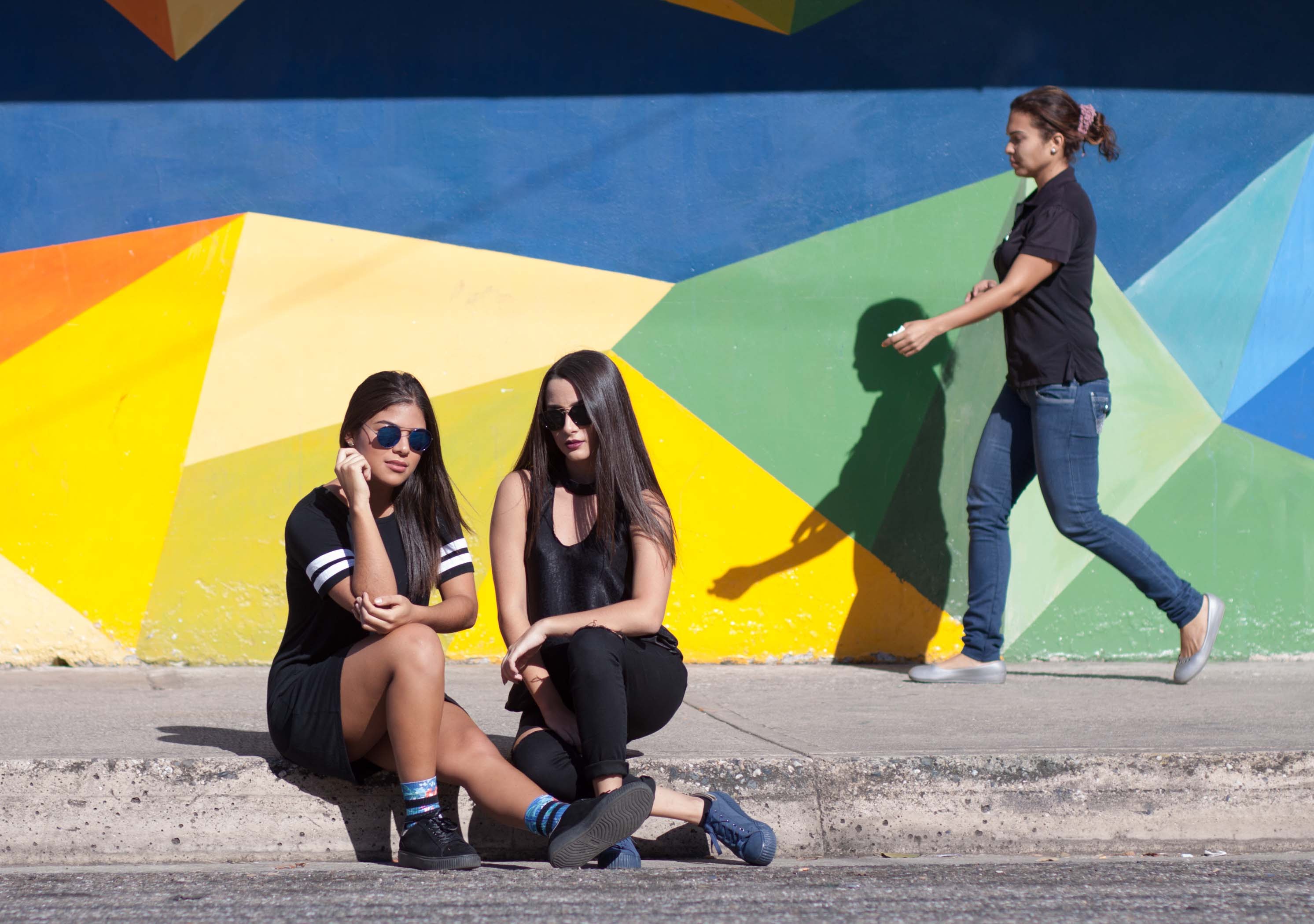 The girls wanted a sitting picture, I liked the contrast of the passers-by but they wanted to go out only with the background colors, it was difficult because a lot of people were walking by and some cars were passing through the front of my 85 mm lens.