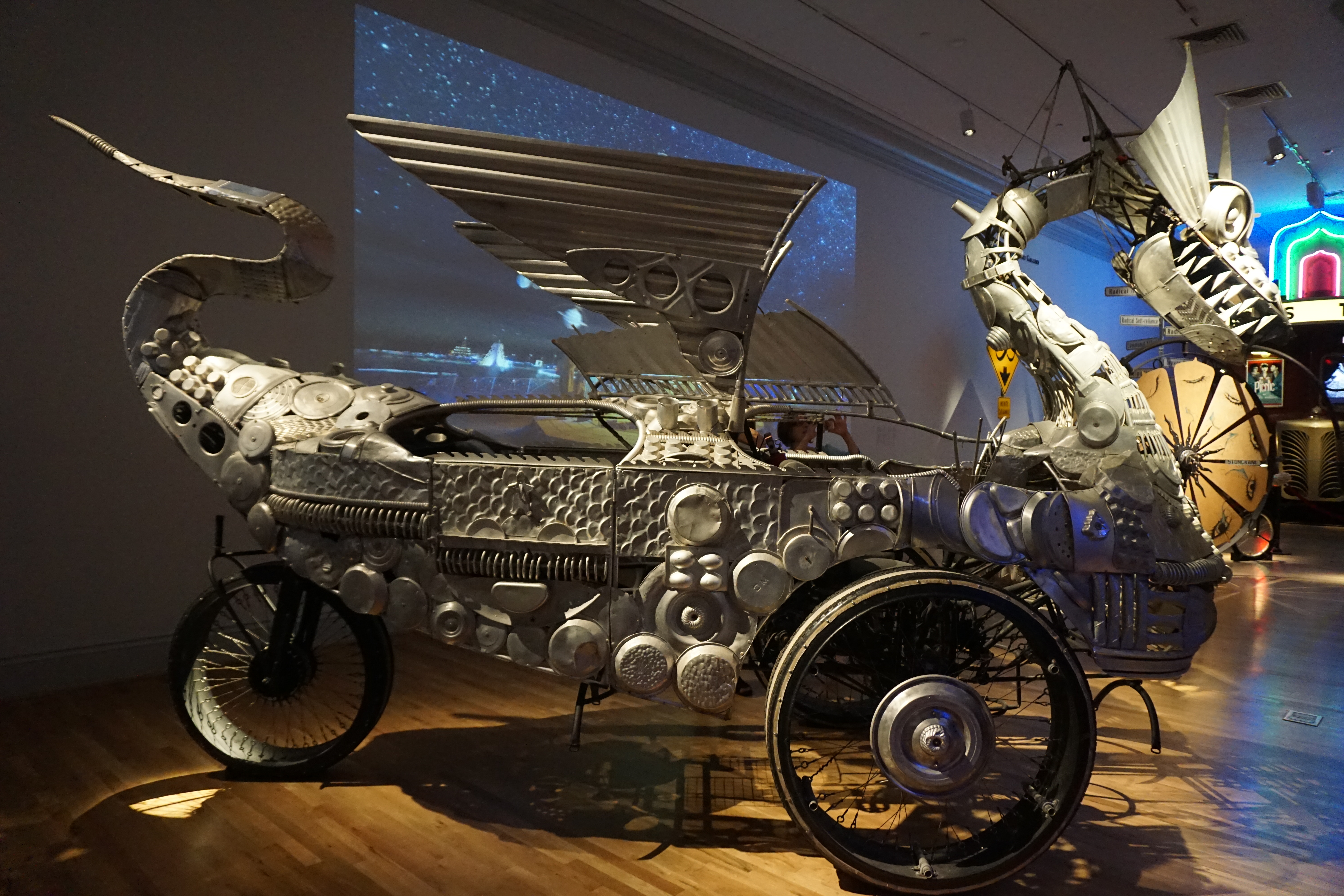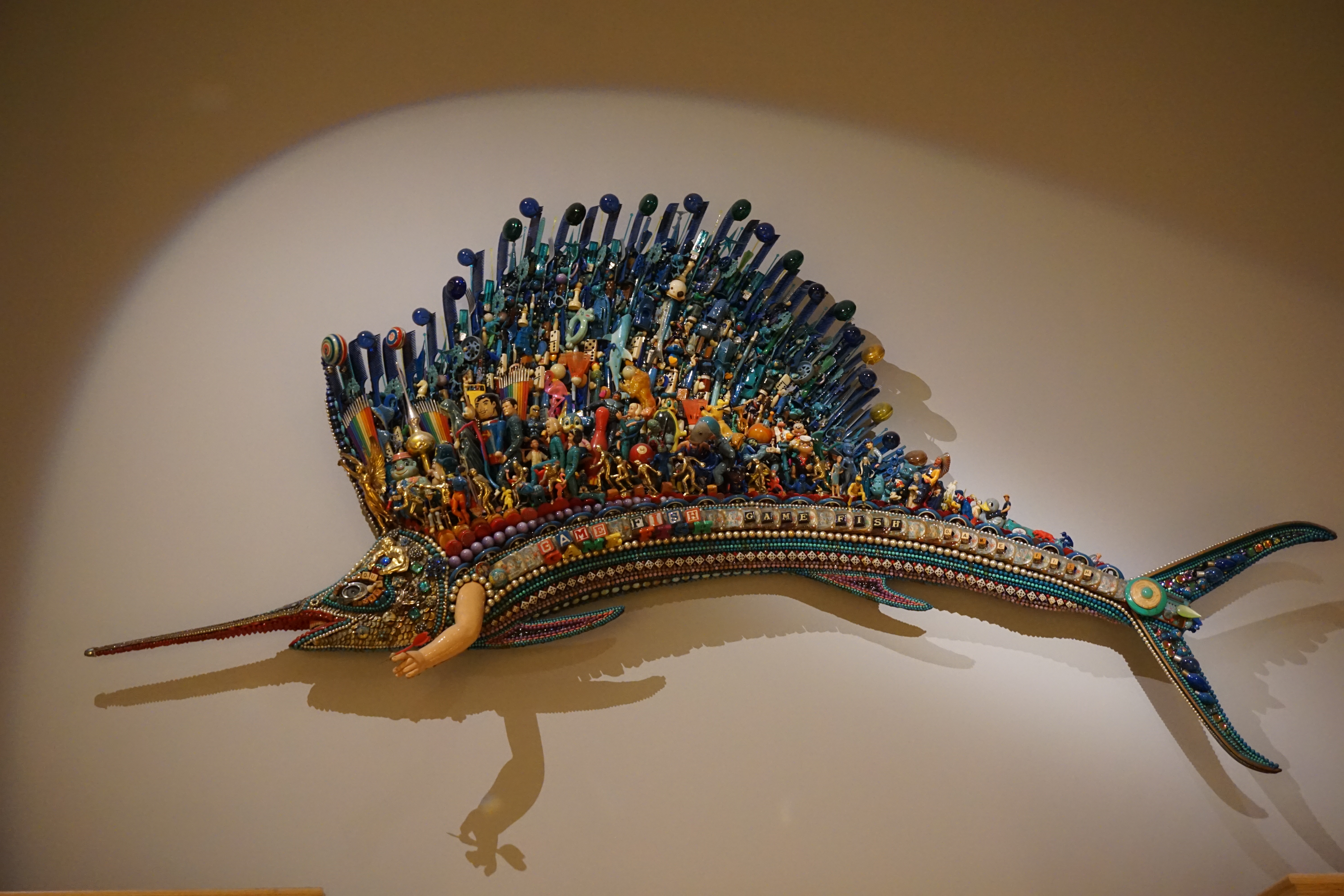 Larry Fuente's kitschy "Game Fish" sculpture. It is covered with buttons, dominoes, parts of baby doll. It is a fascinating piece in the museum.