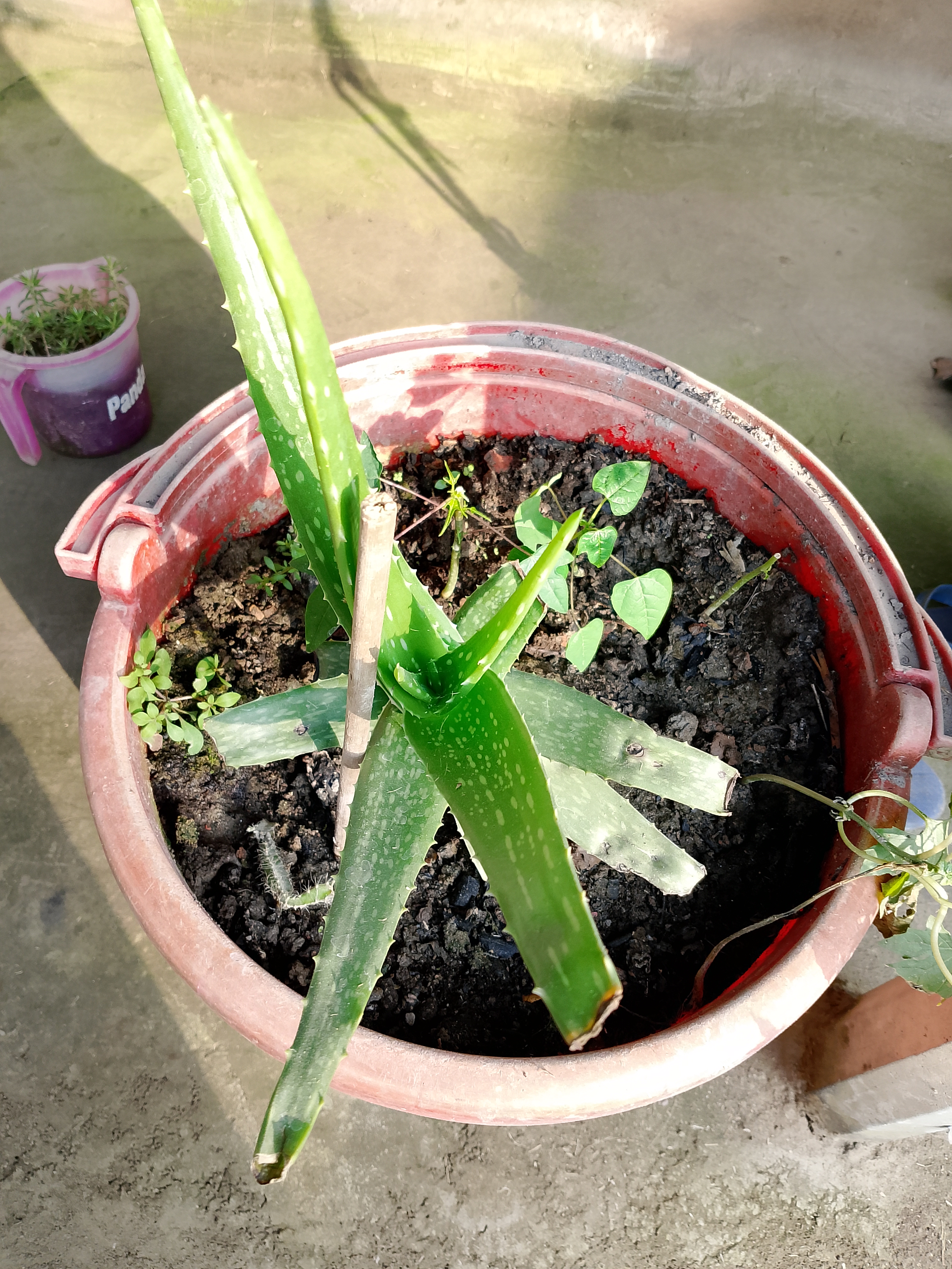 If you give too much water to the aloe vera plant, it will rot. Water it only when the soil dries. Occasionally, you can spray lime water on it. You can also give vegetable-soaked water and crush eggshells to add. It should be kept in a cool place.