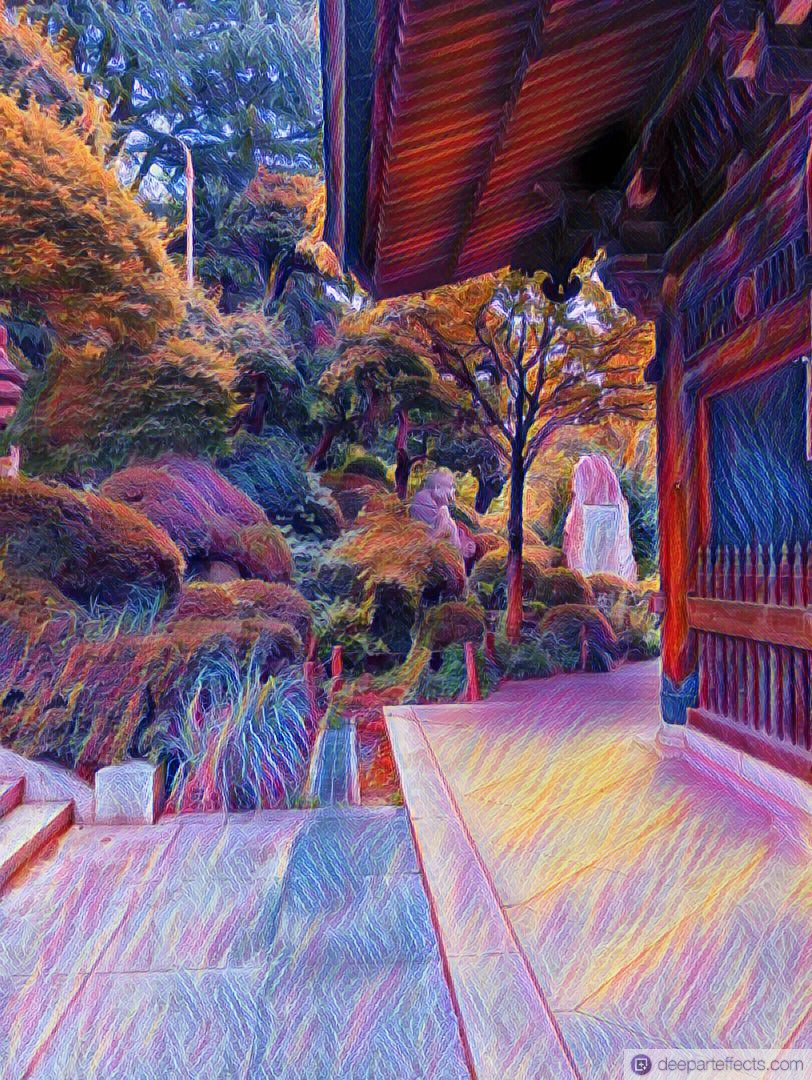 The stone statue nestled in the foliage—a figure of contemplative peace—slowly turns its head. Its features are no longer weathered rock, but grey, weeping flesh. It doesn’t speak; instead, it emits a low, vibrating hum that vibrates in your marrow. As you back away, the ornate eaves of the temple above begin to sag and melt, the dark wood stretching into long, needle-like teeth that drip a thick, black sap onto the path where you just stood.