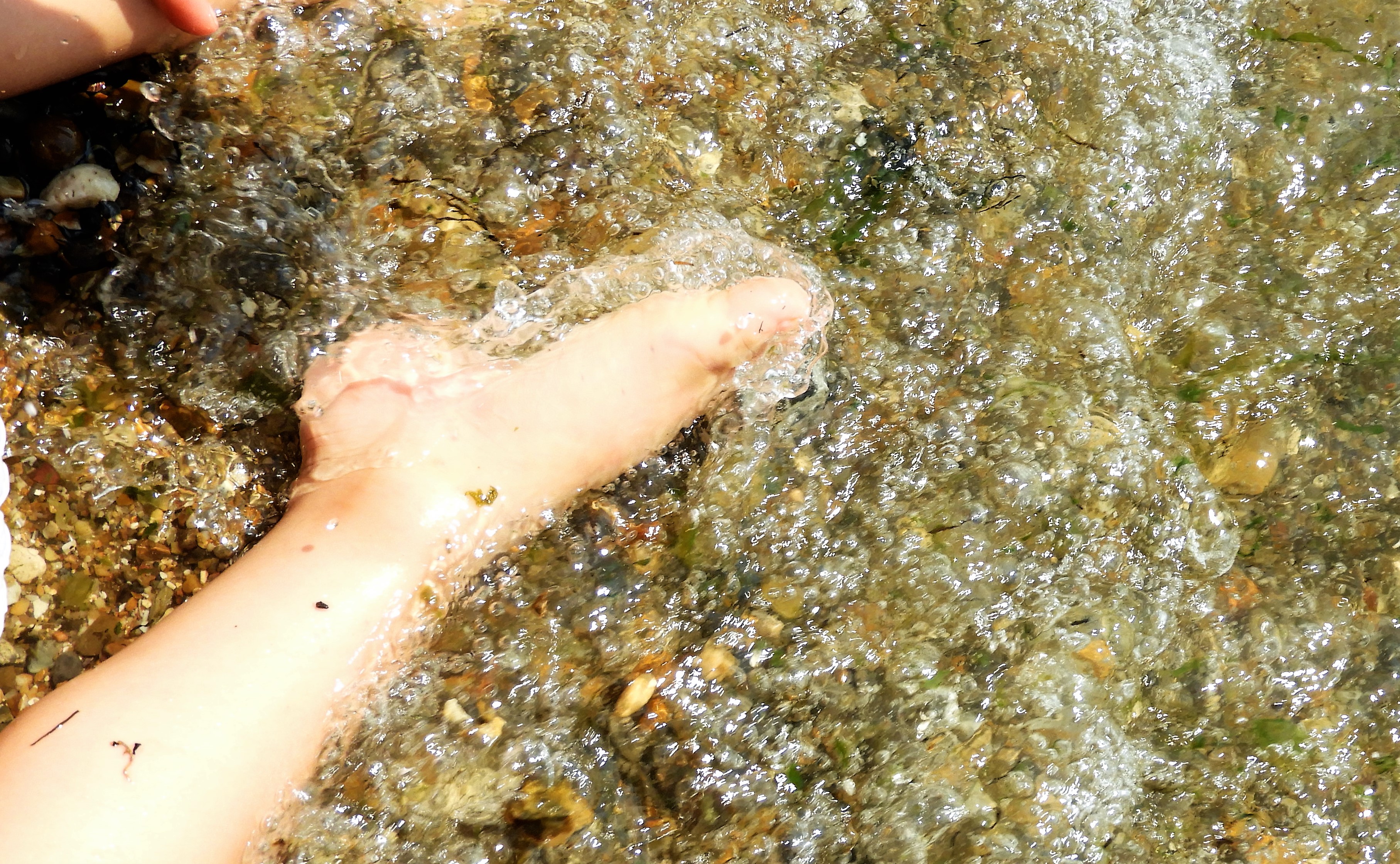 He was very scared to go near the water because, of the waves. So he was just sitting that's when I saw his feets. He did not wanted to put his feets to the sea but the sea waves came to him and made him relax.......