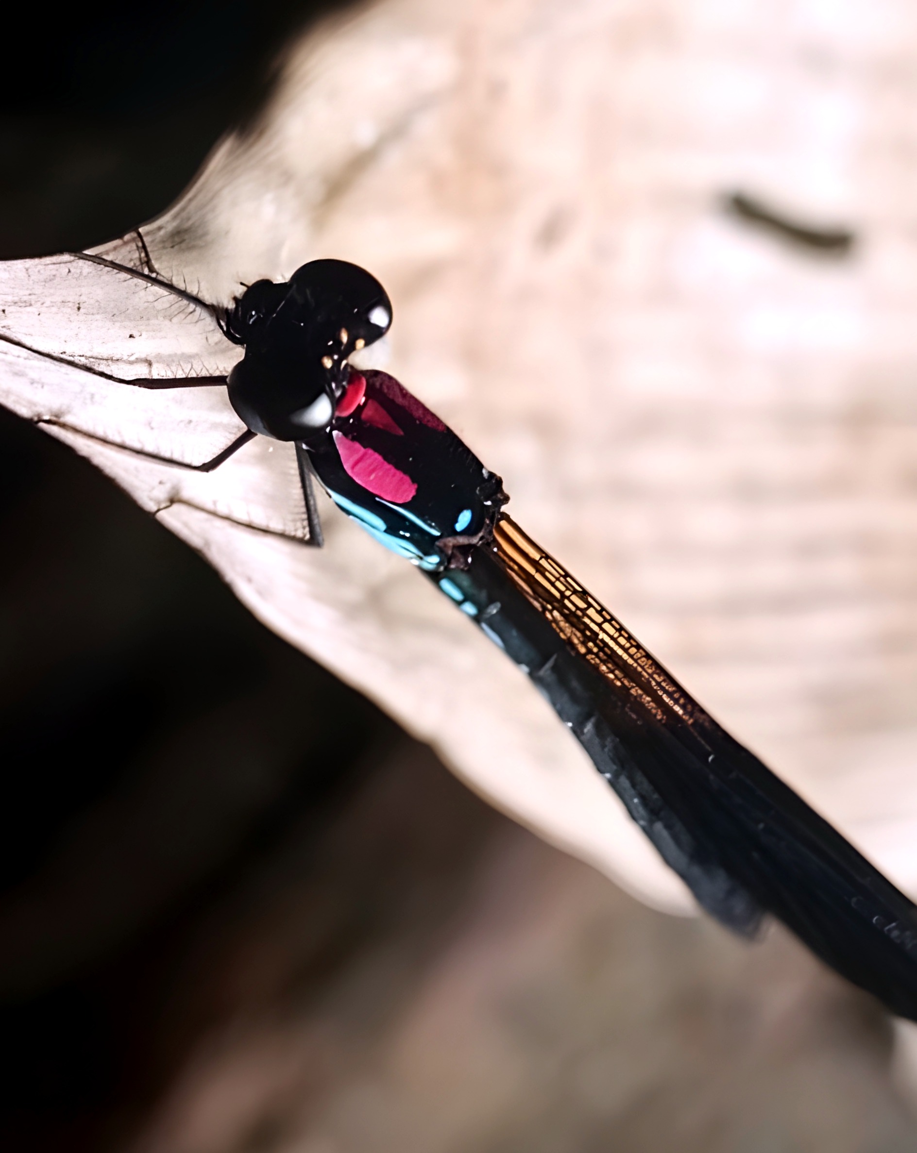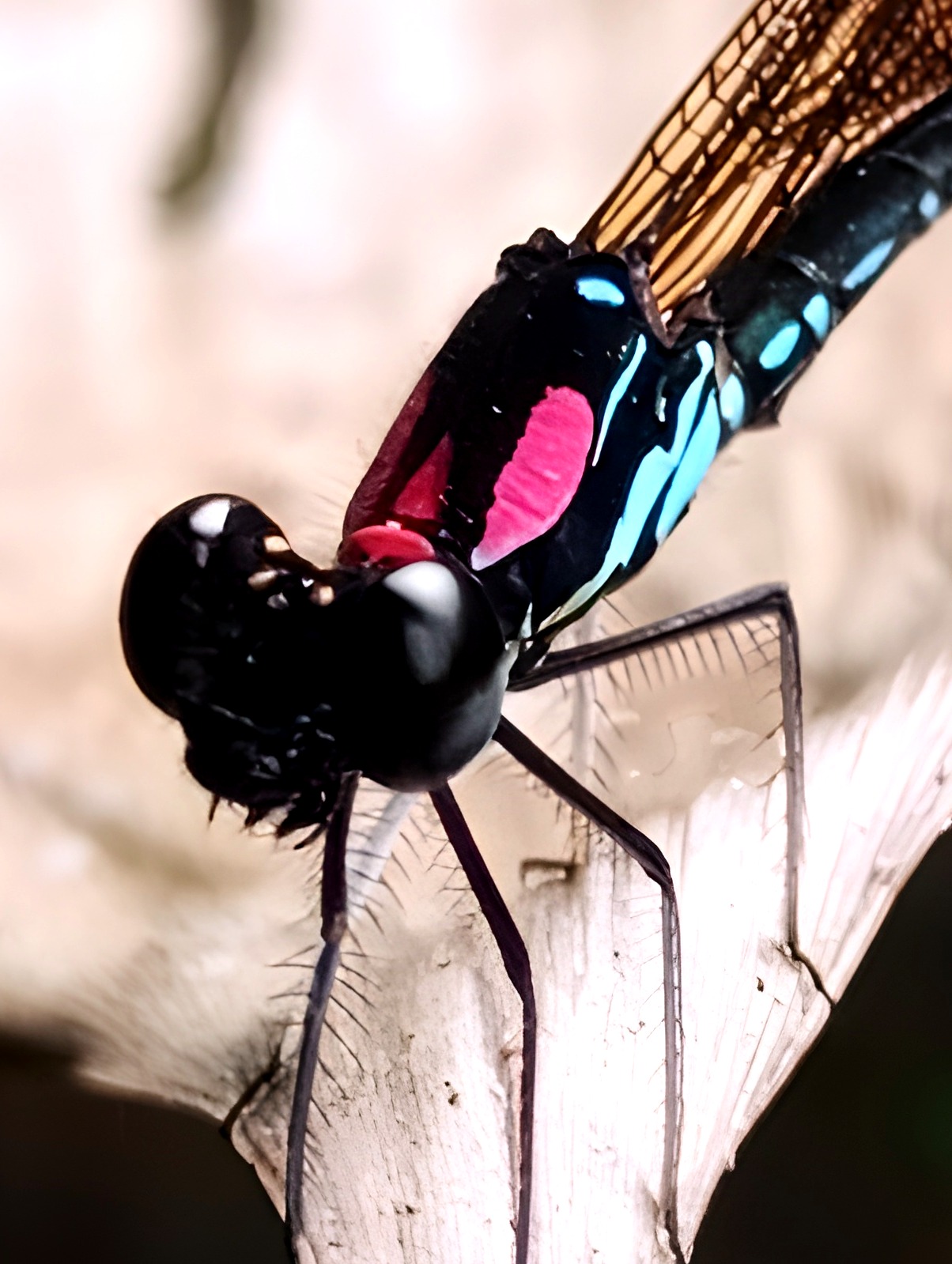 This wildlife animal is called the dragonfly, whose scientific name is Zygoptera. Dragonflies typically live in swamps or rivers with clear water. I took this photo in the river while the dragonfly was perched on a rock.