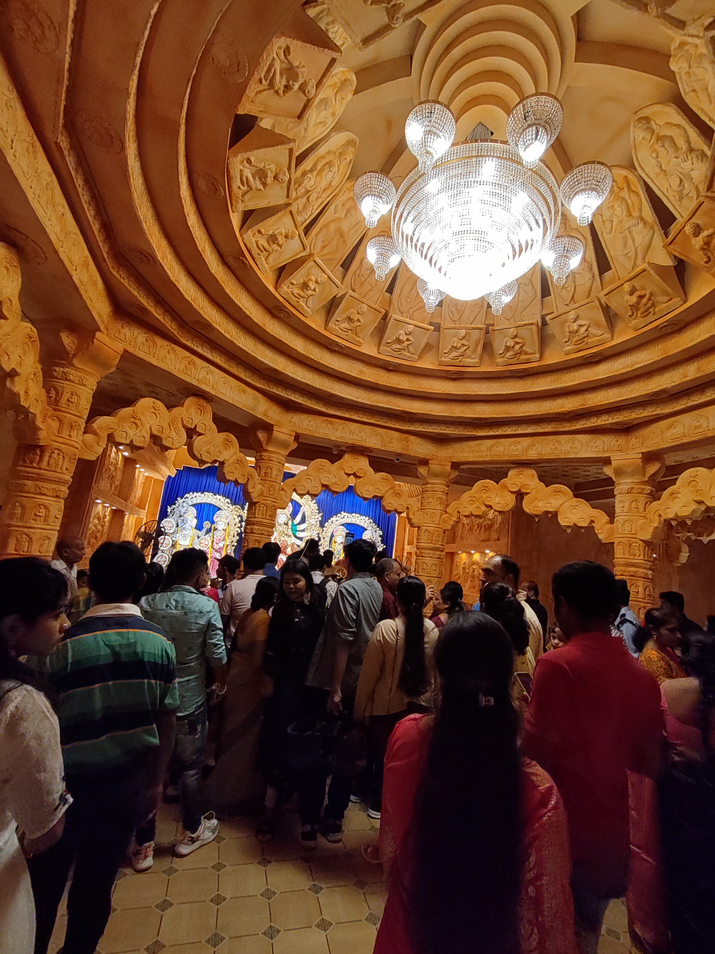 অবশেষে মণ্ডপের ভেতর। আলোক ঝলমলে স্বর্ণালী এক অপরূপ পরিবেশ ভেতরটায়। আলো আর রূপসজ্জার ছটায় চোখ যেন ঝলসে যায়। তবে দুর্ভাগ্য এক টিভি চ্যানেলের ভীড়ের কারণে দুর্গা প্রতিমার ফটো তুলতে পারলাম না। শুধুমাত্র মণ্ডপের ছবি তুলেই চলে এলুম।