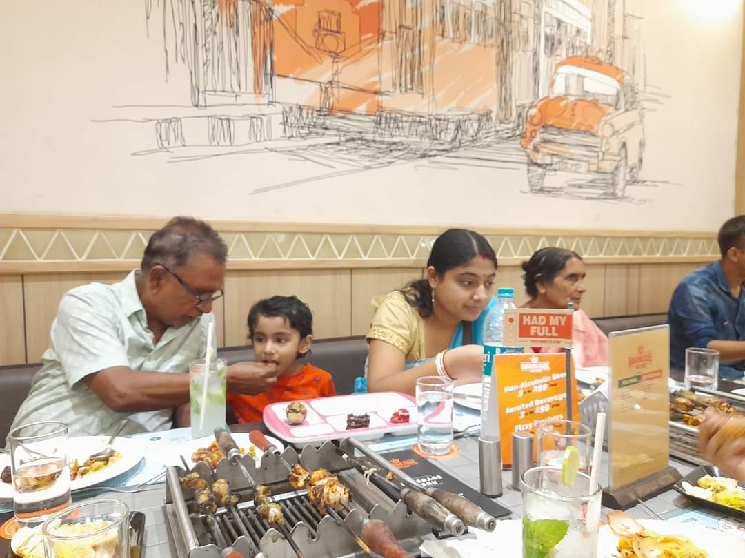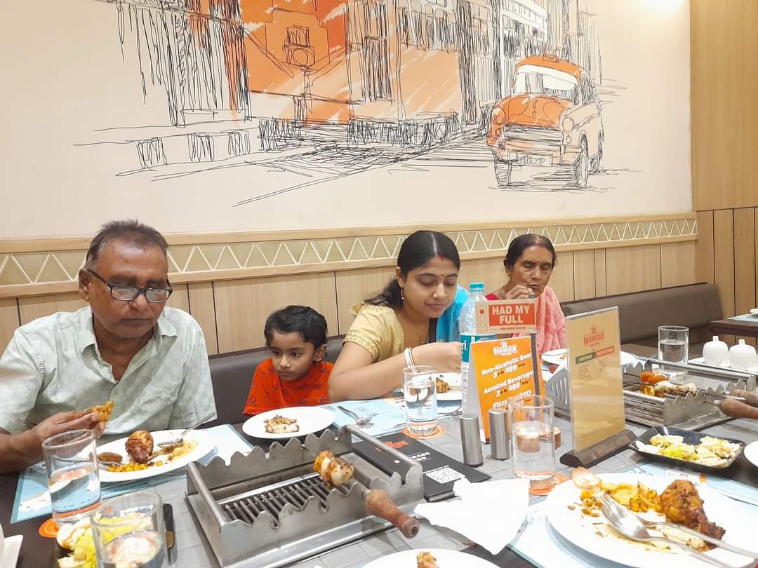 আমার বাড়ির একদম কাছে একটা বুফে রেস্তোরাঁ আছে । নাম বারবিকিউ নেশান'স । মাঝে মাঝে যাই আমরা সপরিবারে । আমি আবার বাইরের খাবার খাই না মোটেও । তবে, এই রেস্তোরাঁর নাম ডাক আছে এবং এদের খাবার সহ্য হয় খেয়ে । এই তো গত সপ্তাহেই আমি আমার বাবা, মা, ভাই, মামাতো ভাই, তনুজা আর টিনটিনবাবু মোট ৬ জন গেলাম বুফেতে ।