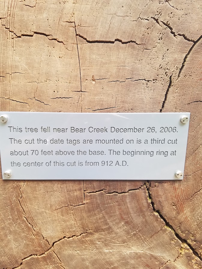 At the visitor Center, they have the remnants of a 1,000 year old tree. The growth rings are very small, but they have mapped out to the year, when this tree was born, the when it fell down.