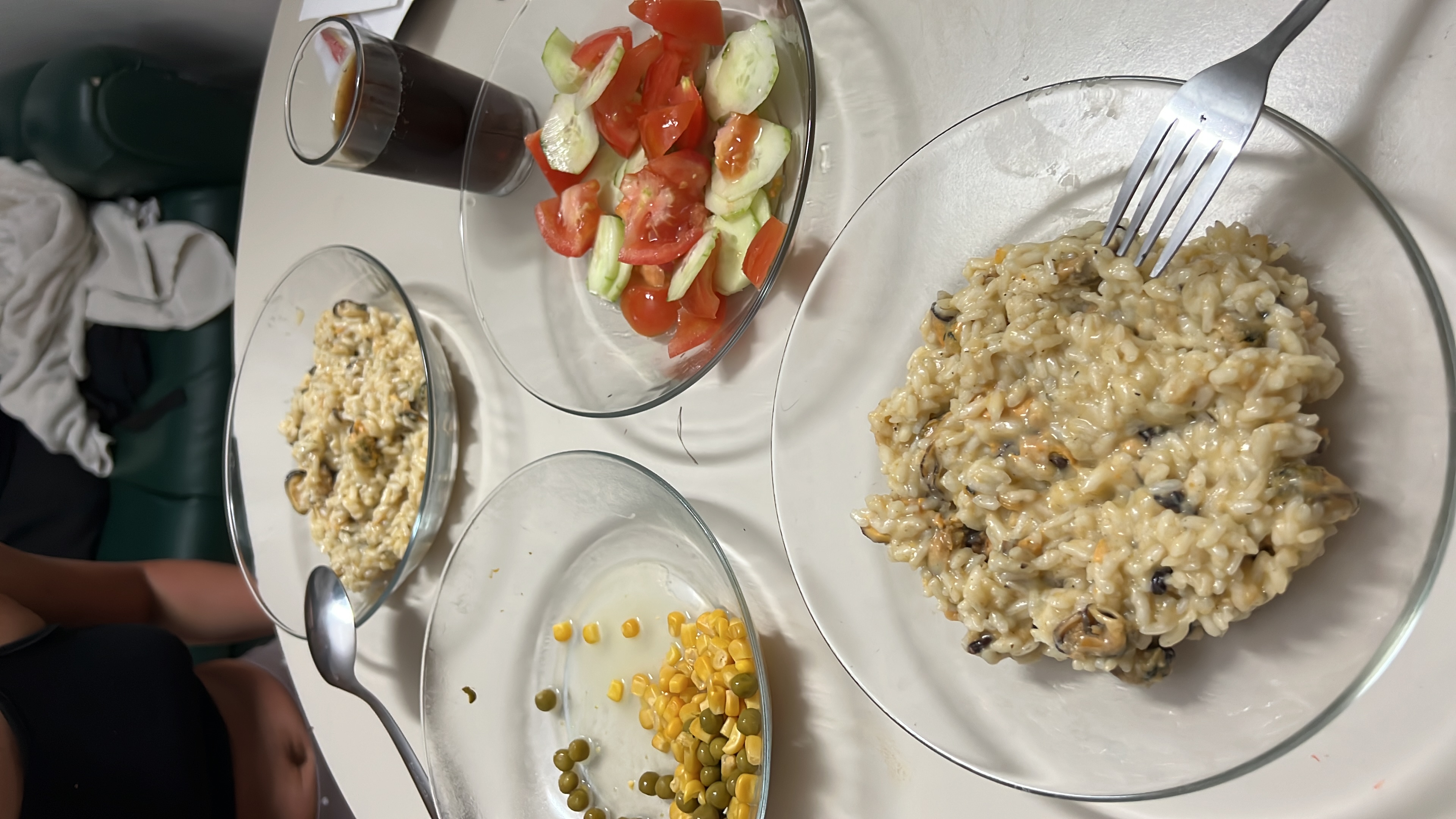 Prepared mushroom rissoto with seafood, and it was delicious. After we knew it we ate the whole thing. Piggies 😂