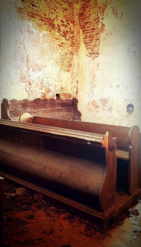 Inside the chapel, there were benches, a confessional and a modest cross.