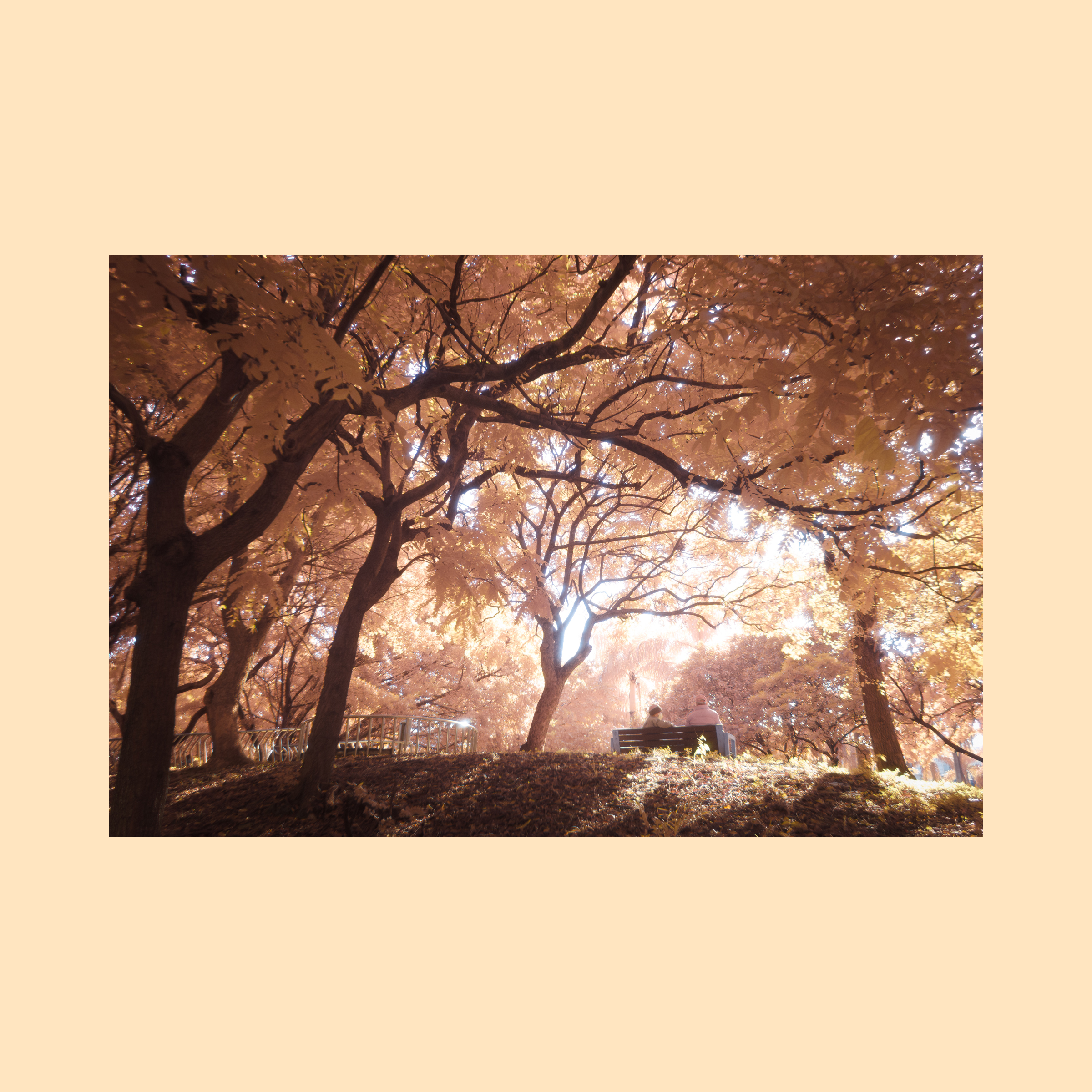 Photo from a self-converted full-spectrum digital camera whereby I disassembled the sensor assembly and removed the filters blocking out light from the infrared spectrum. When taking the photo, I used a blue-filter to get yellow-ish leaves from the converted camera. The actual trees were green when I took this photo.