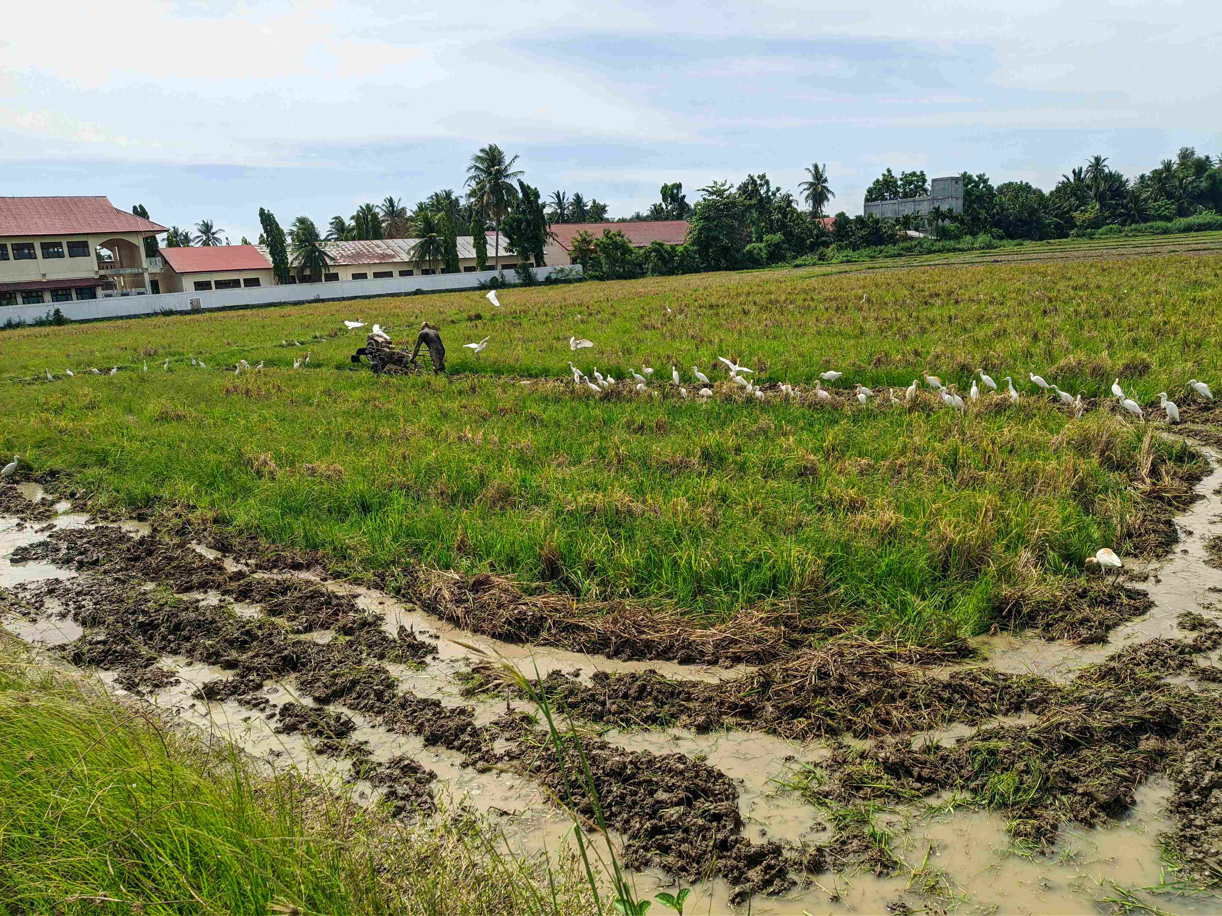 Seperti terlihat dalam foto, hubungan tukang traktor sawah dan burung bangau sangat dekat seperti seorang teman yang selalu setia menemani disetiap perkerjaannya.