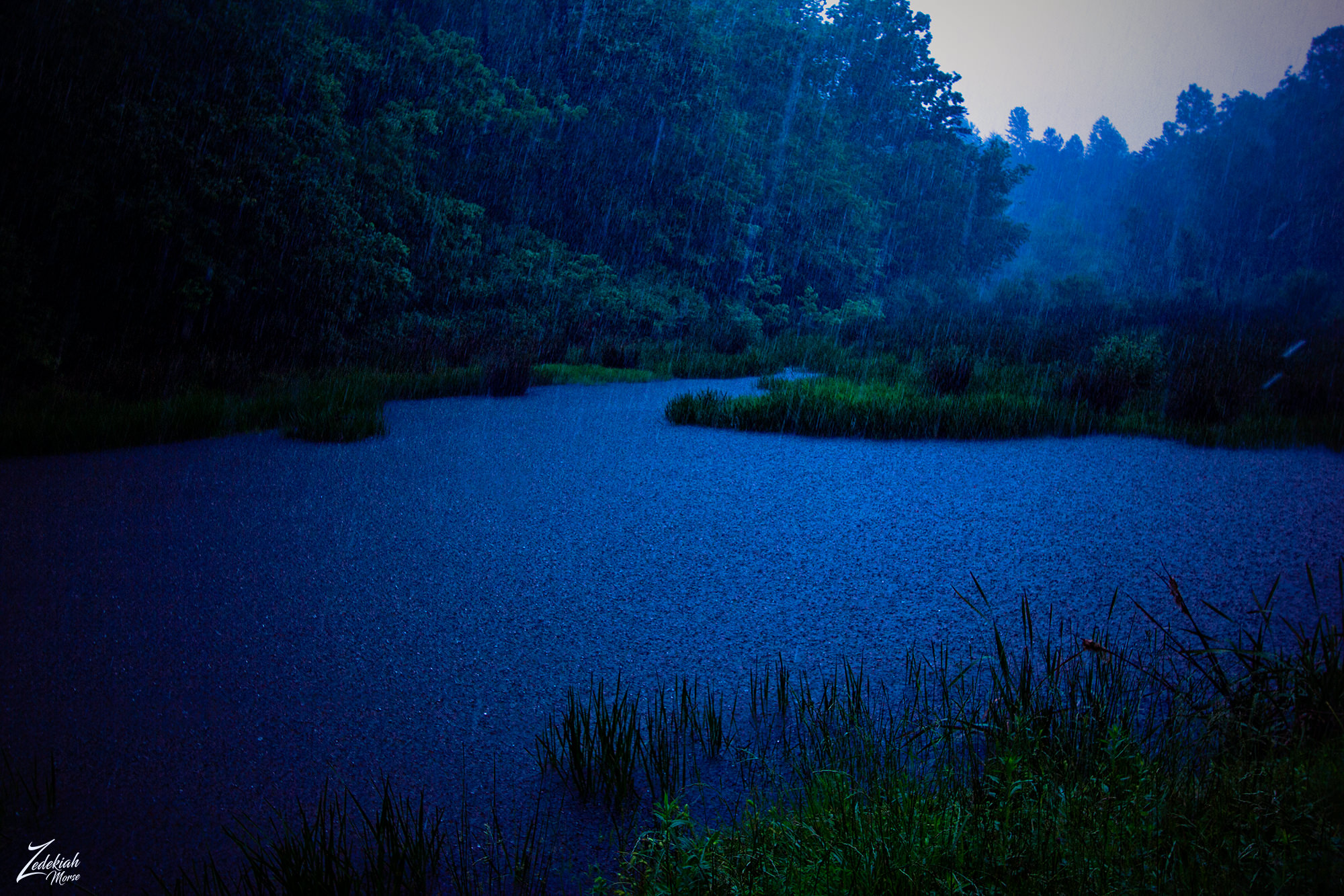 Tranquil Pond Awaits the Storm ~ Click to EnlargeThe rain came almost instantly! It is as though a giant bucket let loose in the sky above. The intensity of the pouring rain mixed with the thunderous claps was tremendous as lightning struck all around the mountain and valleys below. The wind started howling as well and it was everything I could do to stand in the rain and get any images... but I was able to capture the intensity of the rain across the surface of this pond.