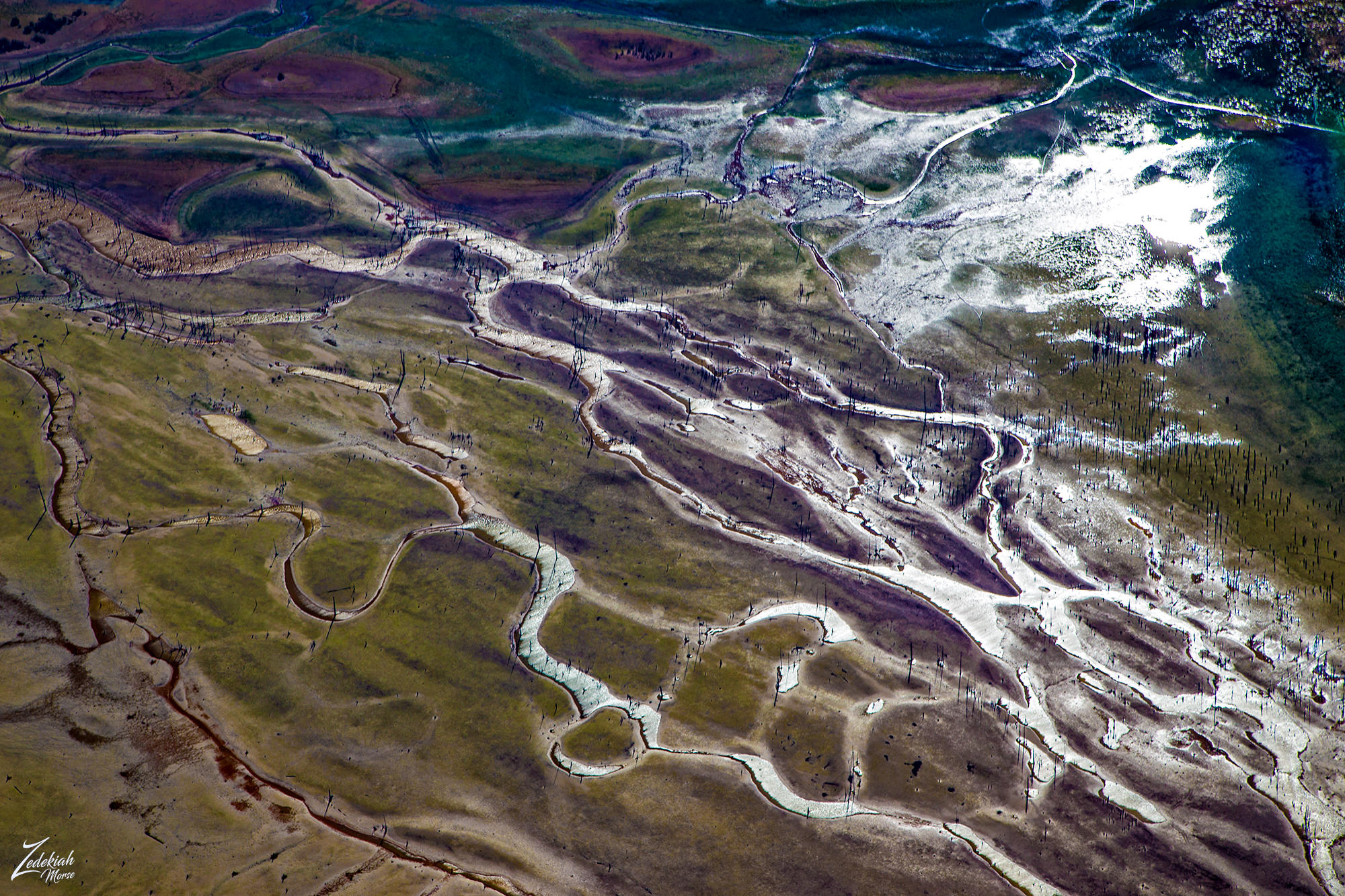 Little Tallahatchie River & Ambrosial Wetlands ~ Click to EnlargeThe different vibrant colors are due to a combination of me flying above this area and shooting it early in the morning, during the fall, which gives it some of its color. And the different colors of the various types of pond scrum such as floating macroscopic plants, floating cyanobacteria (blue-green algae), euglena and other flagellated algae, diatom blooms, filamentous green algae and zooplankton scums. (Research Source)