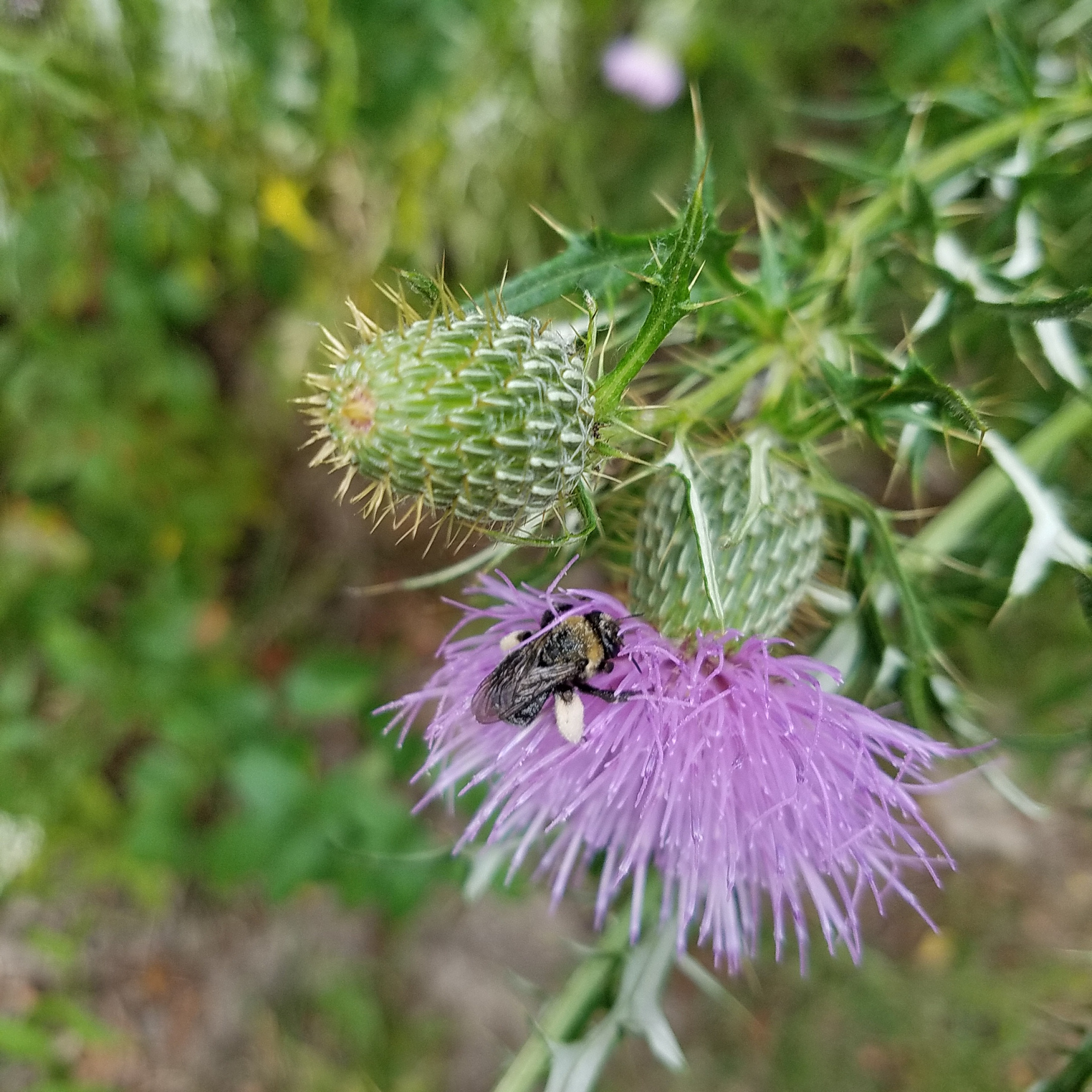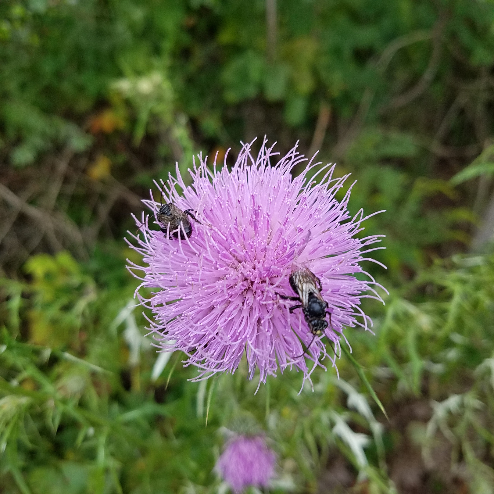 Soon after that we came to an opening where the trees opened up to a small field of tall grass and wild flowers. Here my daughter and I took quite a few pictures of flowers and bees (I'm trying to convincer her to post on steemit too). The flowers were out in the open with the sun beating down on them. They were covered with all kinds of insects, from beetles to bees. I found at least three kinds of bees, including bumble bees, honey bees, and some sort of black bee or wasp, all fluttering around busily from flower to flower.
