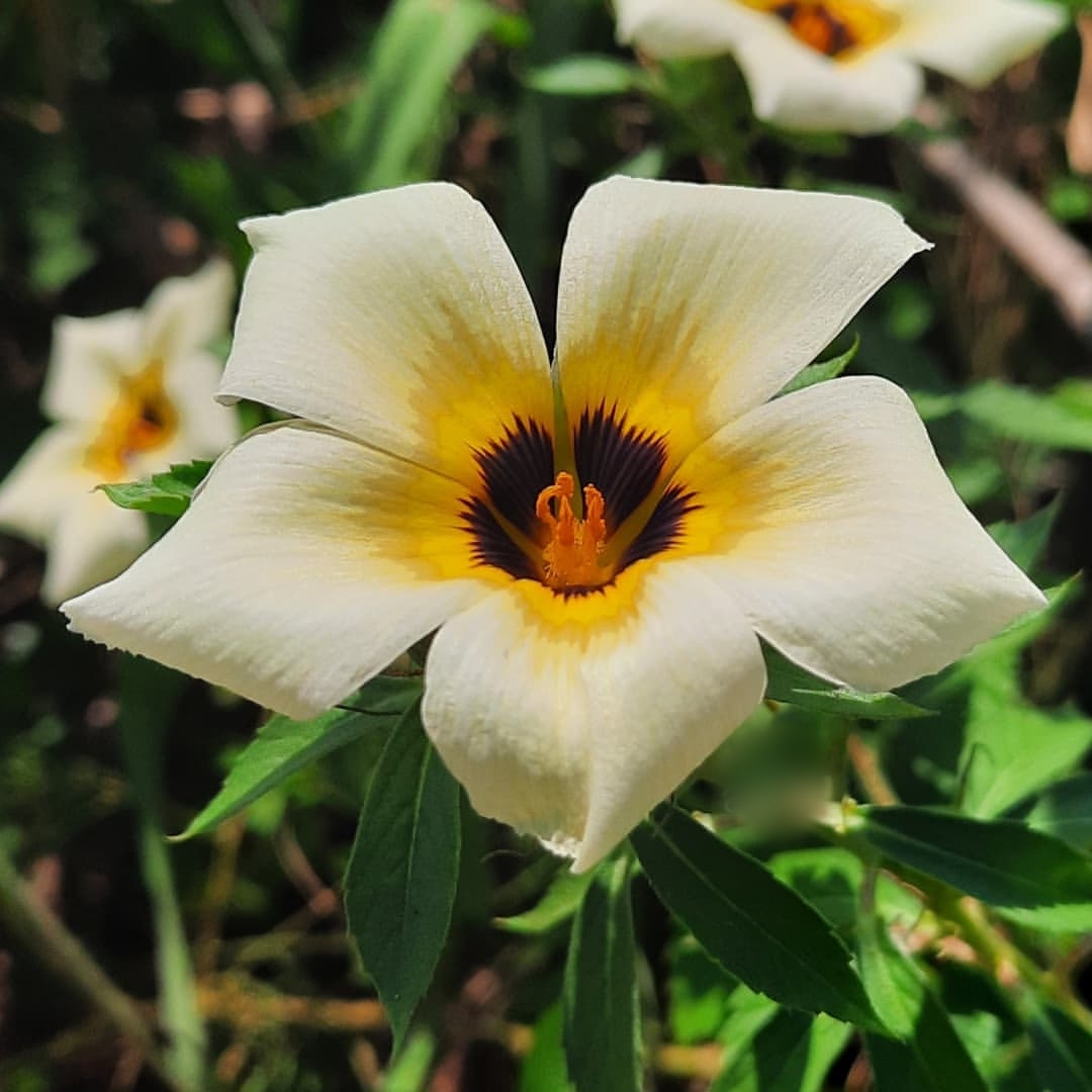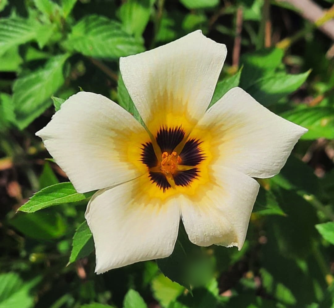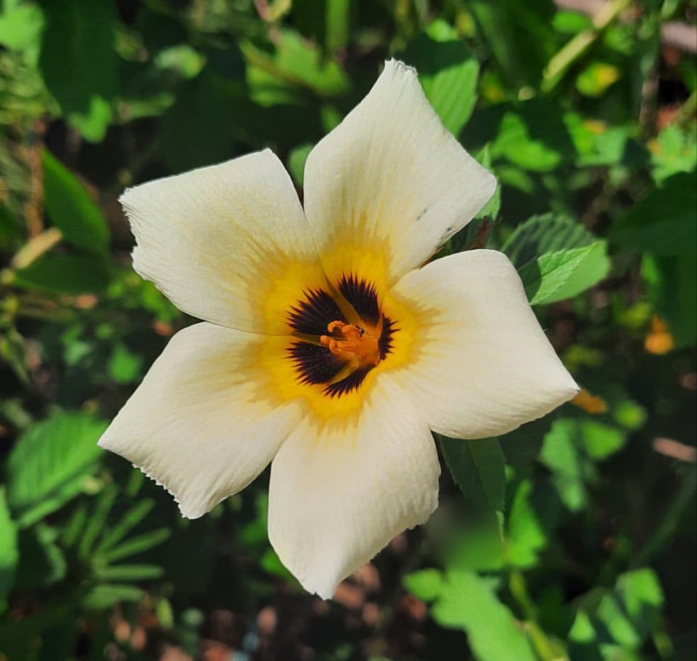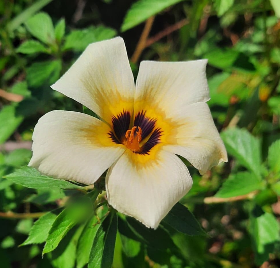 Turnera subulata is easily recognized by its delicate, creamy-white to pale yellow flowers with a striking dark brown to purplish center, creating a mesmerizing contrast. The flower resembles a small cup, often compared to buttercups, and blooms profusely, making the plant highly ornamental. Here are some key features: