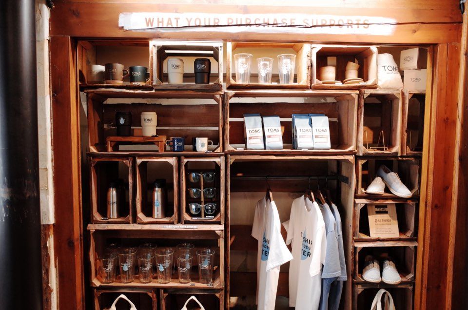 저희가 탐스에서 구매하는 티셔츠, 백팩, 원두 등이