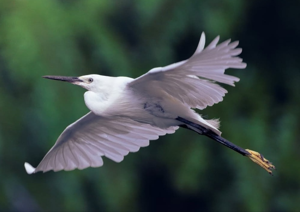 The Little Egret is a small, elegant heron with striking white plumage, long black legs, and bright yellow feet that often stand out when it stalks fish in the water. Its black, slender bill is perfectly adapted for snatching prey, while during breeding season, it grows beautiful, wispy plumes on its back and chest that sway like fine silk in the breeze.