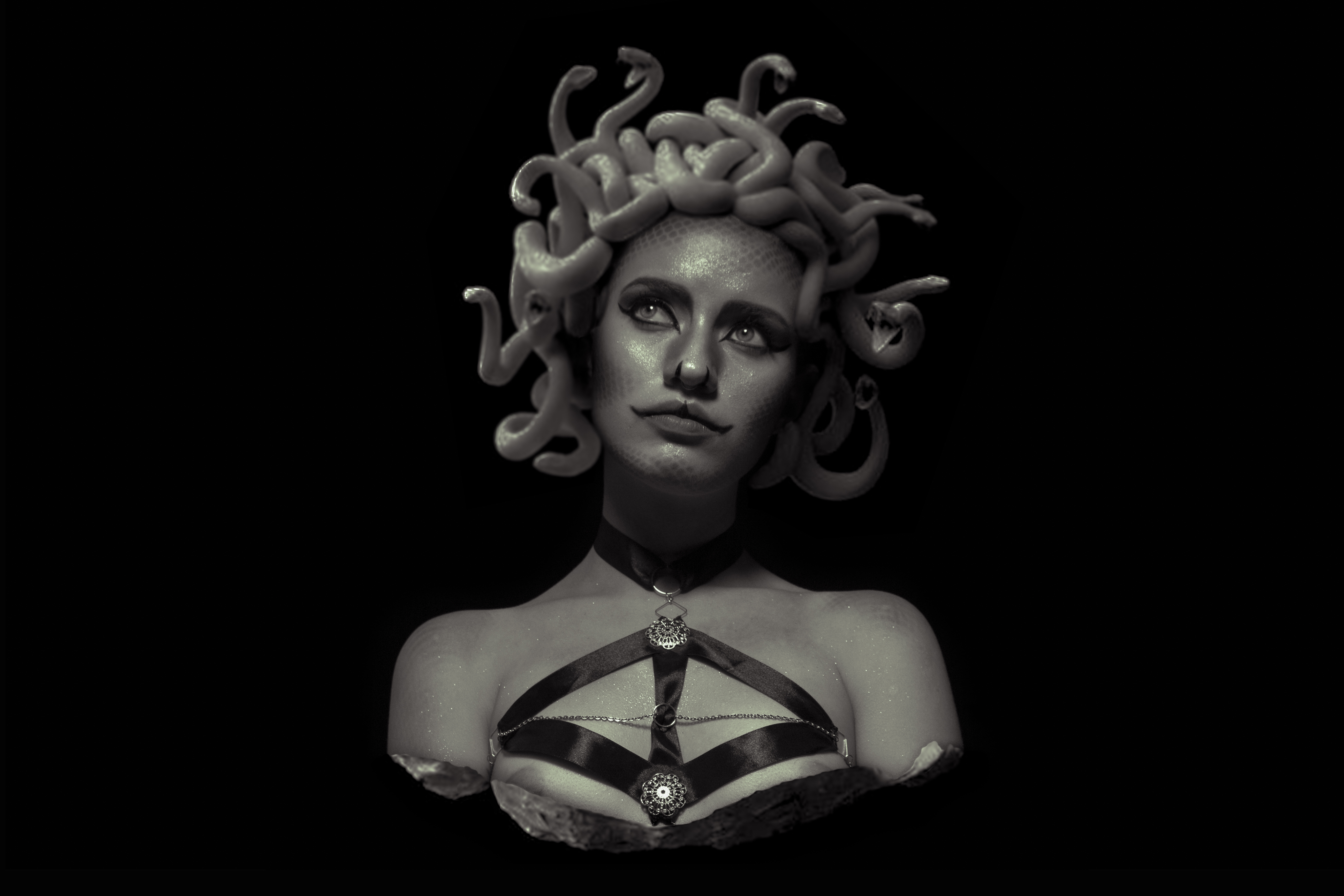 And finally we have Medusa, the most famous of the Gorgons. This had the disadvantage of being a mortal and the most beautiful of the three sisters. Medusa was part of the priestesses in the temple of Athena (goddess of war), when he knew that Poseidon (the god of the seas) was trying to seduce her, she ran to the temple seeking the protection of Athena, but did not attend his call, allowing Poseidon rapes her. Medusa was later punished by Athena, turning her into a monster with a look that could petrify anyone who saw her in the eye. As we know, Perseus was charged to behead her to use her head as a weapon. In this last image we wanted to represent her as an exotic woman, beautiful and with a torso of marble. I hope that the edition and the effort that we put in these images are to your liking. I remain attentive to your comments and positive reviews.