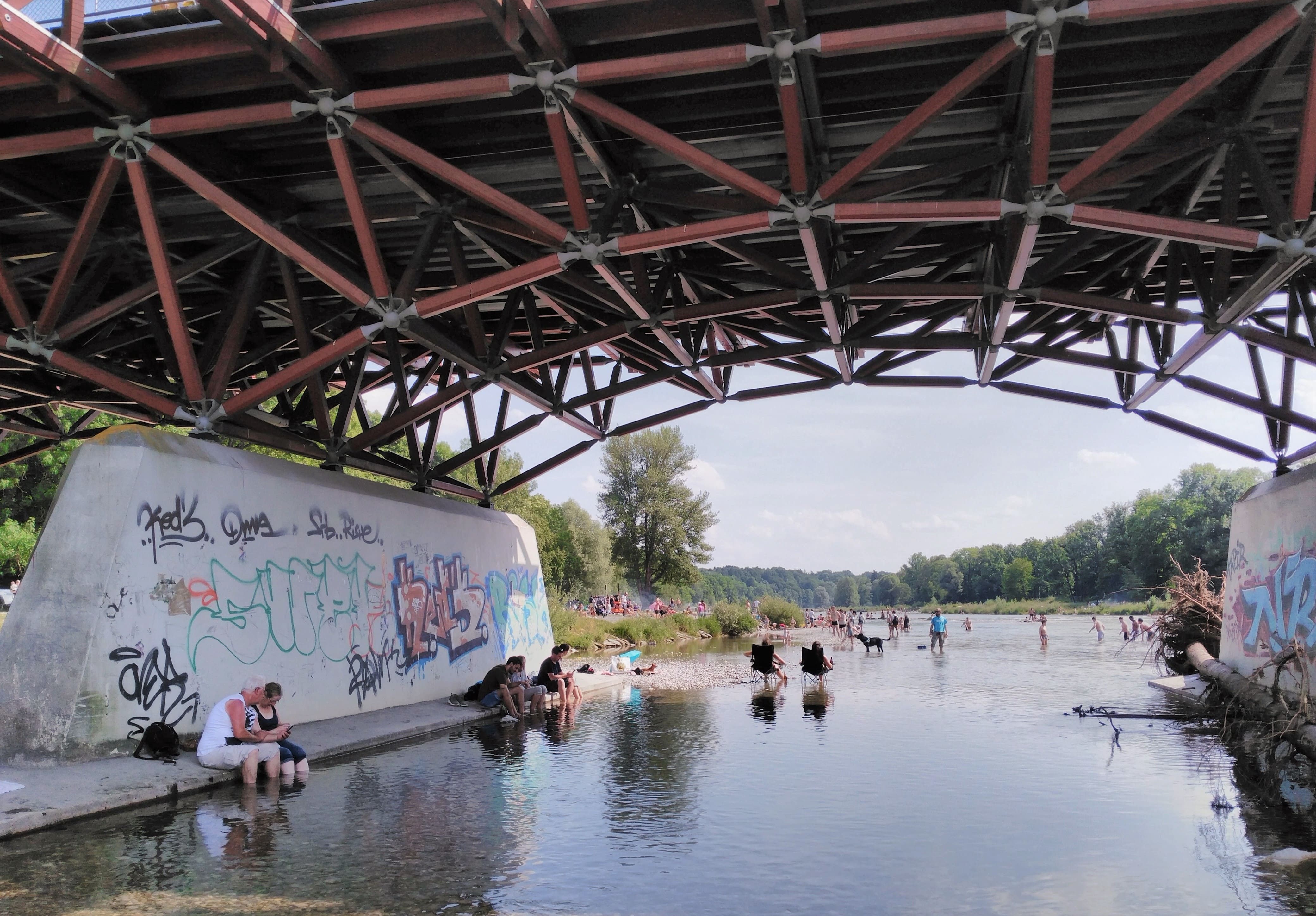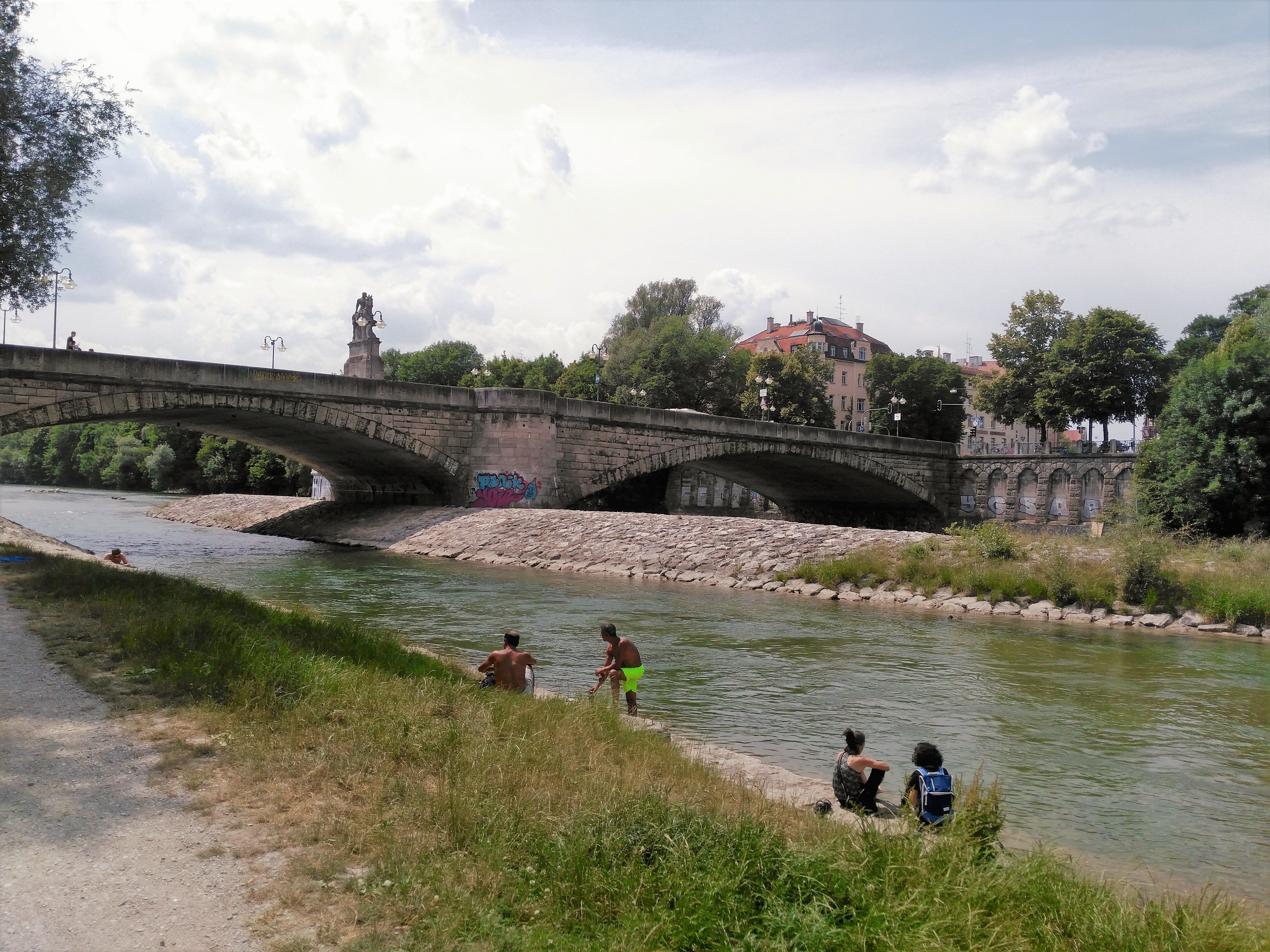 Its humid as well, and the heat of the day is difficult to bear. The best thing to do when the weather is like this is to seek water, and luckily the Isar river flows through the middle of the city. Its a great place to relax and cool down in the refreshing, cold + clear water.