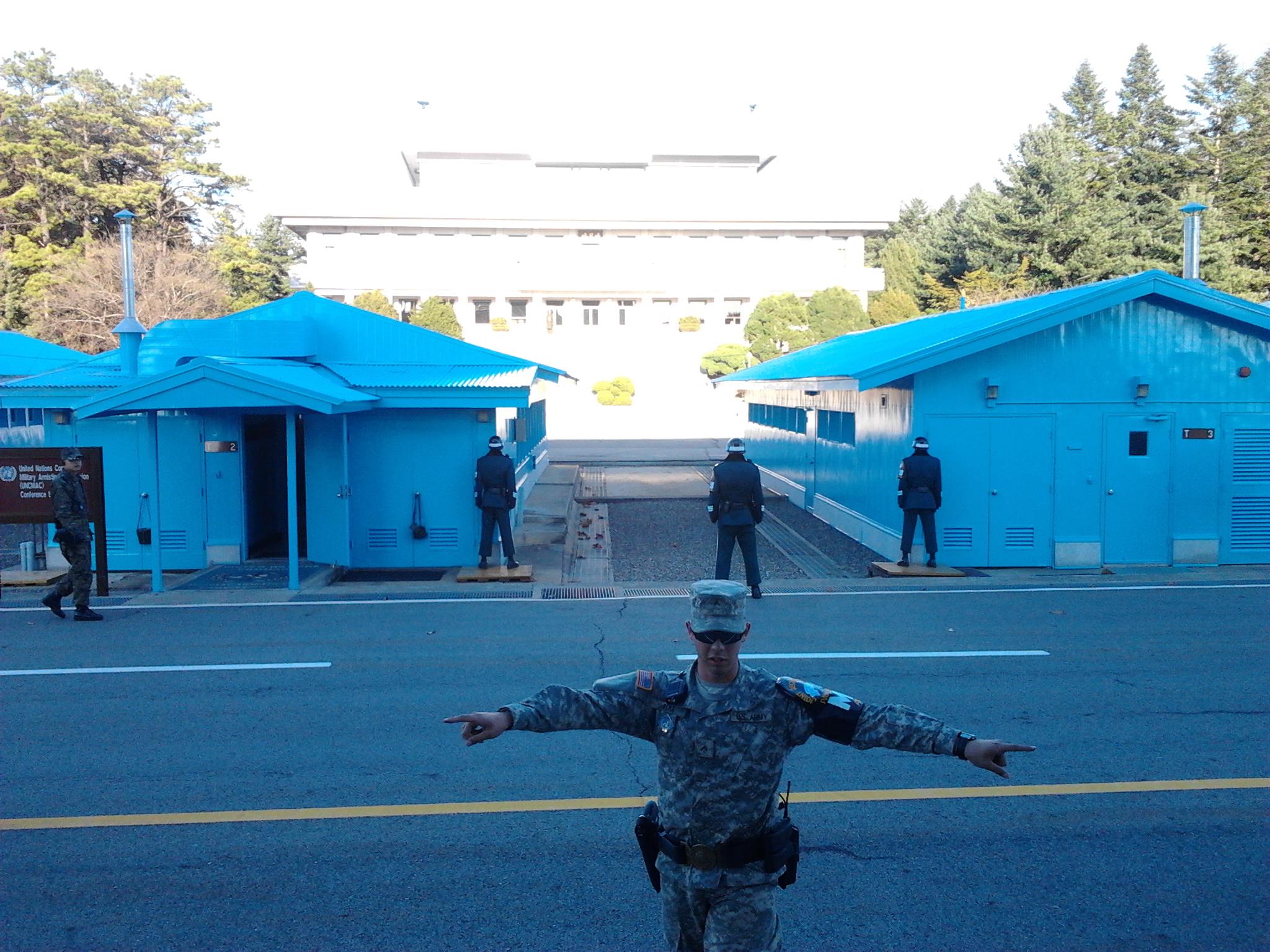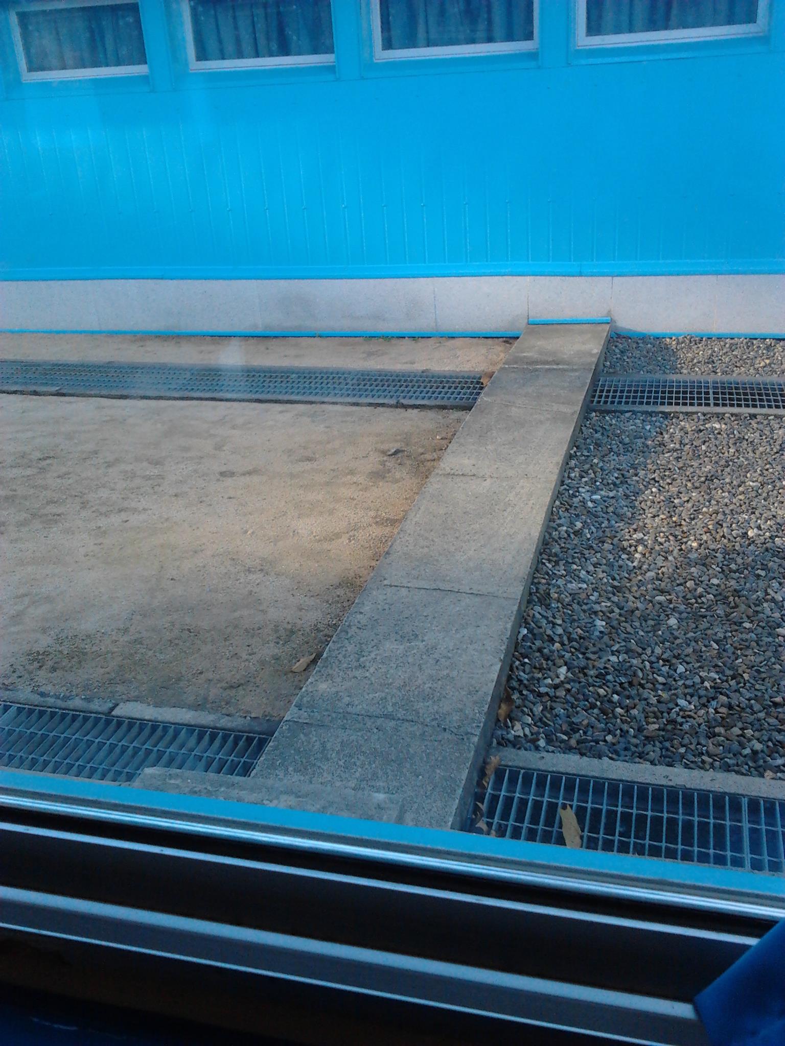 A picture of the dividing line at the DMZ between North and South Korea. I was told not to take a picture of any guards (1 meter on each side) so this is the best I could do.