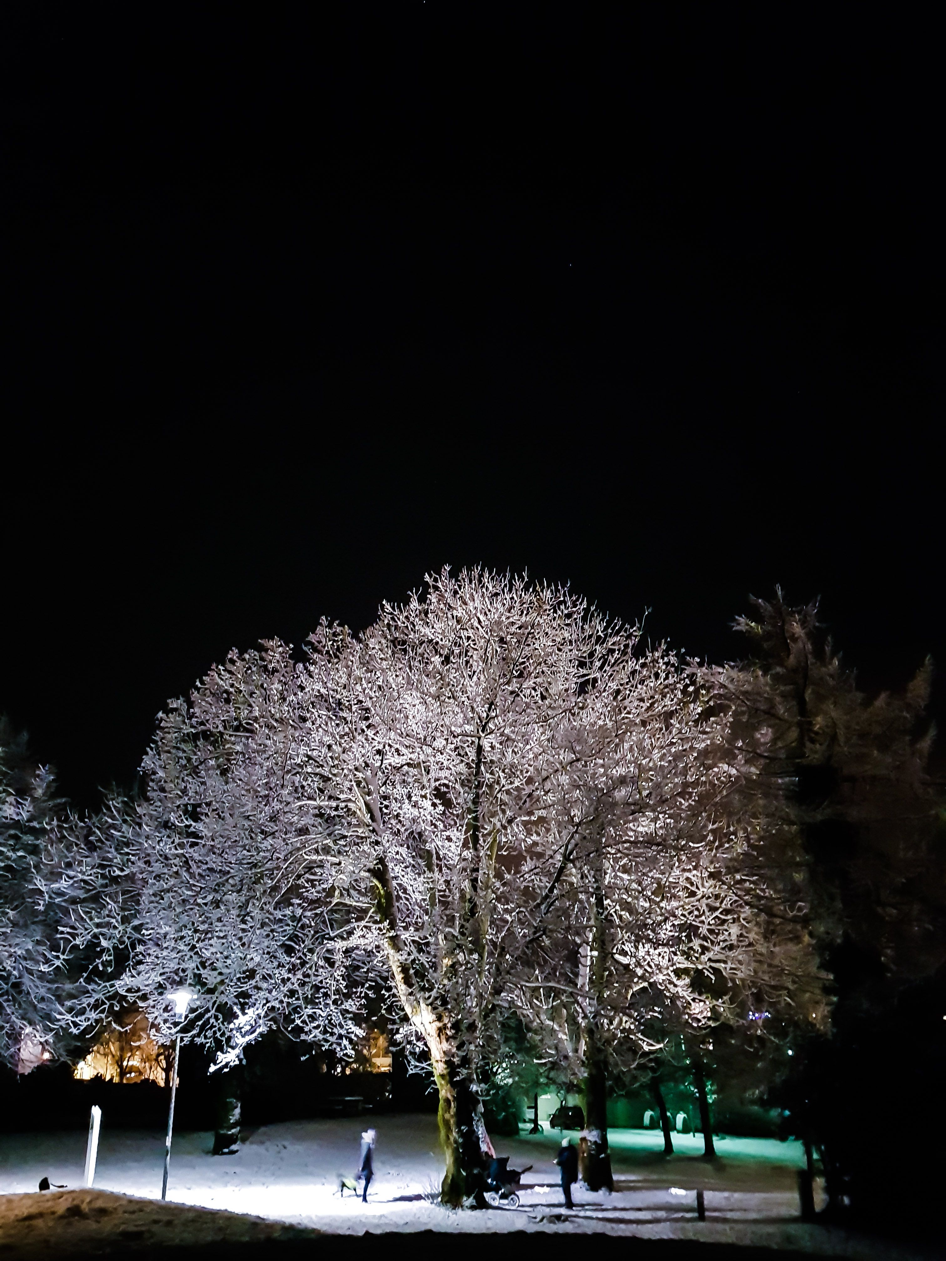 Standing in the darkness looking down towards the path the snow covered trees light up by the different colored streetlights.