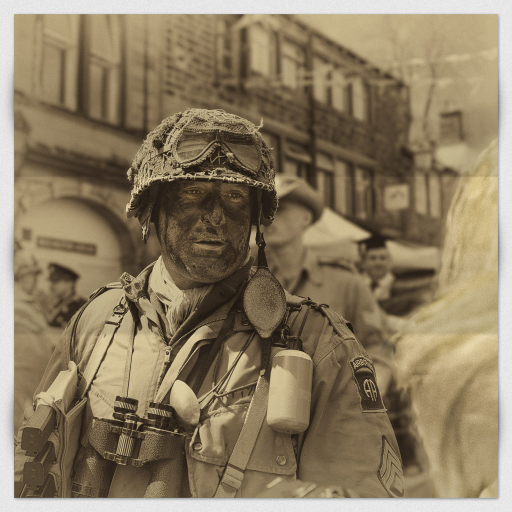 This final image was taken one sunny Saturday afternoon in Haworth a few years ago, at a World War II celebration festival. It was processed to sepia then aged appropriately using various effects. Unfortunately there is an rather ugly effect on the right of the image caused by trying to remove somebody that dated the photo inappropriately, but it gives you an idea of the results you can achieve with the technique.