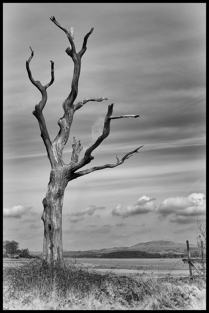 The following photography of a tree had a very distinct bark texture, but it was lost against the sky. Converting to black and white and increasing the tonal contrast in the image re-produced what attracted me about the scene in the first place.